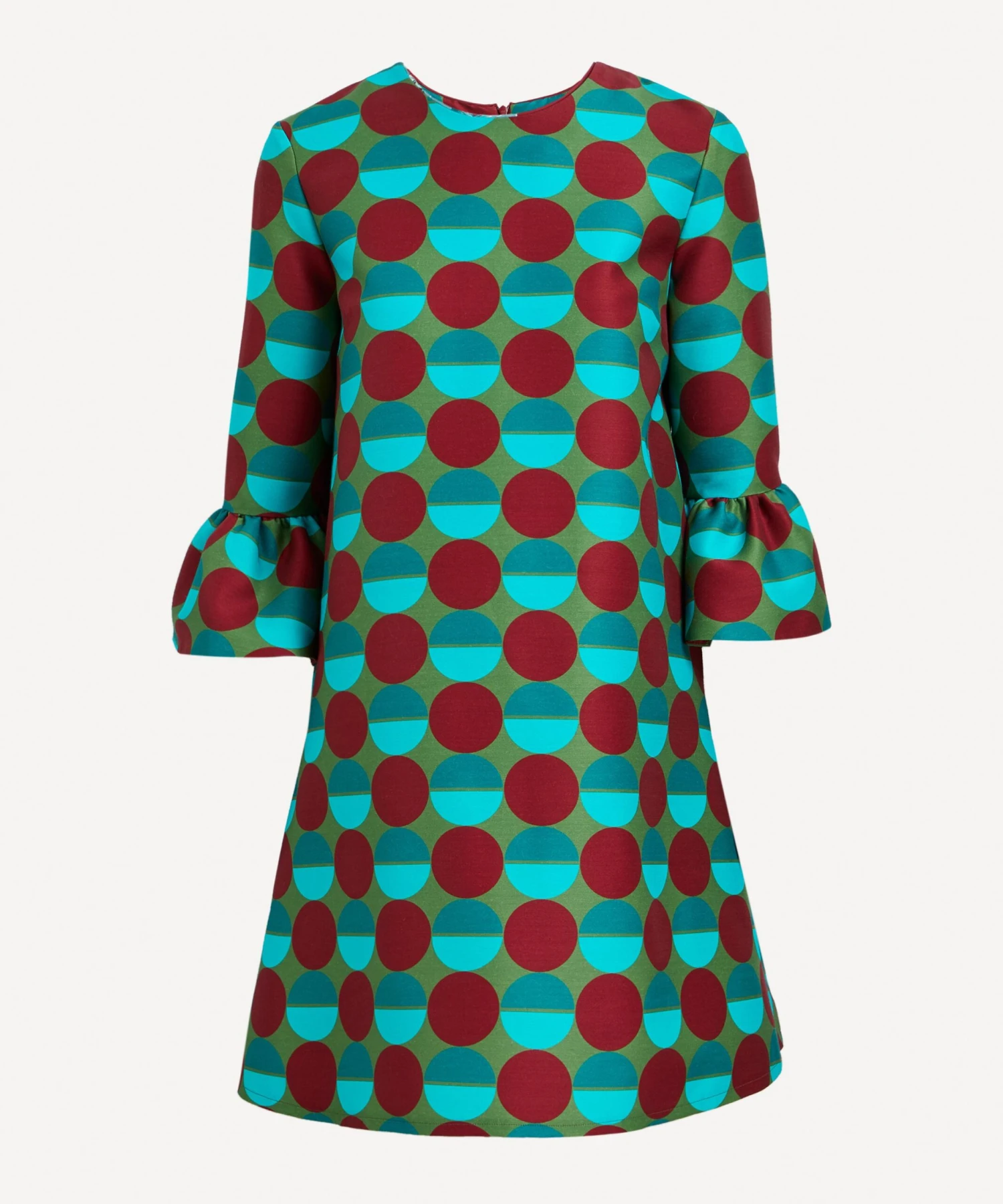 Designed to be worn for any occasion at any time of the year, Italian label La DoubleJ presents the 24/7 dress. Vibrant and voluminous with its abstract semi-circle pattern, this cotton-stretch mini-dress is cut for a loose fit with bell-sleeves and gathered kick pleats at the rear for a playfully fun finish.