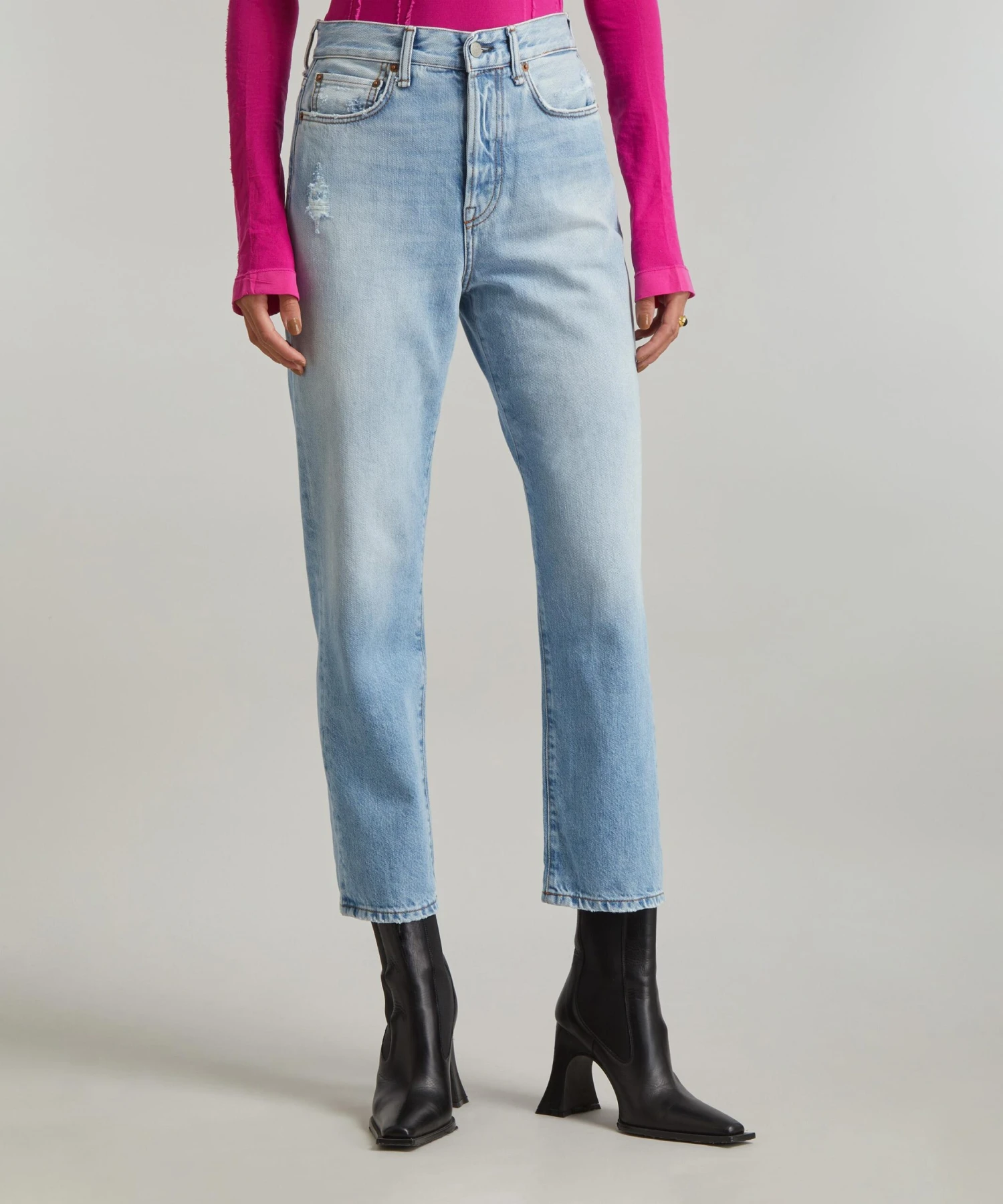 Acne Studios applies its androgynous, cool-kid approach to an everyday essential with these classic, light-blue regular-fit jeans. Crafted from rigid cotton denim with a high-waist and straight-leg that crops above the ankle, its Mece Light Blue Vintage wash and distressed detailing gives them an authentic retro edge.