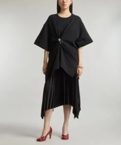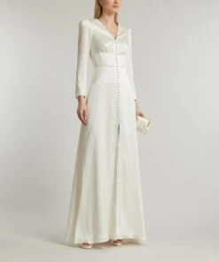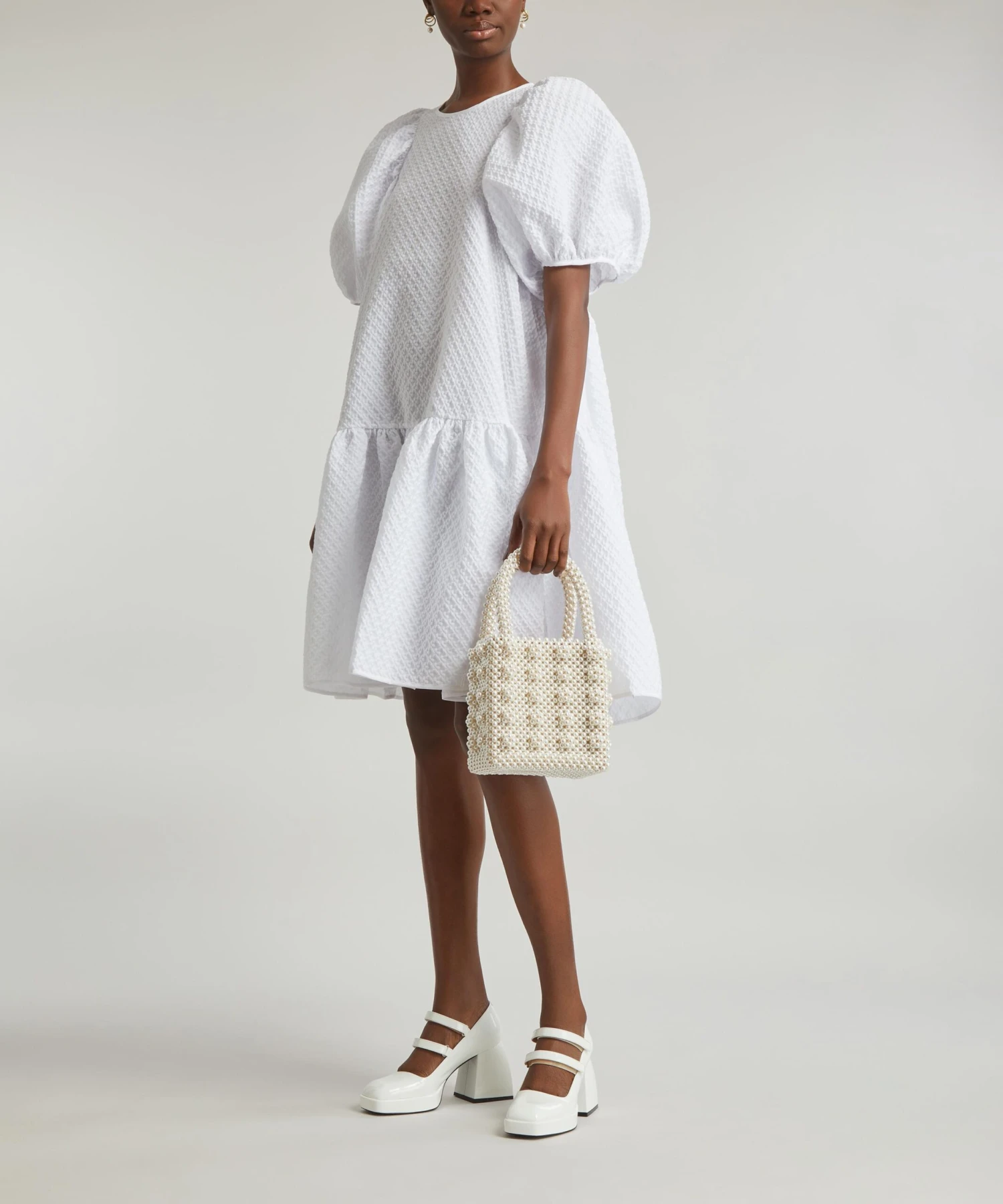 The Alexa dress from Cecilie Bahnsen embodies the designer’s alluring aesthetic for whimsical silhouettes with a sculptural edge. A studied take on feminine volume with its puff-sleeves, raised skirt and gathered, peplum-hem, it’s crafted from blossom matelassé for a tactile finish.
