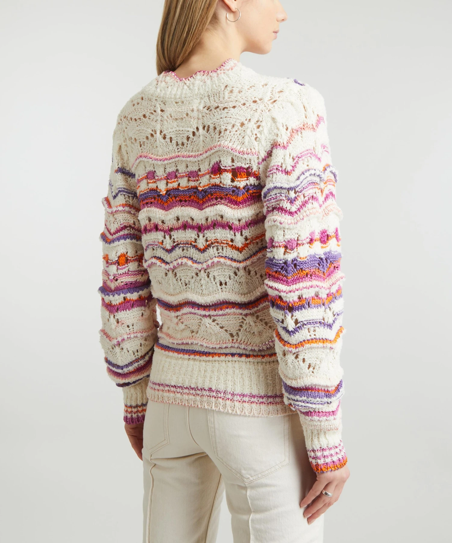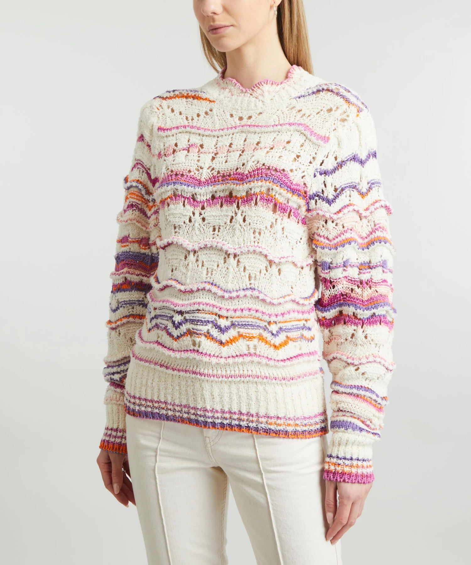 Elevate your new season knitwear edit with the Ambre Rainbow-Stripe jumper from Isabel Marant Étoile. Featuring an intricate, pointelle-stitched striped pattern throughout, it’s crafted from cotton for a relaxed fit with slouchy long-sleeves, chunky ribbed trims and a scalloped collar.