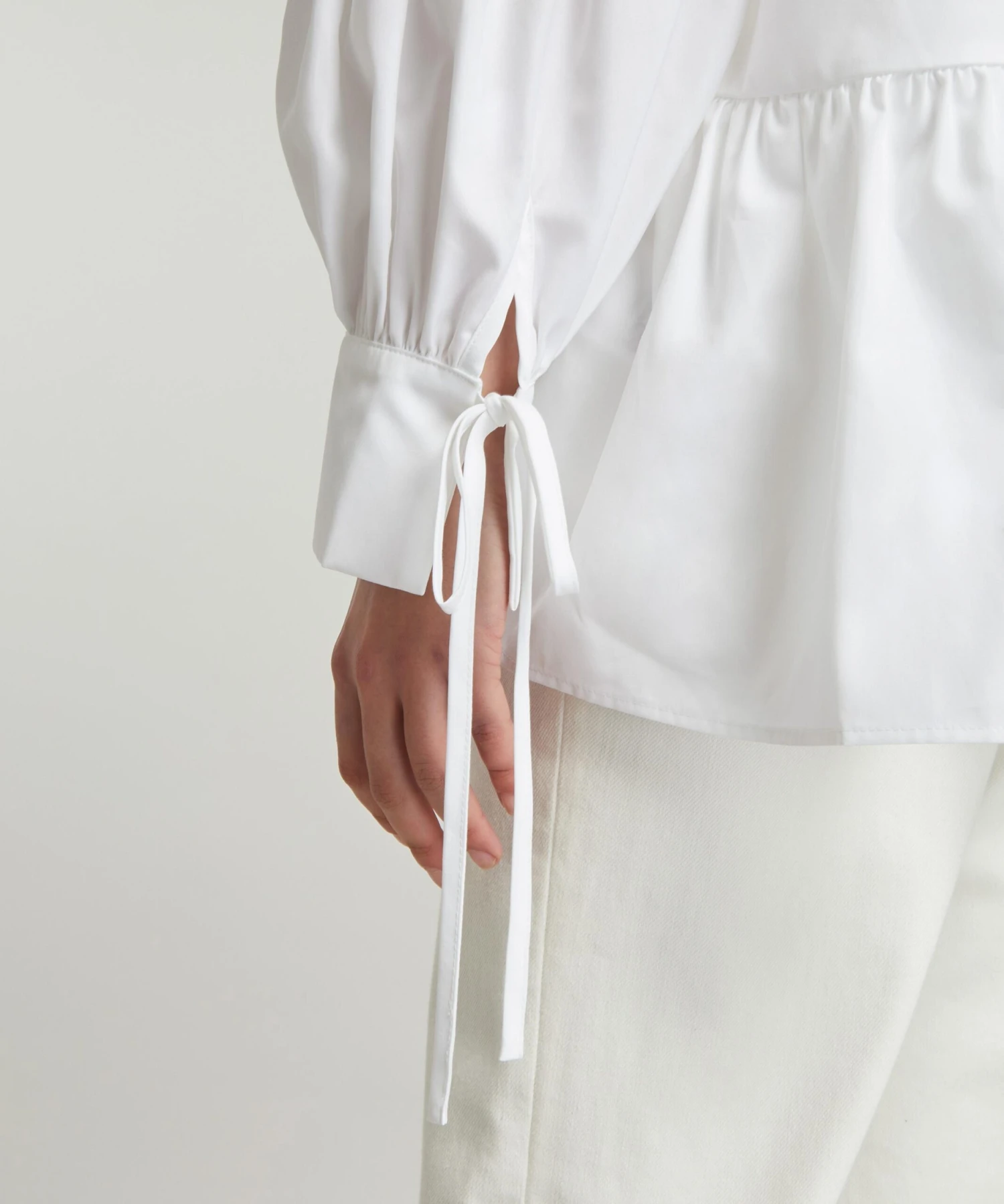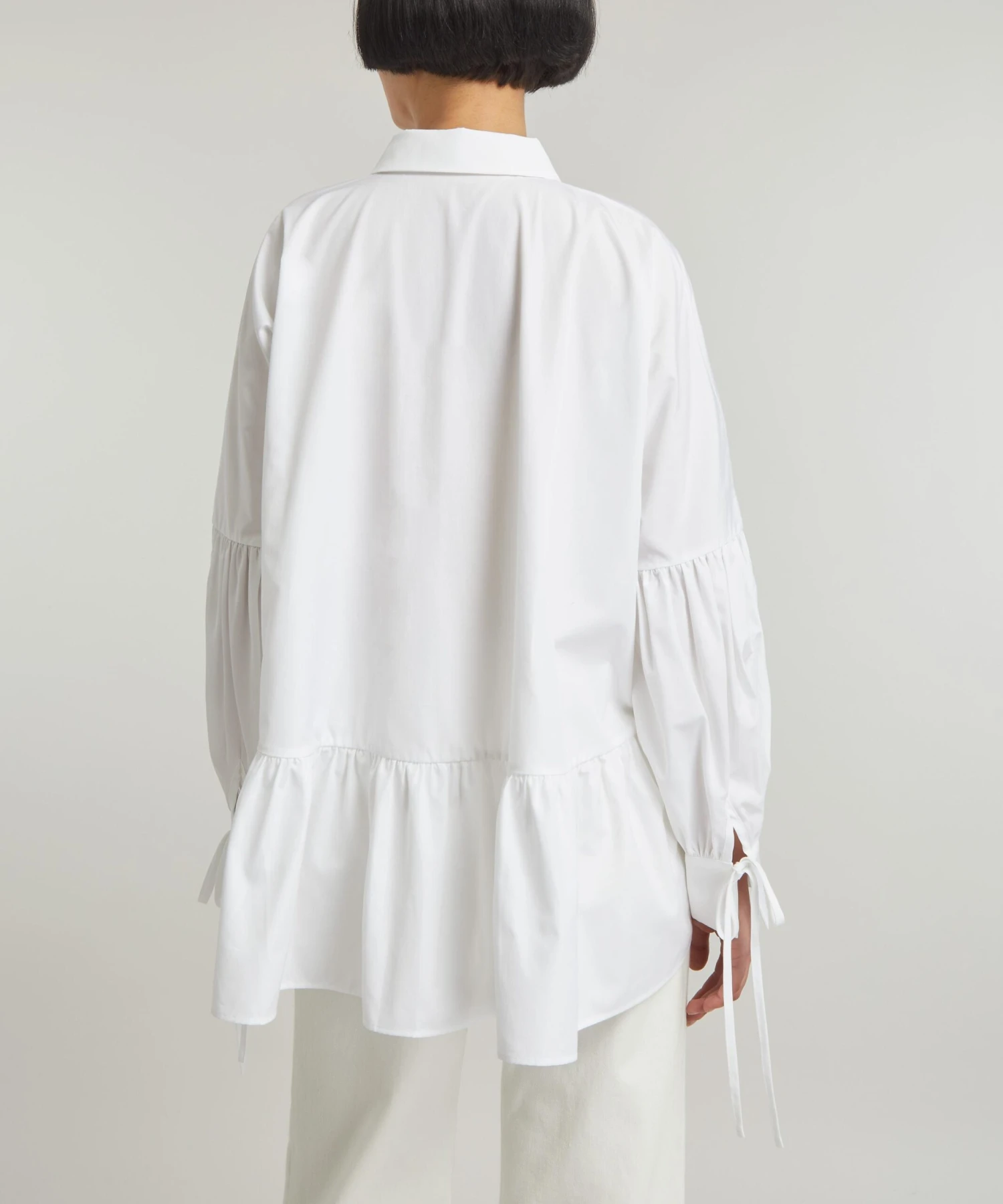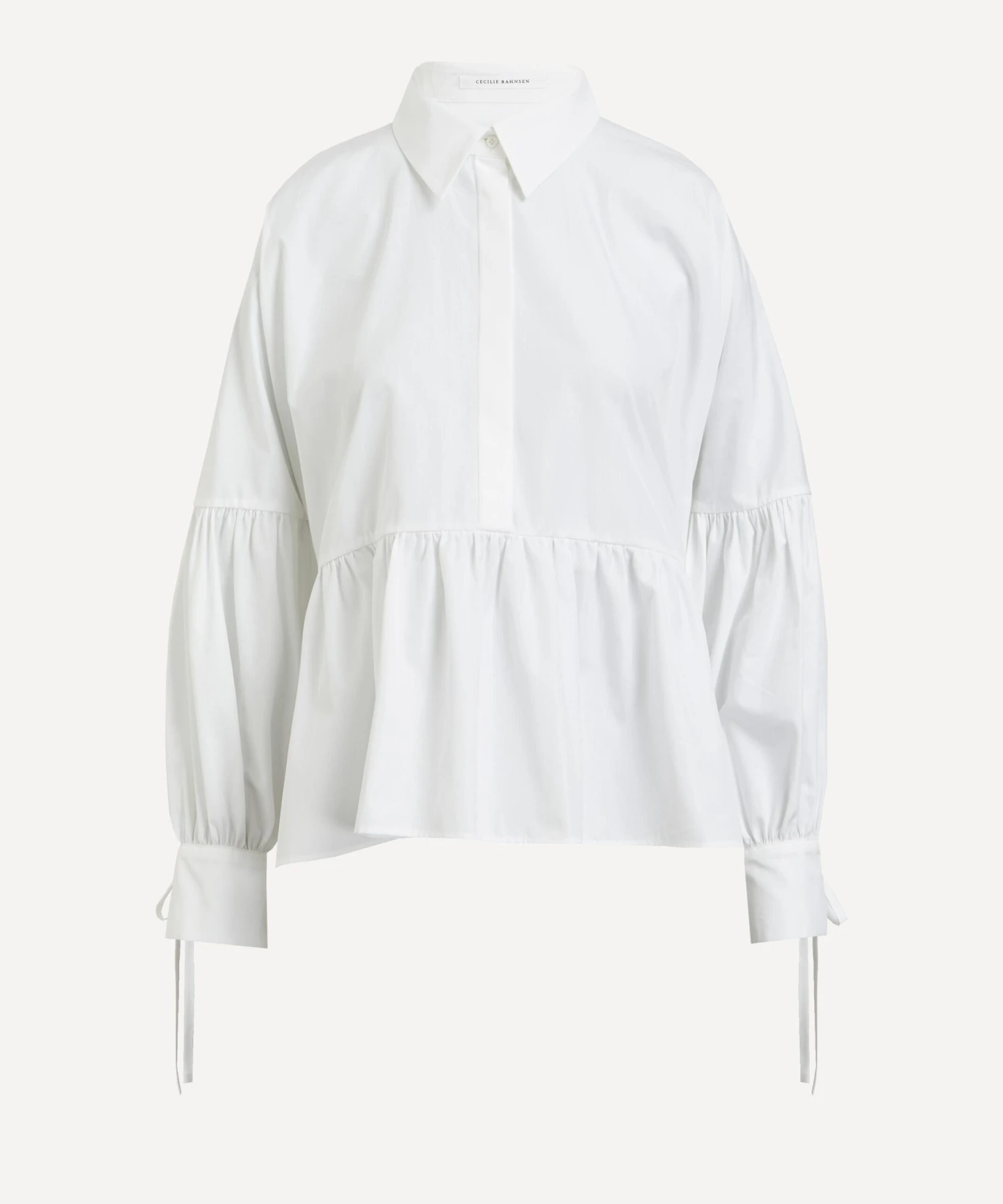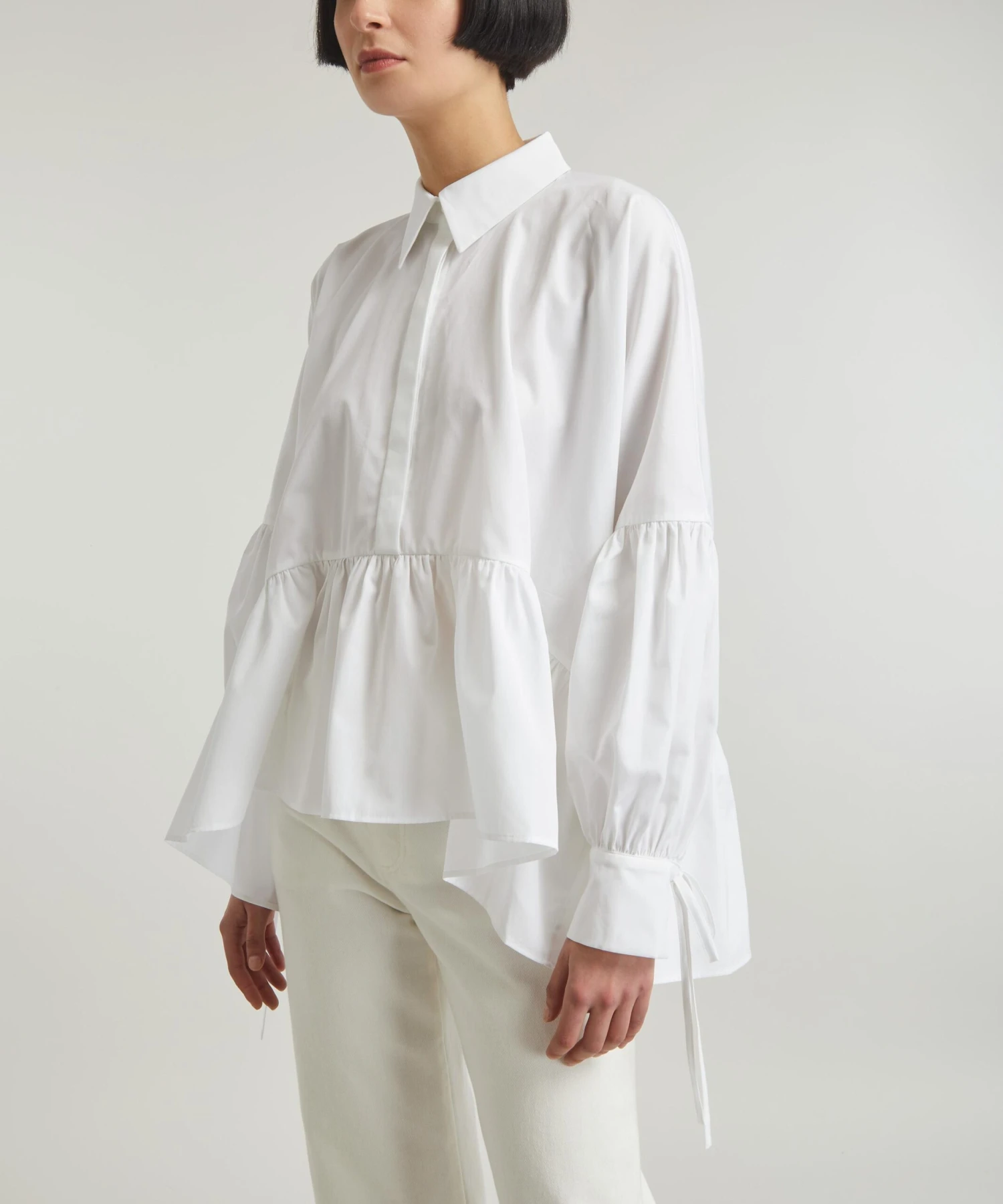 The Andrea shirt from Cecilie Bahnsen embodies the designer’s alluring aesthetic for whimsical silhouettes with a sculptural edge. A contemporary take on classical shirting, it’s cut from cotton for a voluminous silhouette featuring an asymmetric peplum-hem, dropped shoulders and loose, blouson-sleeves finished with fluttering bows at the wrist.