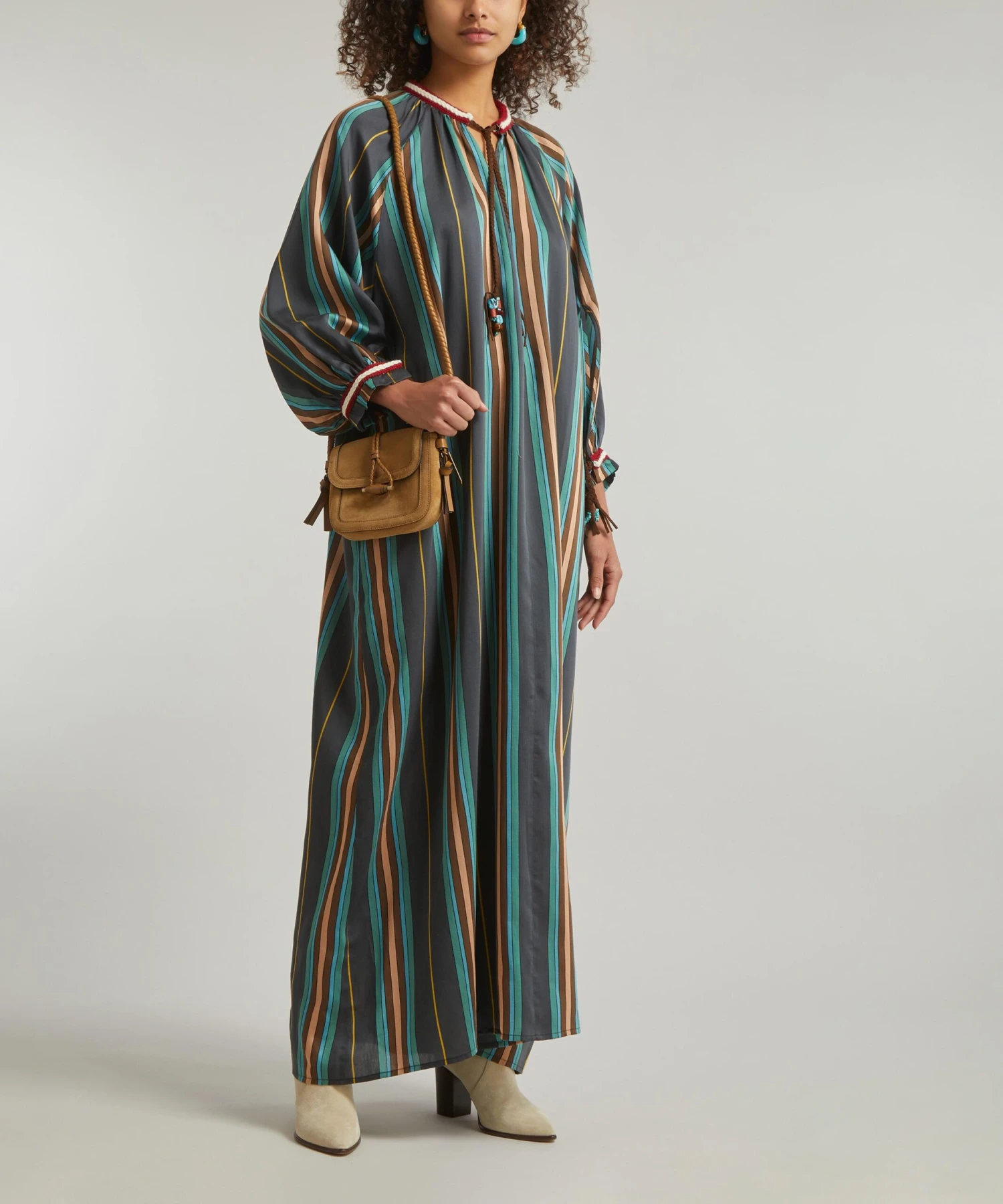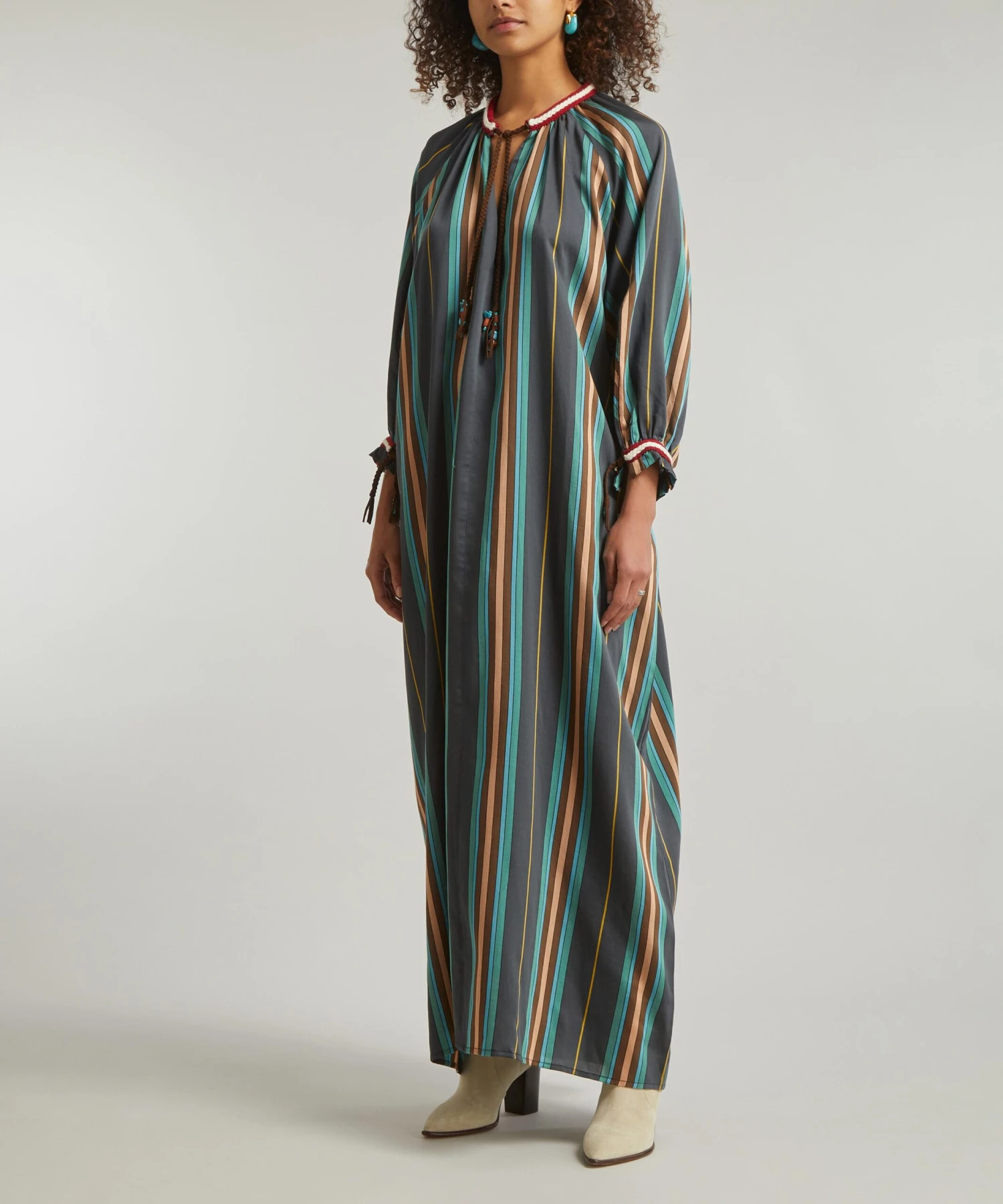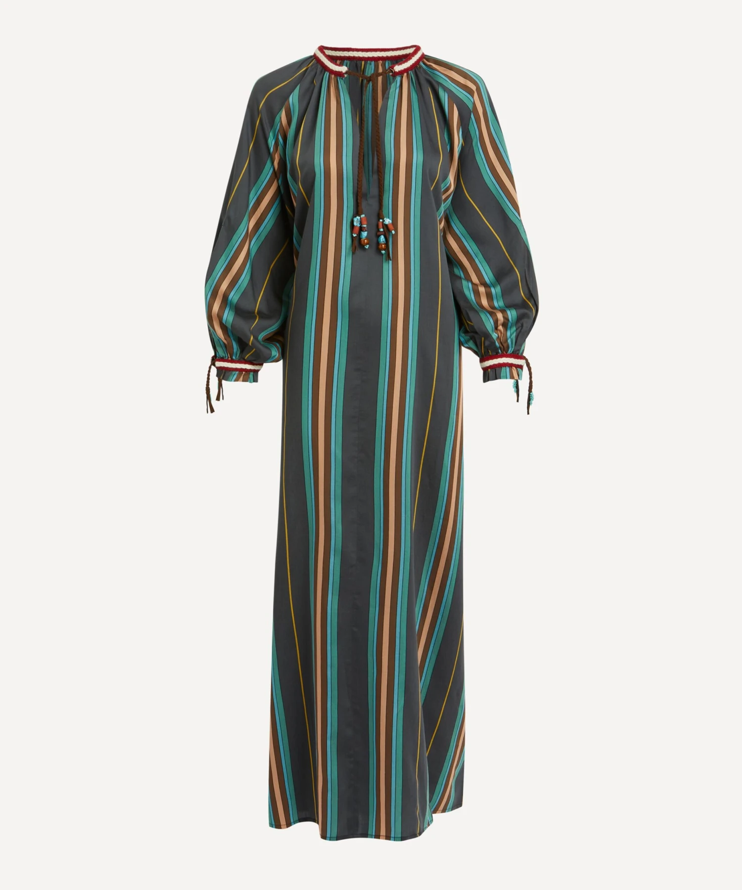 Lightweight and loose, this kaftan-style dress is crafted from a navy, green and brown cotton-blend striped fabric. A relaxed fit with billowy sleeves, it features braided, turquoise-embellished ties at the neckline and cuffs for a Mexican-inspired finish.