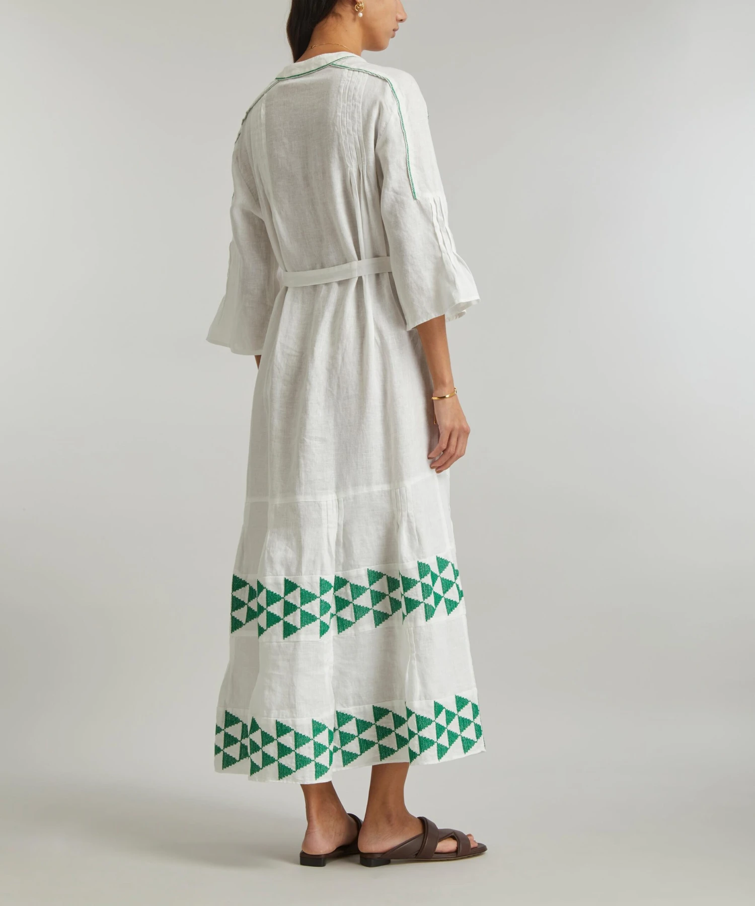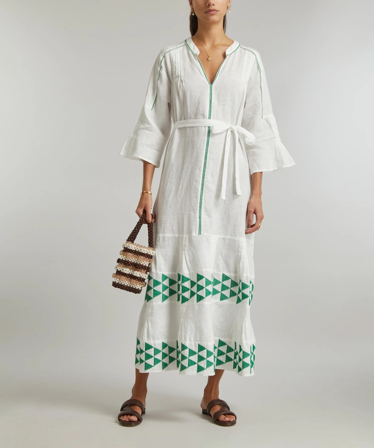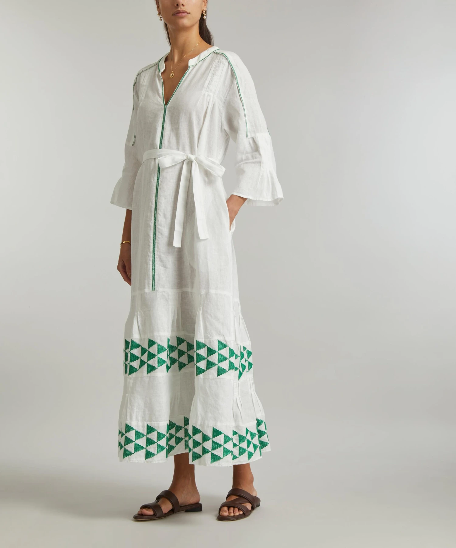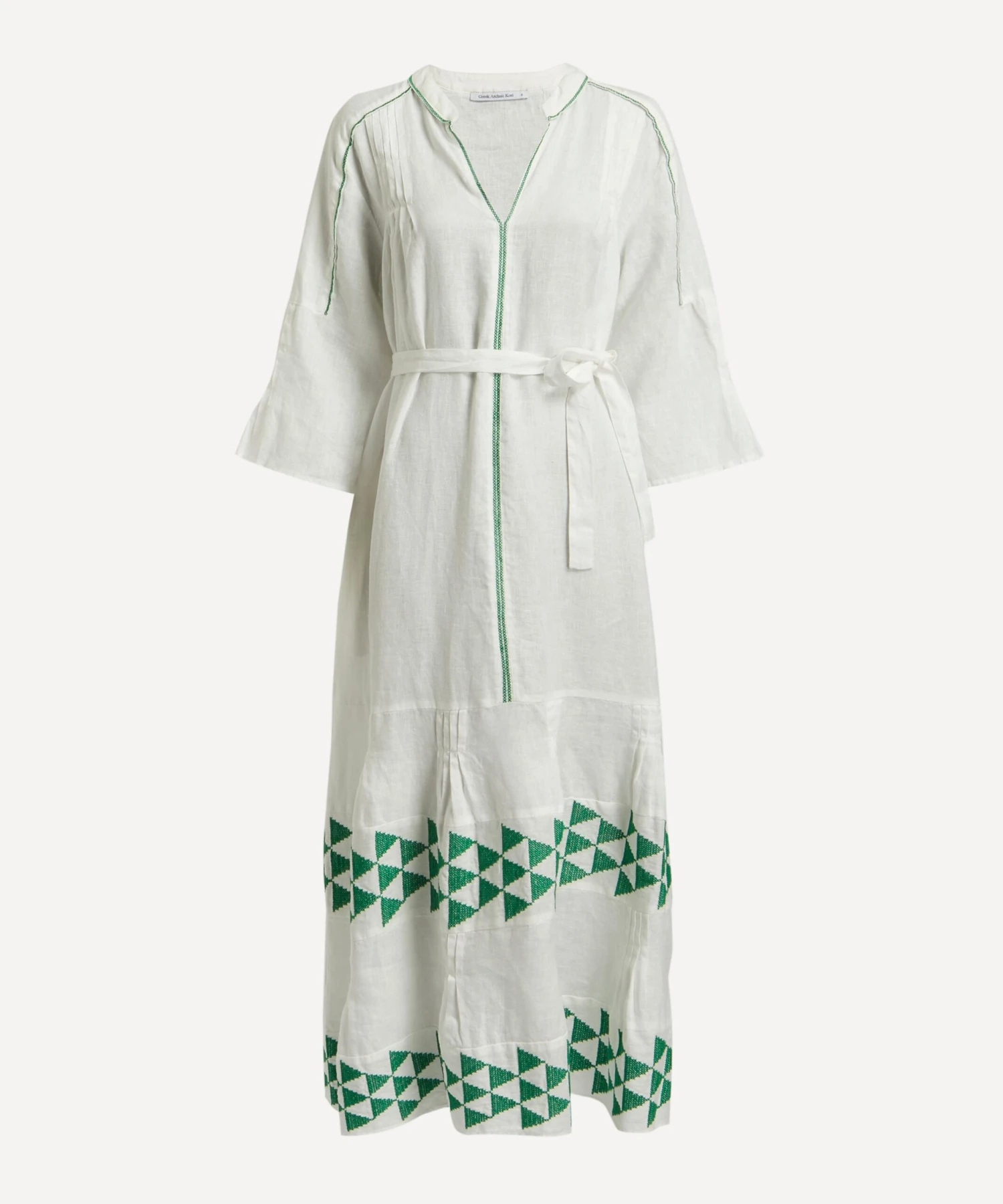 The Arrow Maxi-Dress from Athenian label Greek Archaic Kori brings a touch of the Mediterranean sun to your new-season edit. Lightweight and loose, it’s cut from pure linen and features an elegant V-neckline, long fluted-sleeves, an adjustable waist-belt and a tiered hem, complete with intricate green arrow embroidery throughout.