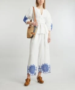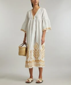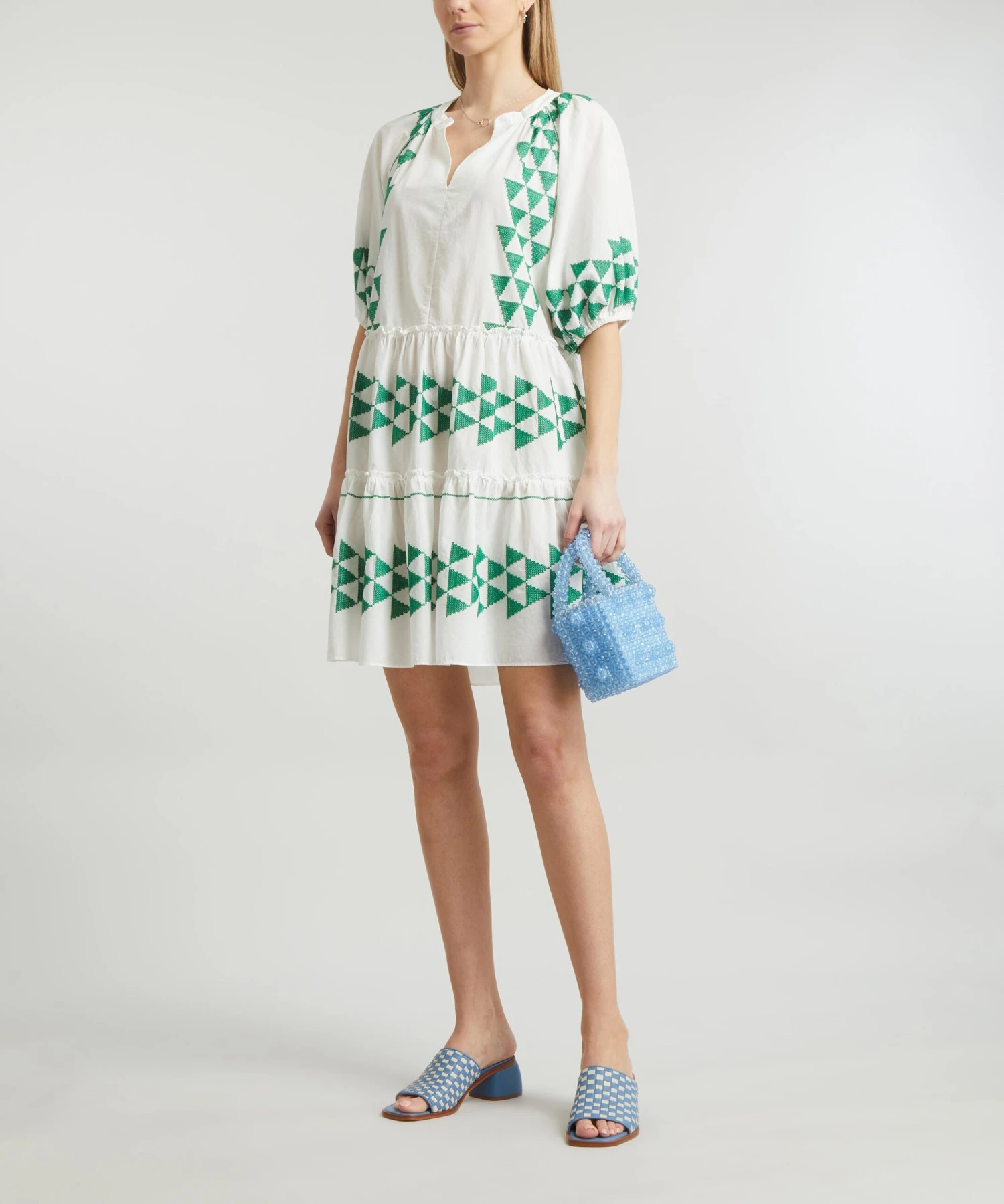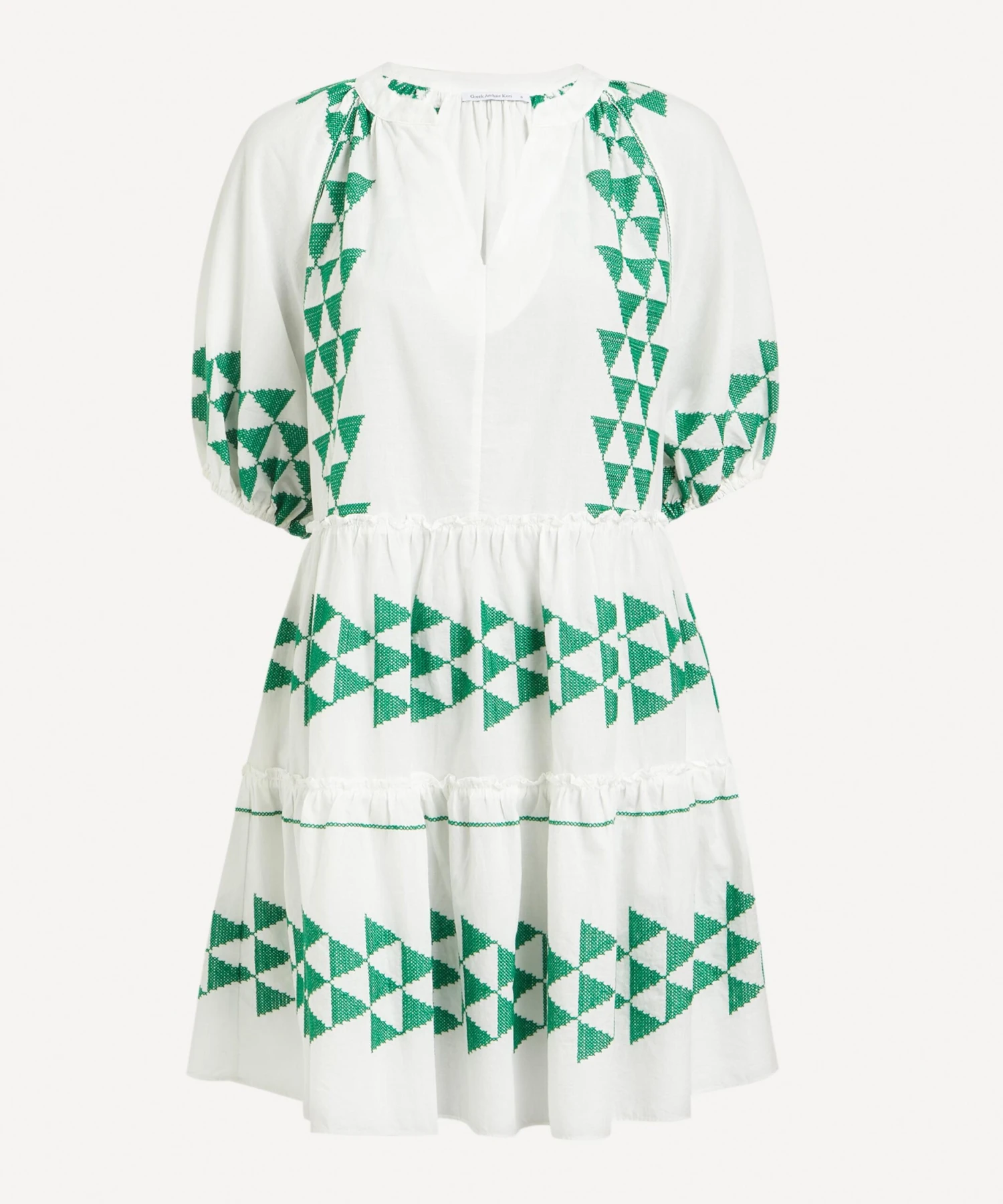 The Arrows Embroidered Short Dress from Athenian label Greek Archaic Kori brings a touch of the Mediterranean sun to your new-season edit. Lightweight and loose, it’s cut from pure linen and features an elegant open V-neckline, mid-length blouson sleeves and a natural waistline that falls to a tiered mini-skirt featuring intricate green arrow embroidery throughout.