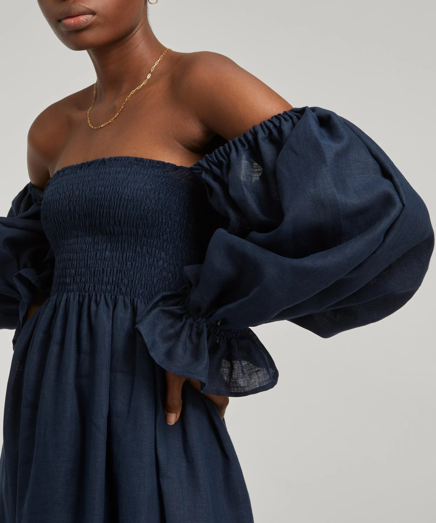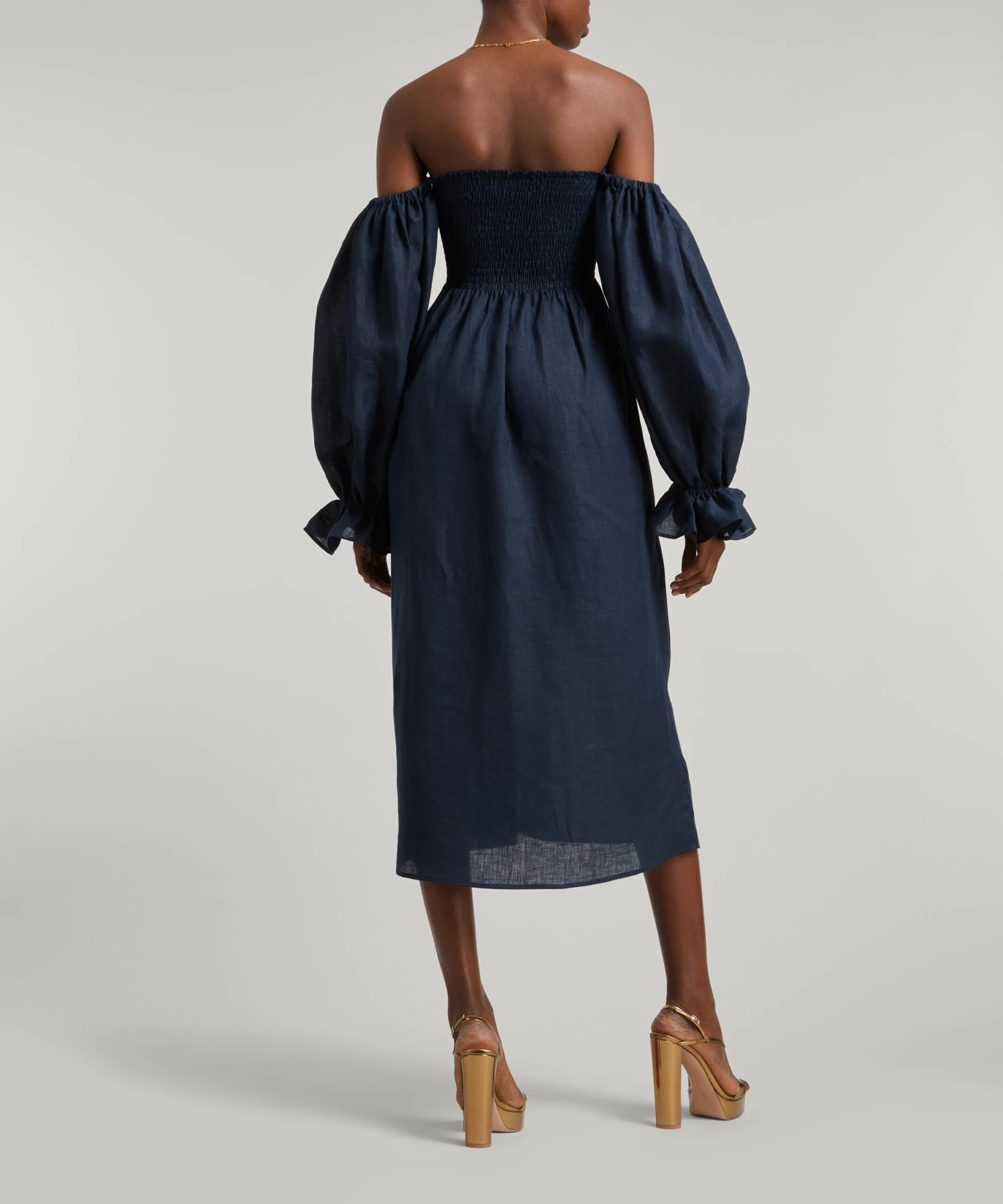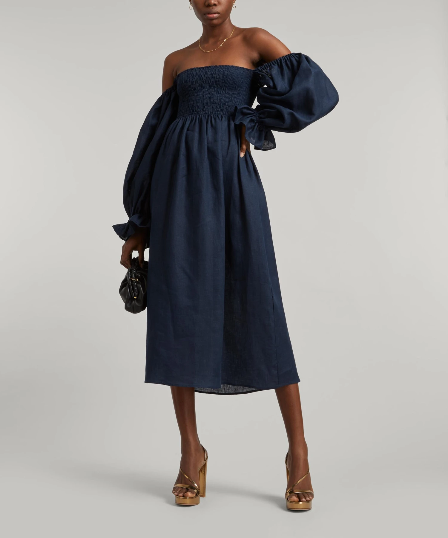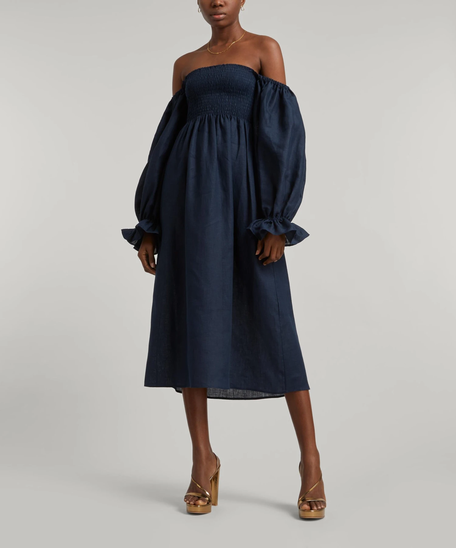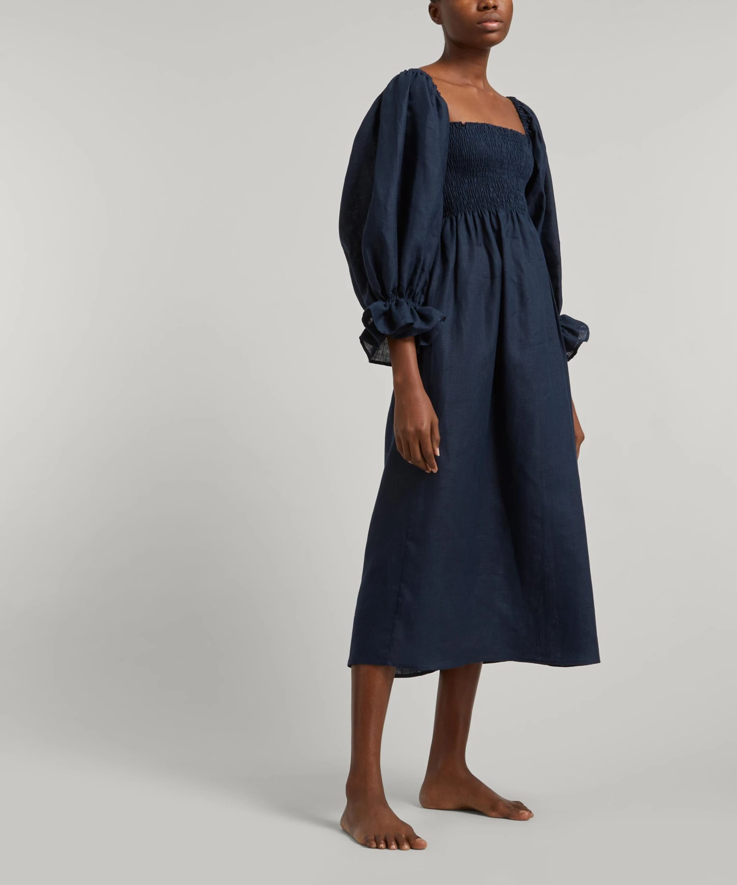 Crafted from ethically sourced linen printed all-over with daisies, this joyful gown has dramatic puff-sleeves that can be worn on or off the shoulders. The smocked bodice and ruffled cuffs reference detailing found on vintage pieces – pair it with minimal gold jewellery for an elegant look.