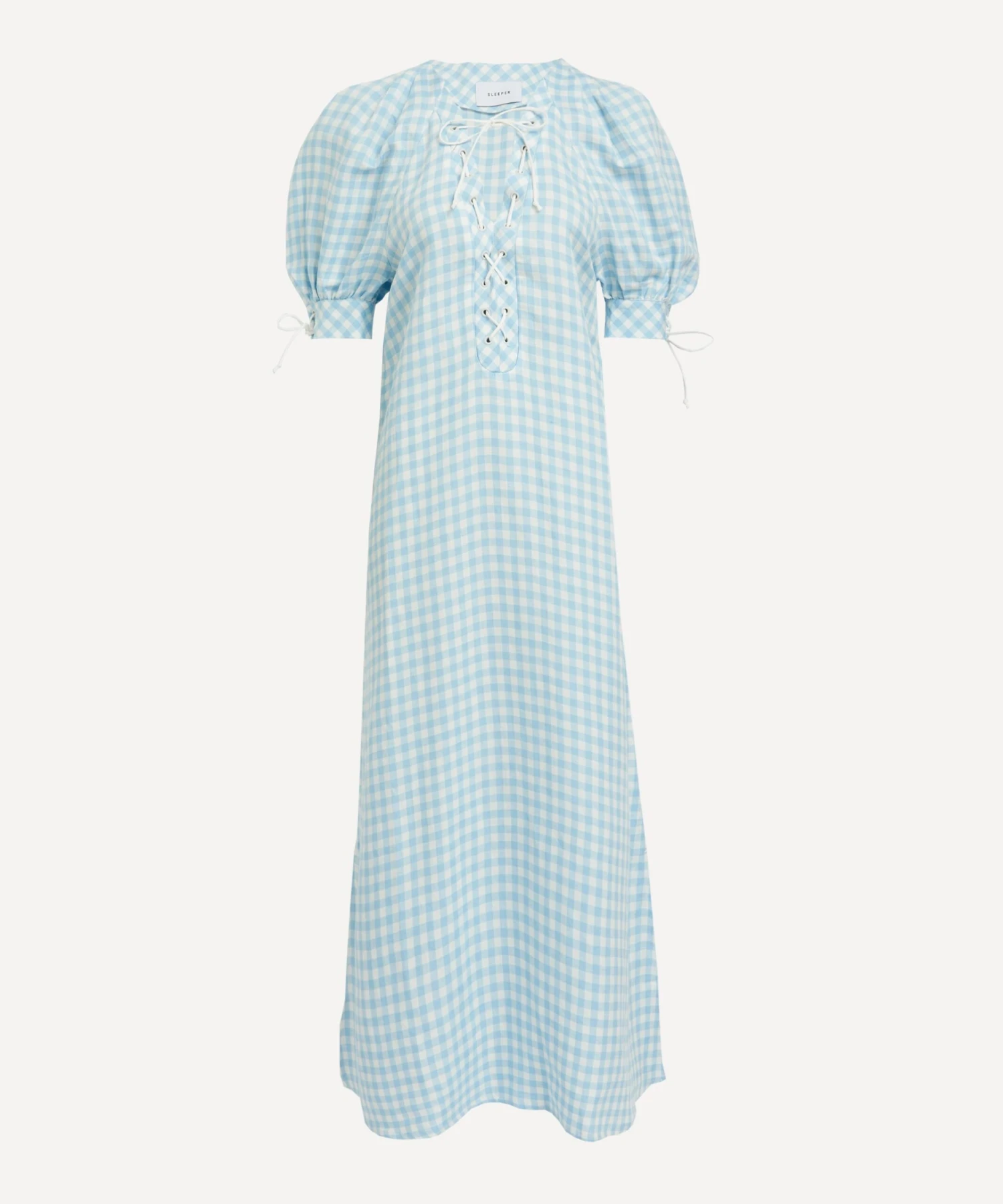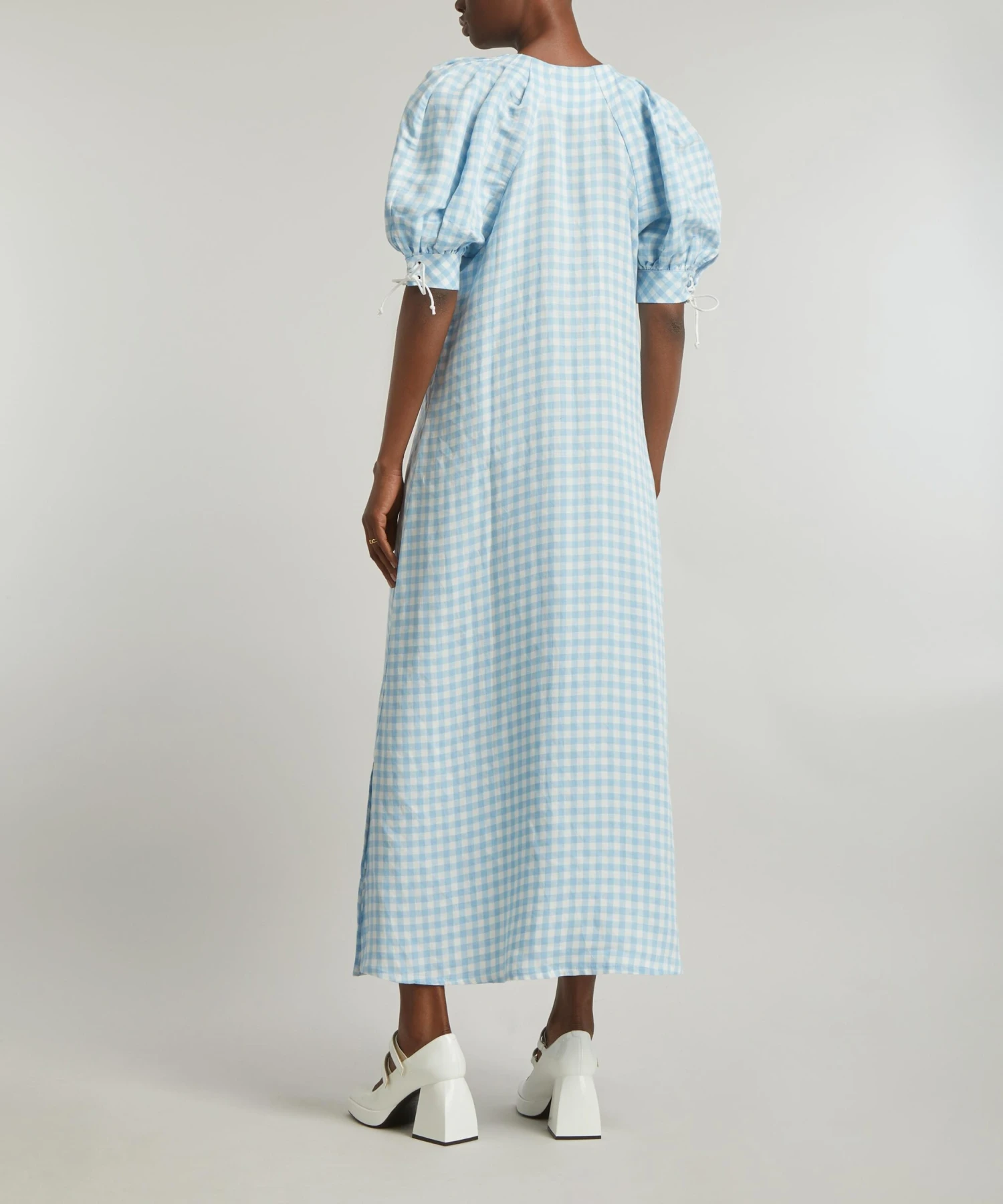 Crafted from a linen-blend fabric for a lightweight and loose silhouette, this billowing blue gingham maxi-dress has voluminous lantern sleeves, compete with lace-up detailing along its V-neckline and cuffs.