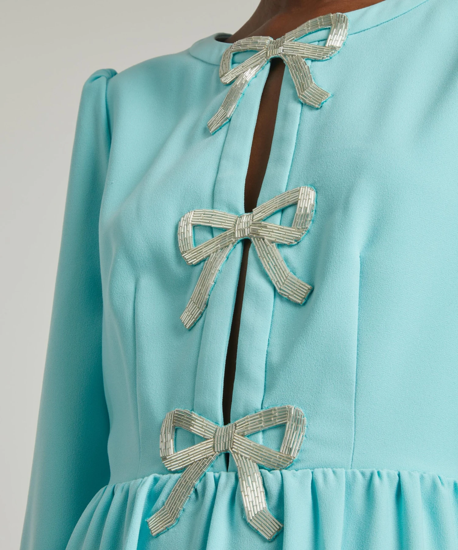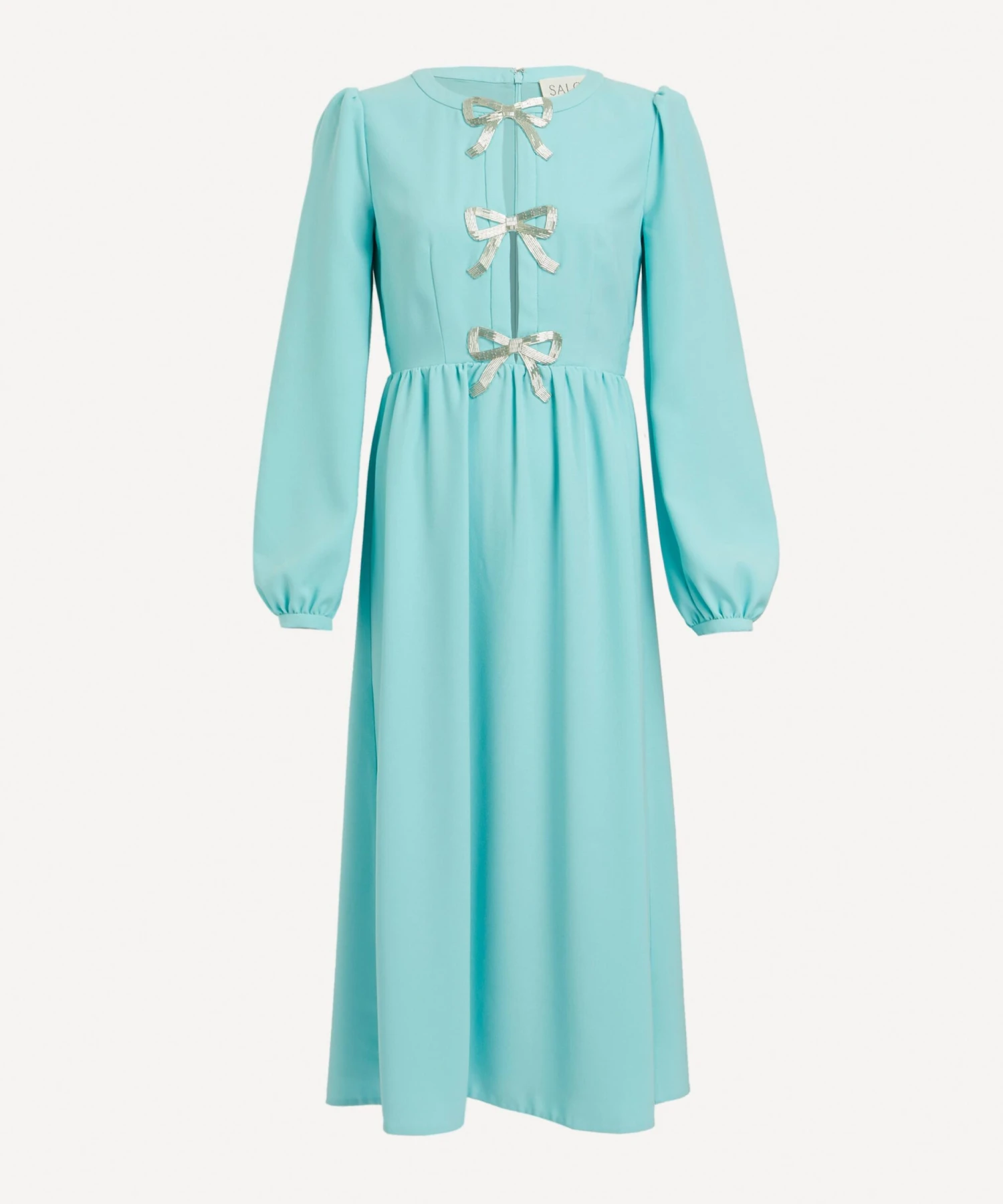 Oozing with opulence, Saloni’s signature Camille dress is an effortlessly demure addition to your evening edit. Designed for a flattering, vintage-inspired, A-line silhouette with elegant bouffant sleeves and gathered cuffs, its alluring split neckline is adorned with three crystal-embellished bows for a dazzling finish.