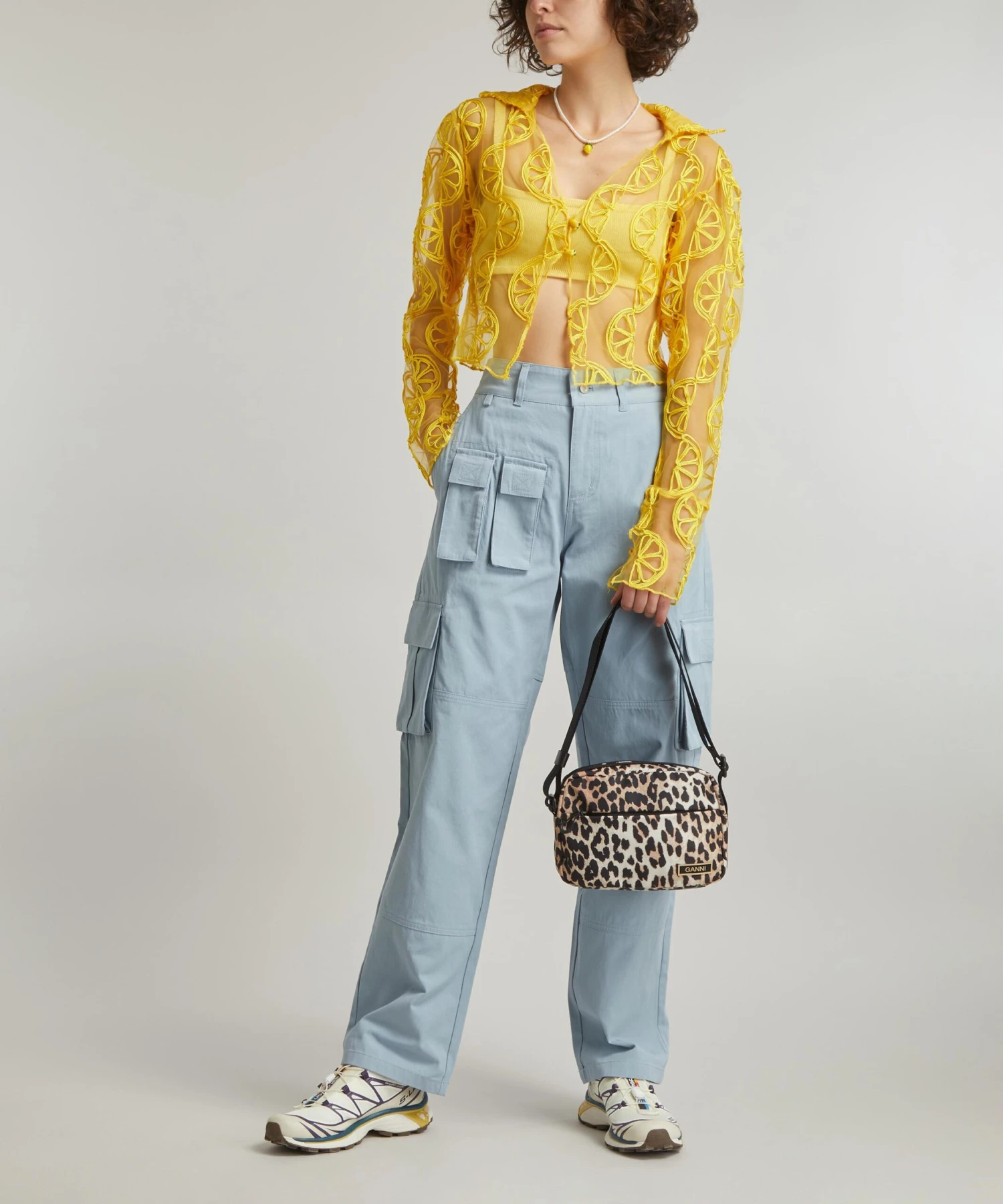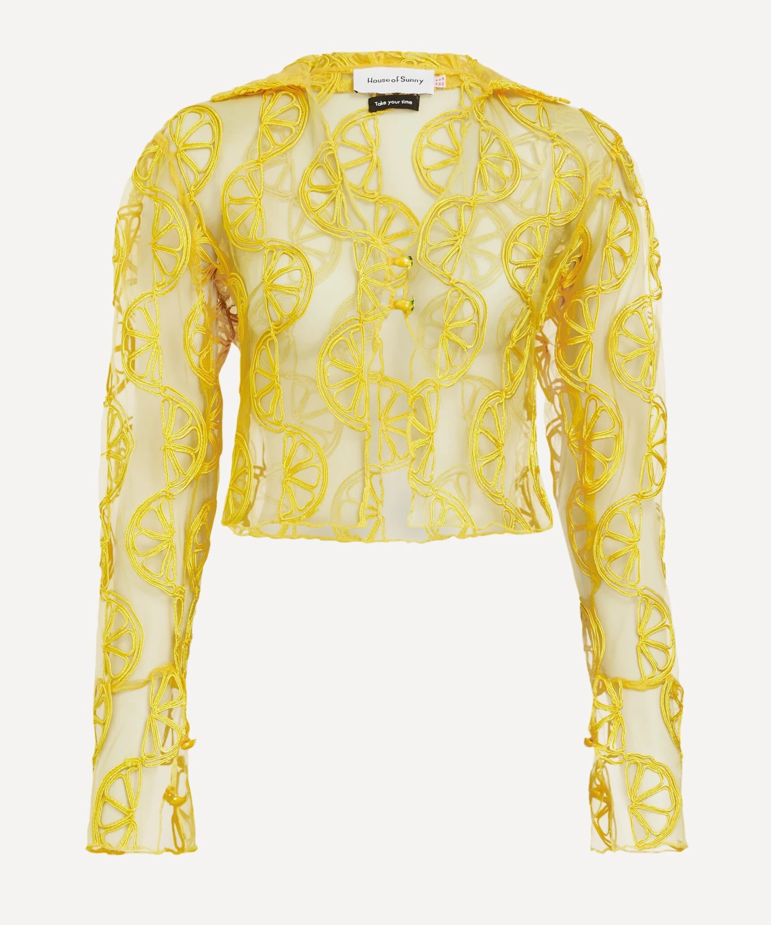 Intricately adorned all-over with custom appliqué lemon detailing, this cropped, long-sleeve sheer shirt features a classic collar and an open front, complete with a two, twee lemon buttons.