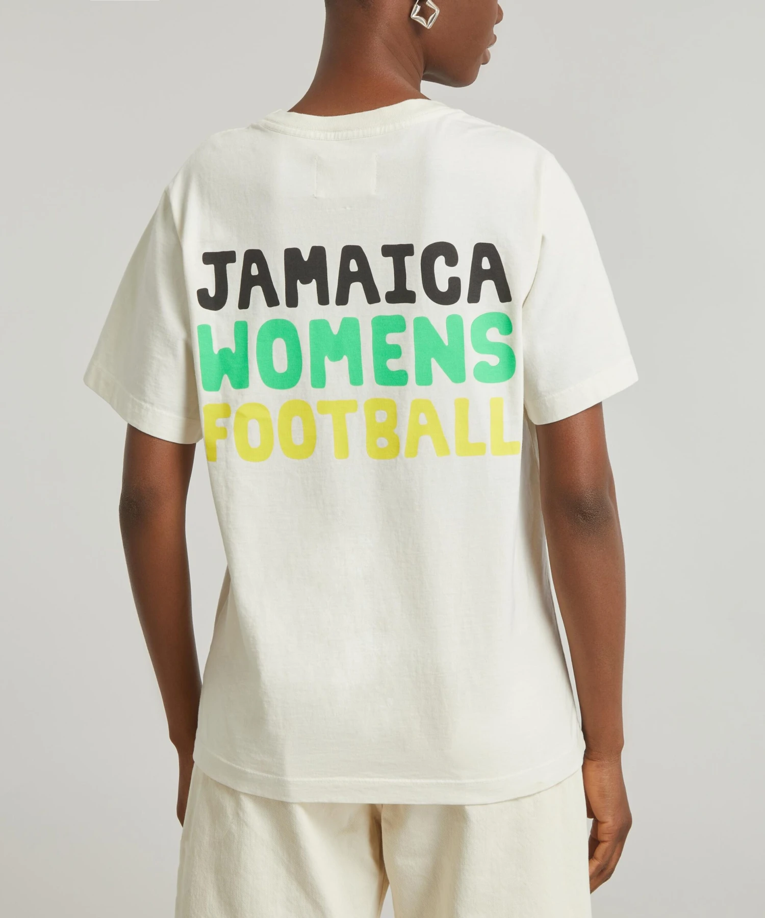 Designed in collaboration with artist duo the Haas Brother and art director Brian Roettinger, this cream crew-neck top has short sleeves and is emblazoned with a zingy black, green and yellow ‘Reggae Girlz’ graphic at the chest, and ‘Jamaica Women’s Football’ printed on the back.