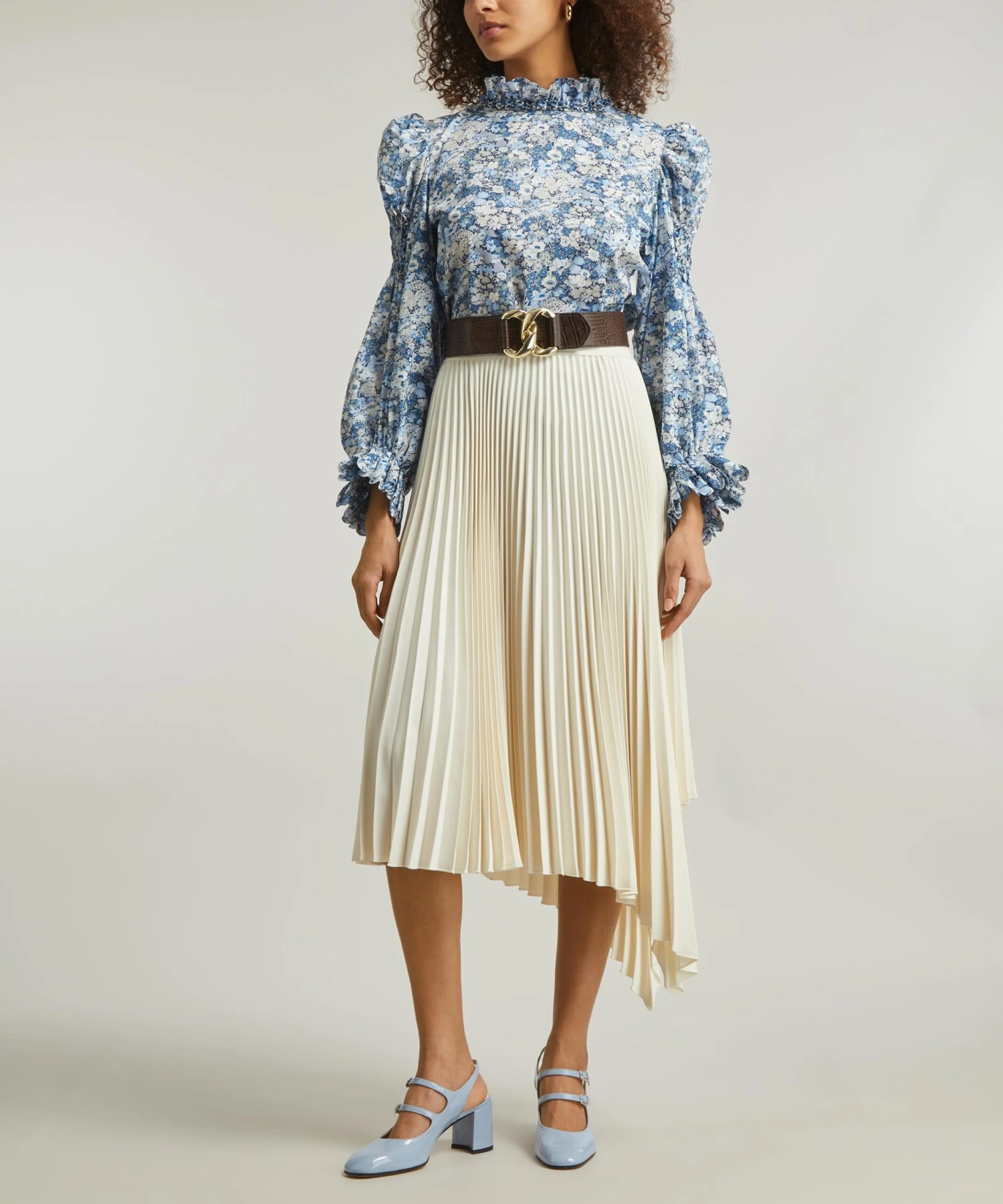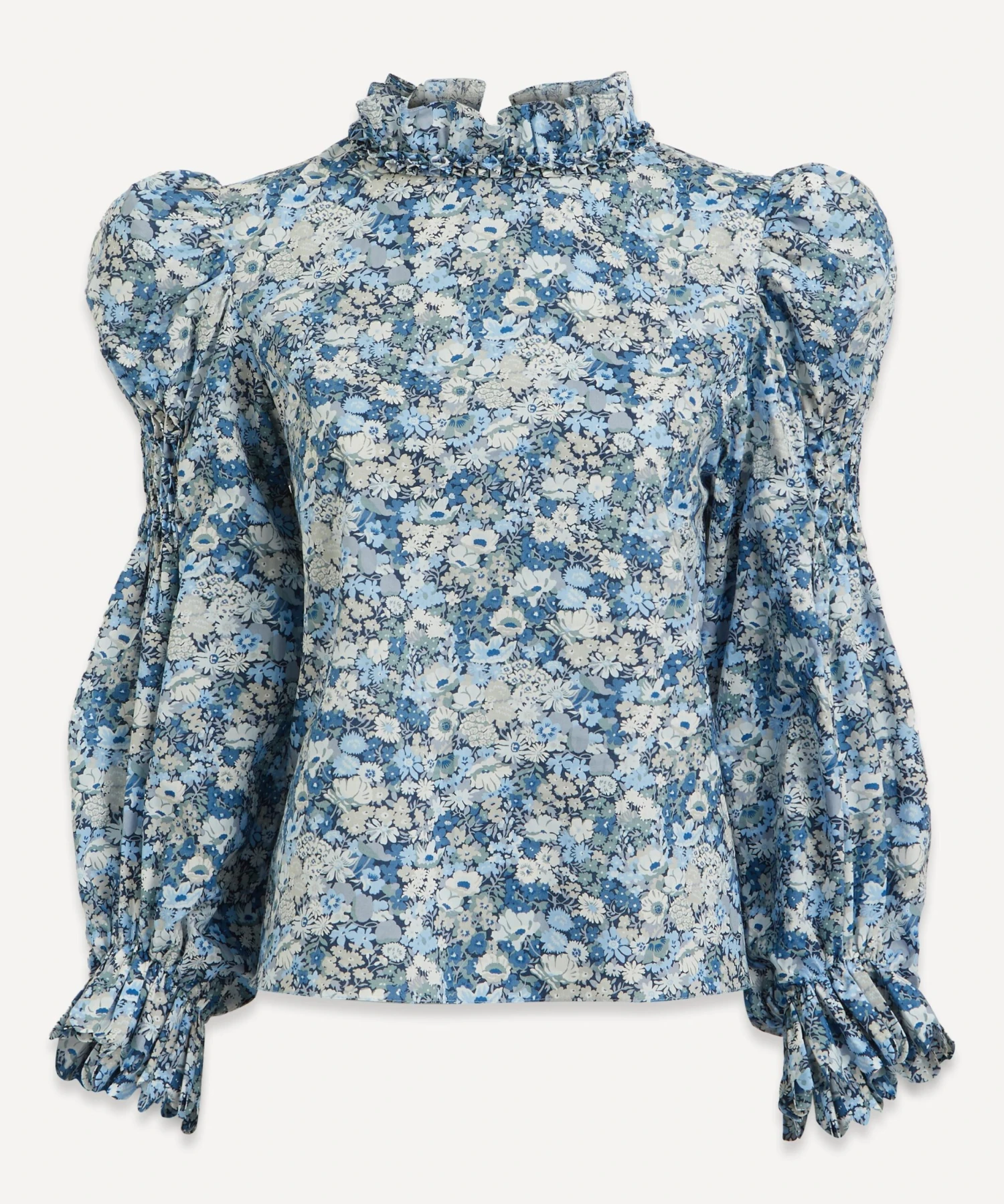 Fusing feminine frills with floral Liberty prints, Munich-based label Horror Vacui presents the Claire Blouse. Crafted from Libertyâs classic Thorpe Tana Lawn⢠Cotton, its statement puffed-sleeves feature smocked detailing at the shoulder and scallop-edged cuffs, while its ruffled high-neck is embellished with intricate, hand-pleated Froschgoscherl detailing for a whimsy finishing touch.