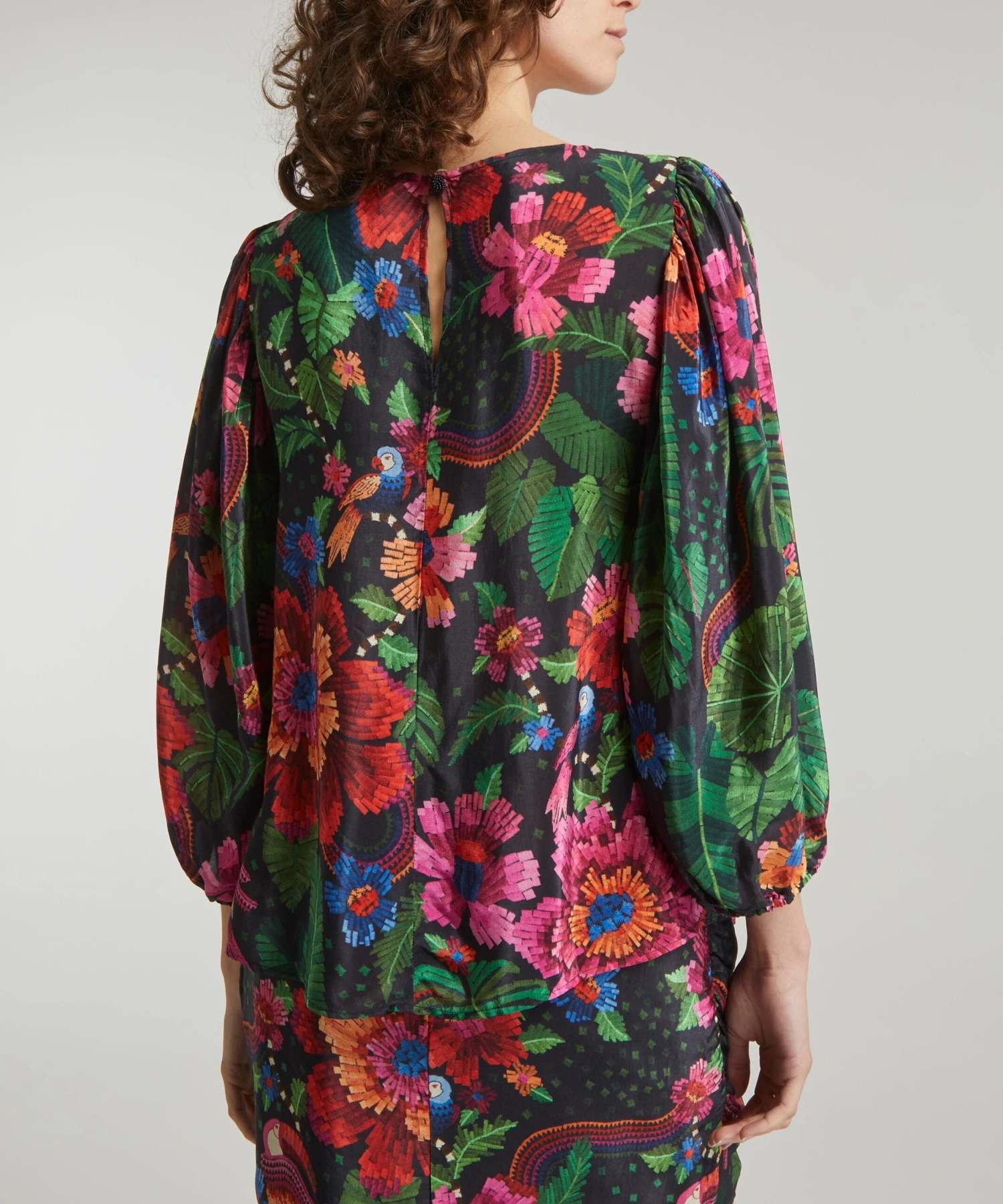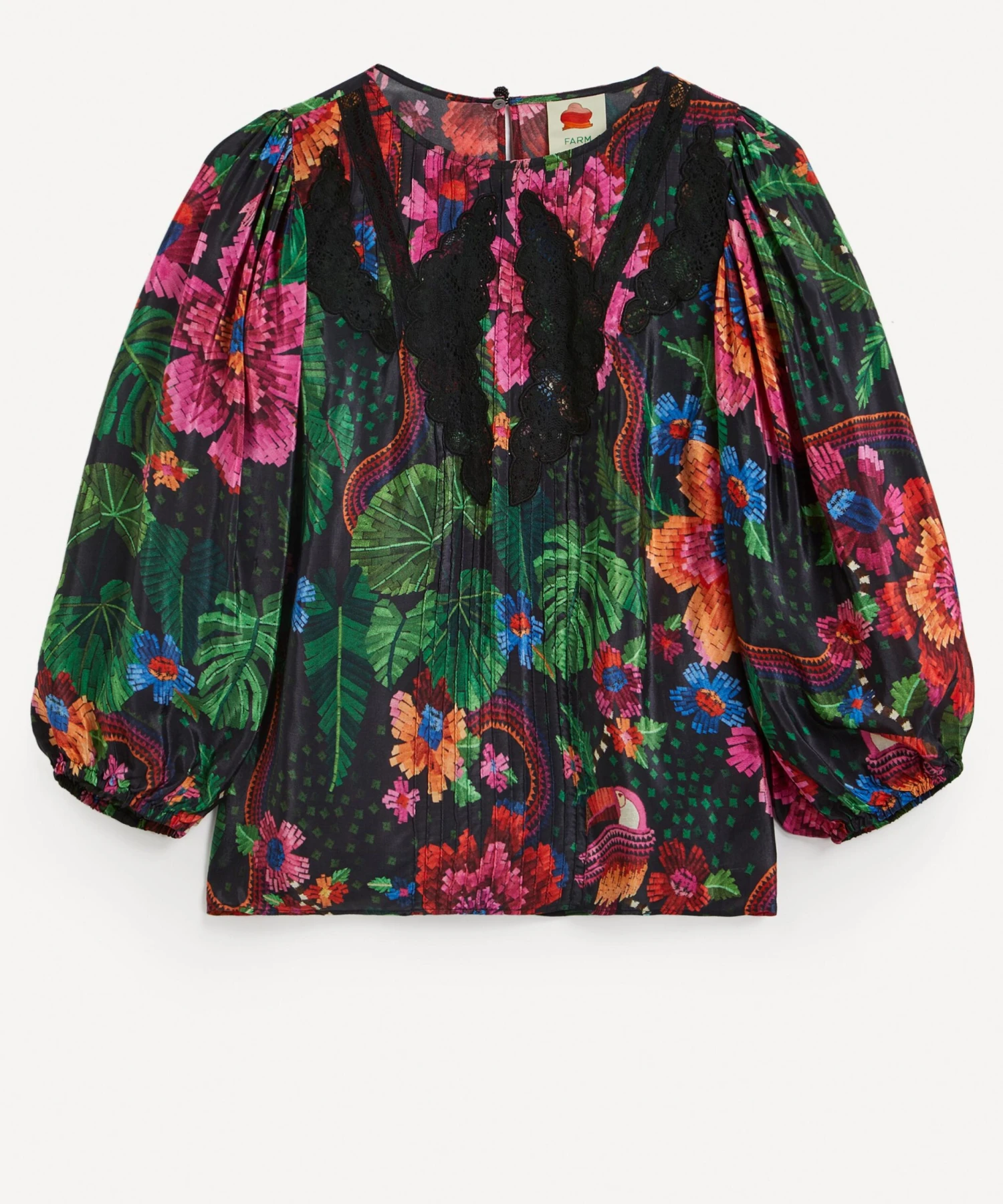 The Black Blooming Garden blouse from Rio de Janeiro-based label FARM Rio brings some Brazilian vivacity to your new-season edit. Bold and breezy in viscose-crepe adorned with blooming garden flowers and delicate lace inserts across its pleated front, it has voluminous blouson-sleeves. Pair it with the matching Black Blooming Garden mini-skirt for an effortlessly sophisticated ensemble.