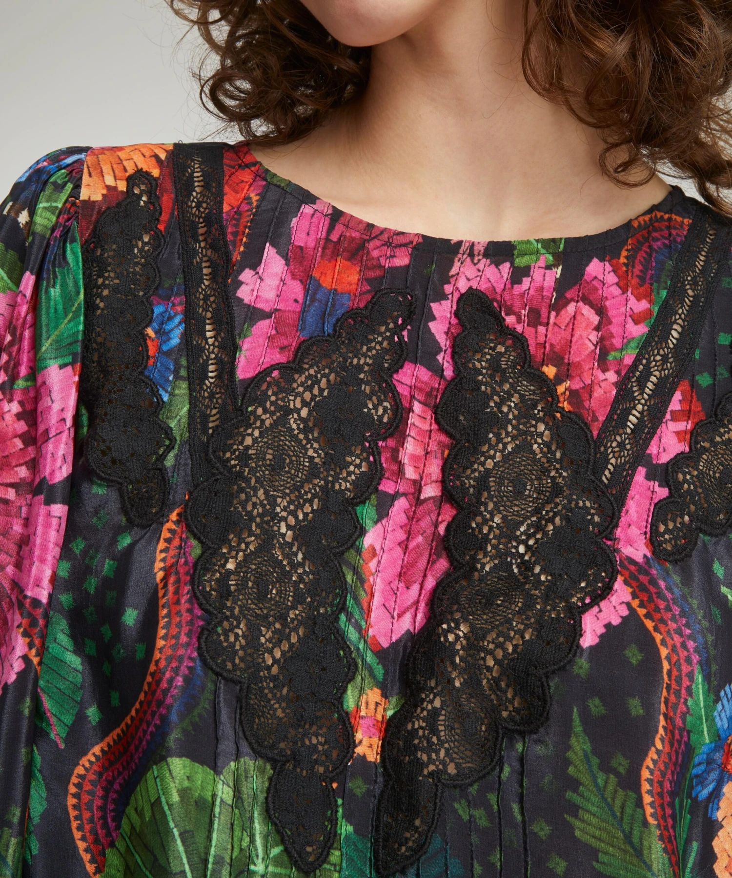 - Pleated front with lace inserts