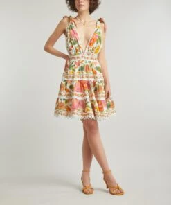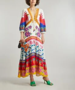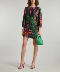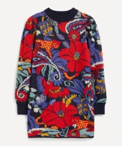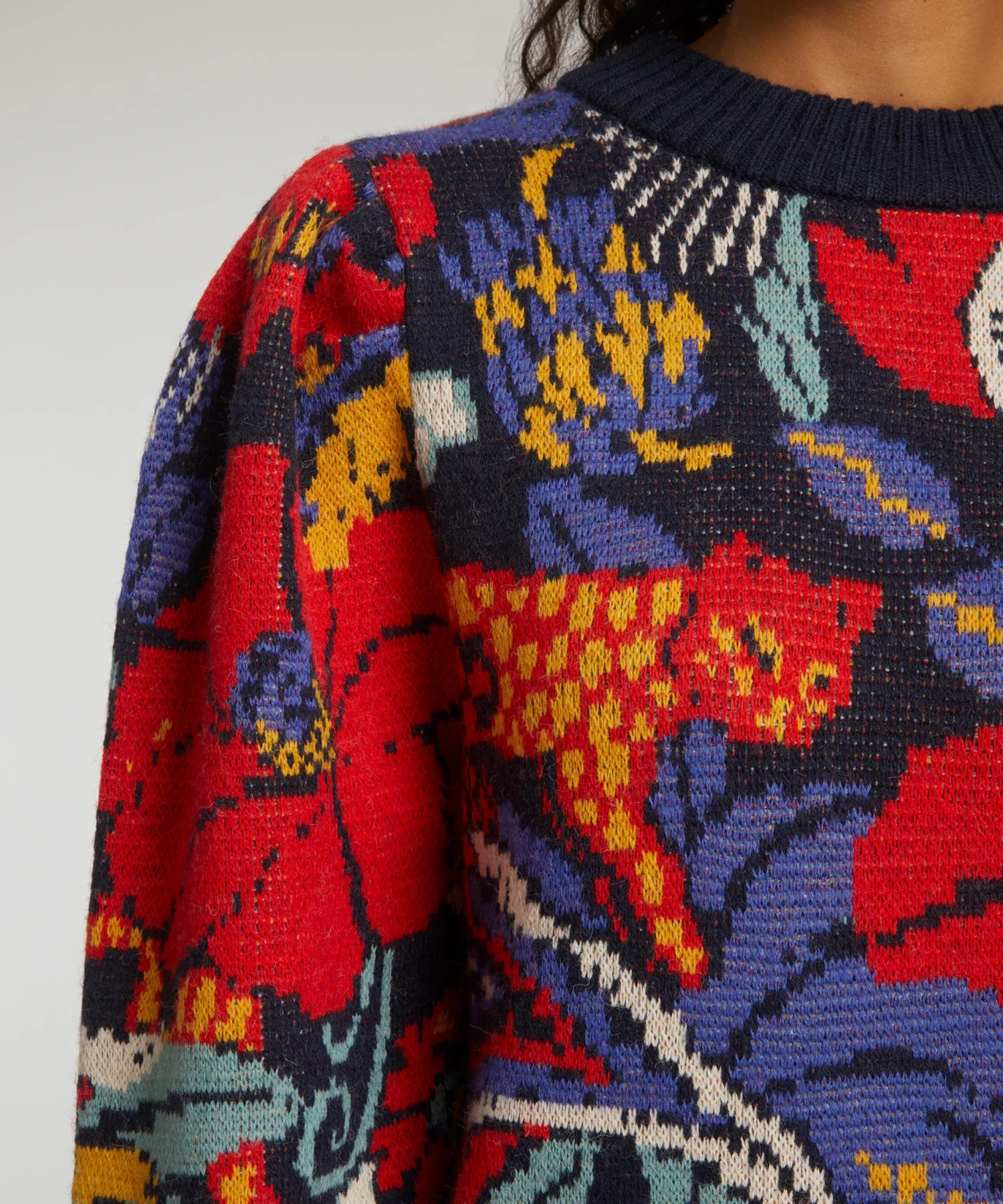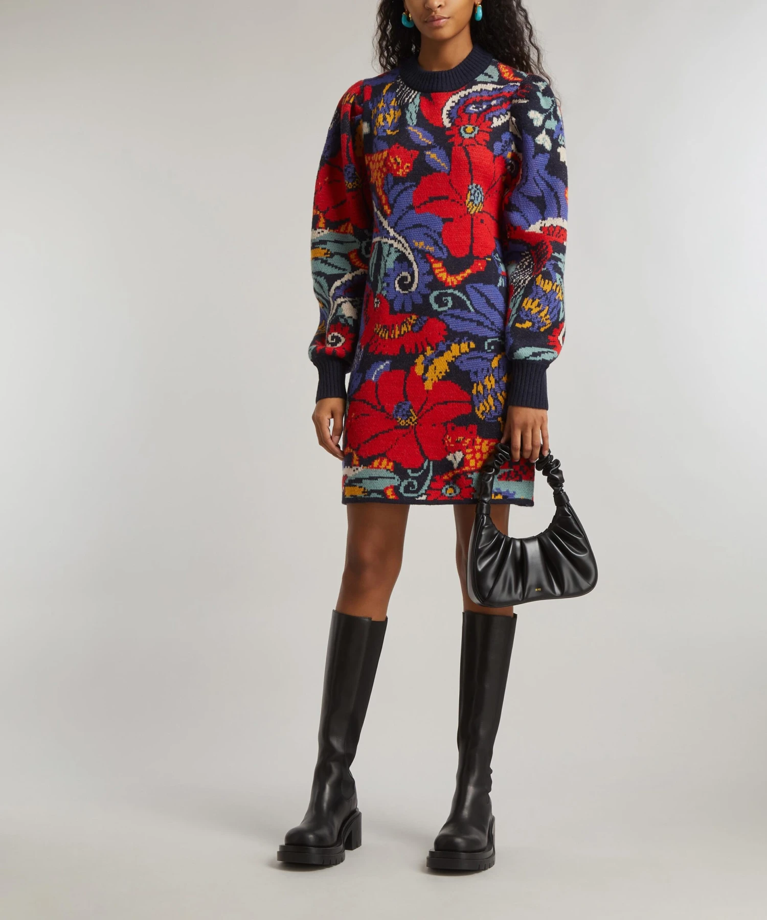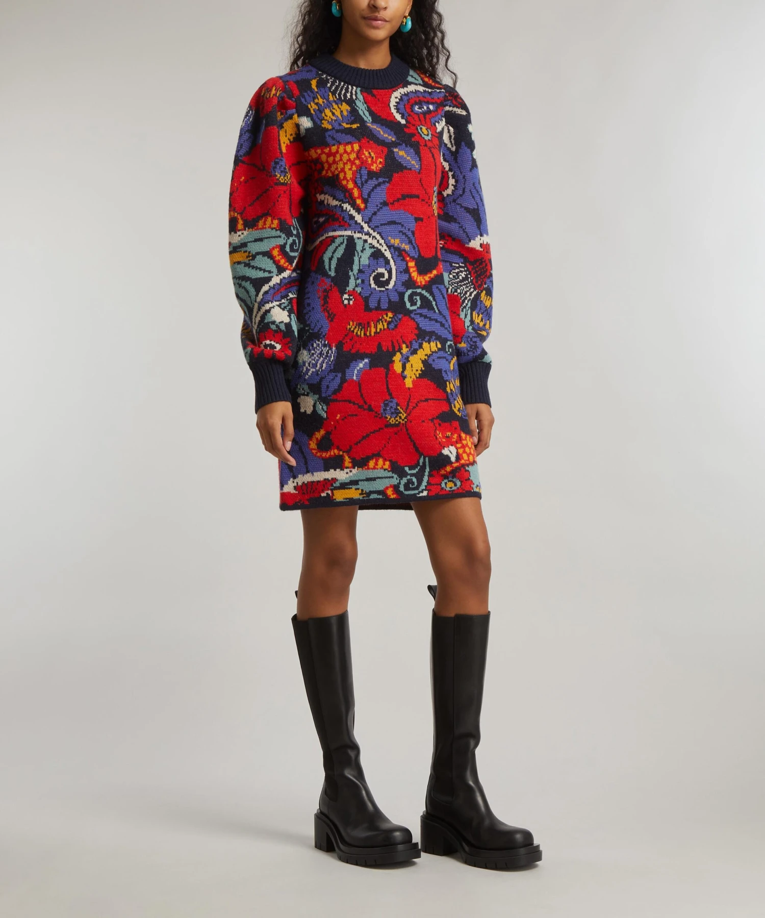 Bursting with colour, the Blue Vintage Forest dress from Rio de Janeiro-based label FARM Rio brings some Brazilian vivacity to your new-season edit. Bring a touch of the Brazilian rainforest to your winter wardrobe with this bold, tropical print knitted mini-dress. Cosy and chic, it’s cut to a relaxed mini-length with long puffed-sleeves and ribbed trims running across its crew-neck collar and cuffs.