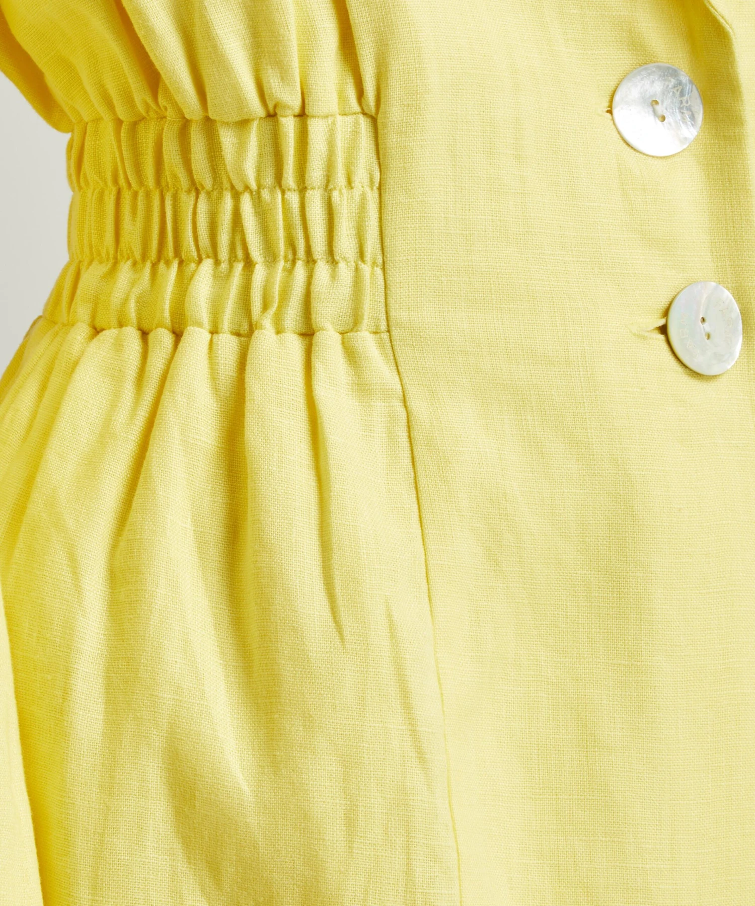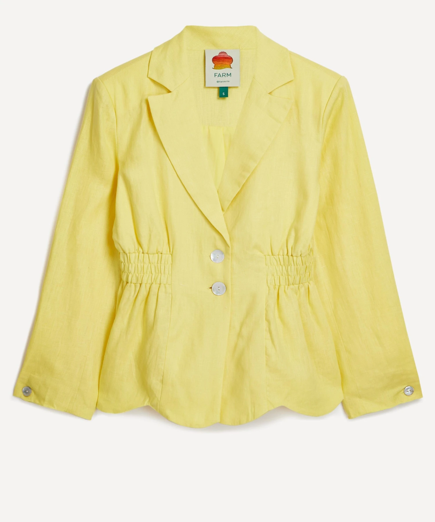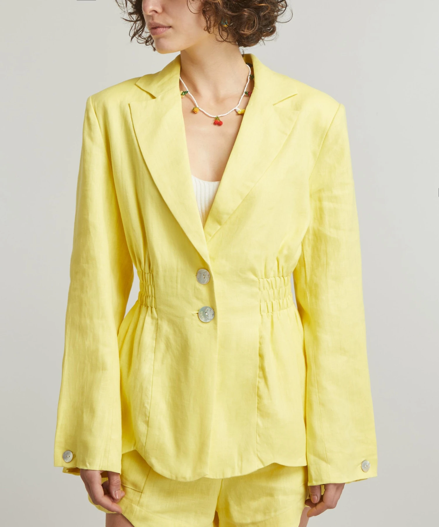 Bold and brimming with vibrancy, this statement sartorial piece is crafted from linen for a tailored silhouette featuring gathered detailing at the waist. A classic cut with its V-neckline, notched lapel and button closure, it’s finished with mother-of-pearl buttons and scalloped edging at the hem. Pair it with the matching Bright Yellow Shorts for a smart summer look.
