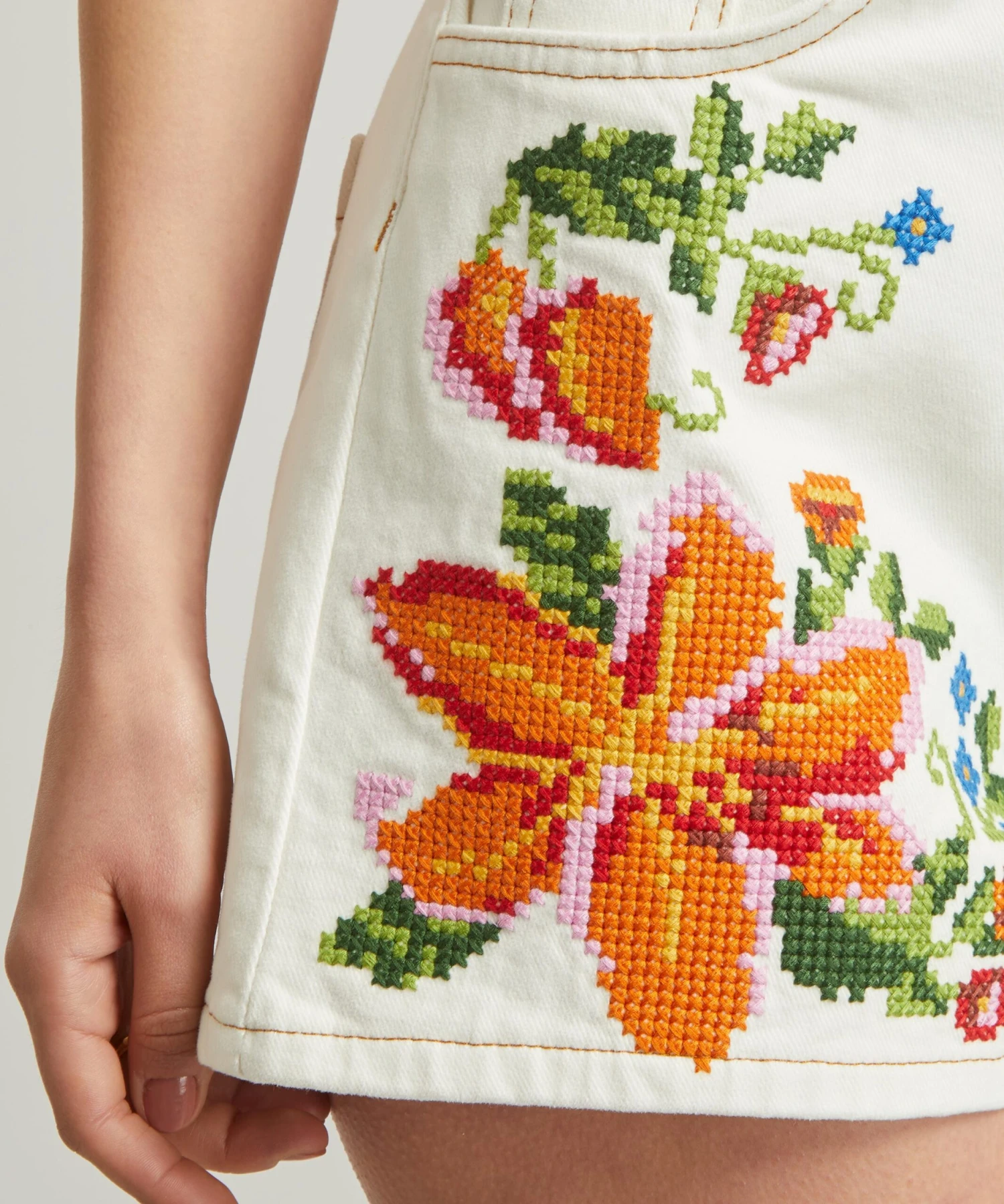 Adorned all-over with intricate cross-stitch embroidery inspired by the flora and fauna of Brazil, this cropped pair is crafted from cotton twill. Fitted with a flattering high-rise waist, it features 5-pockets for a classic denim finish.