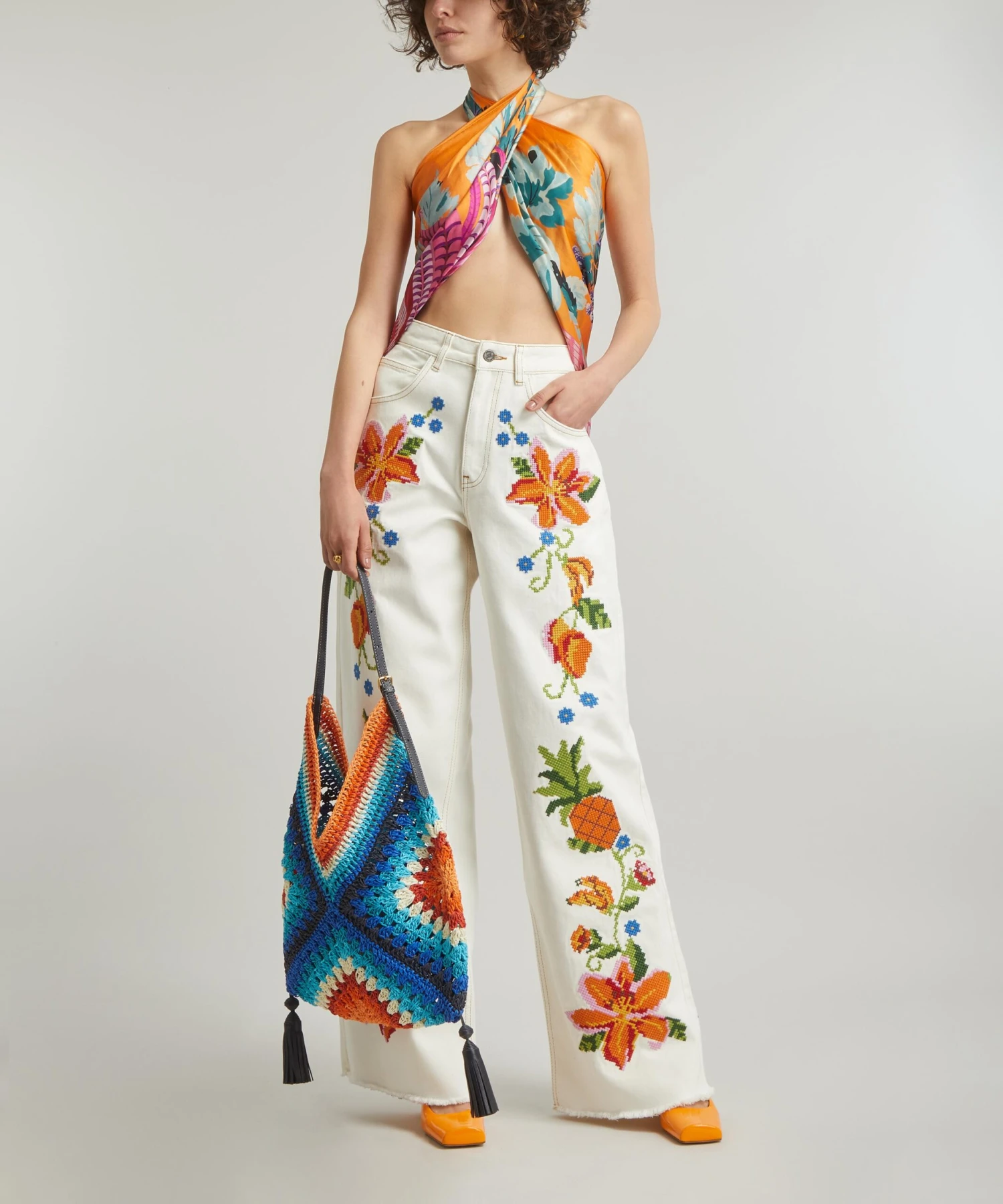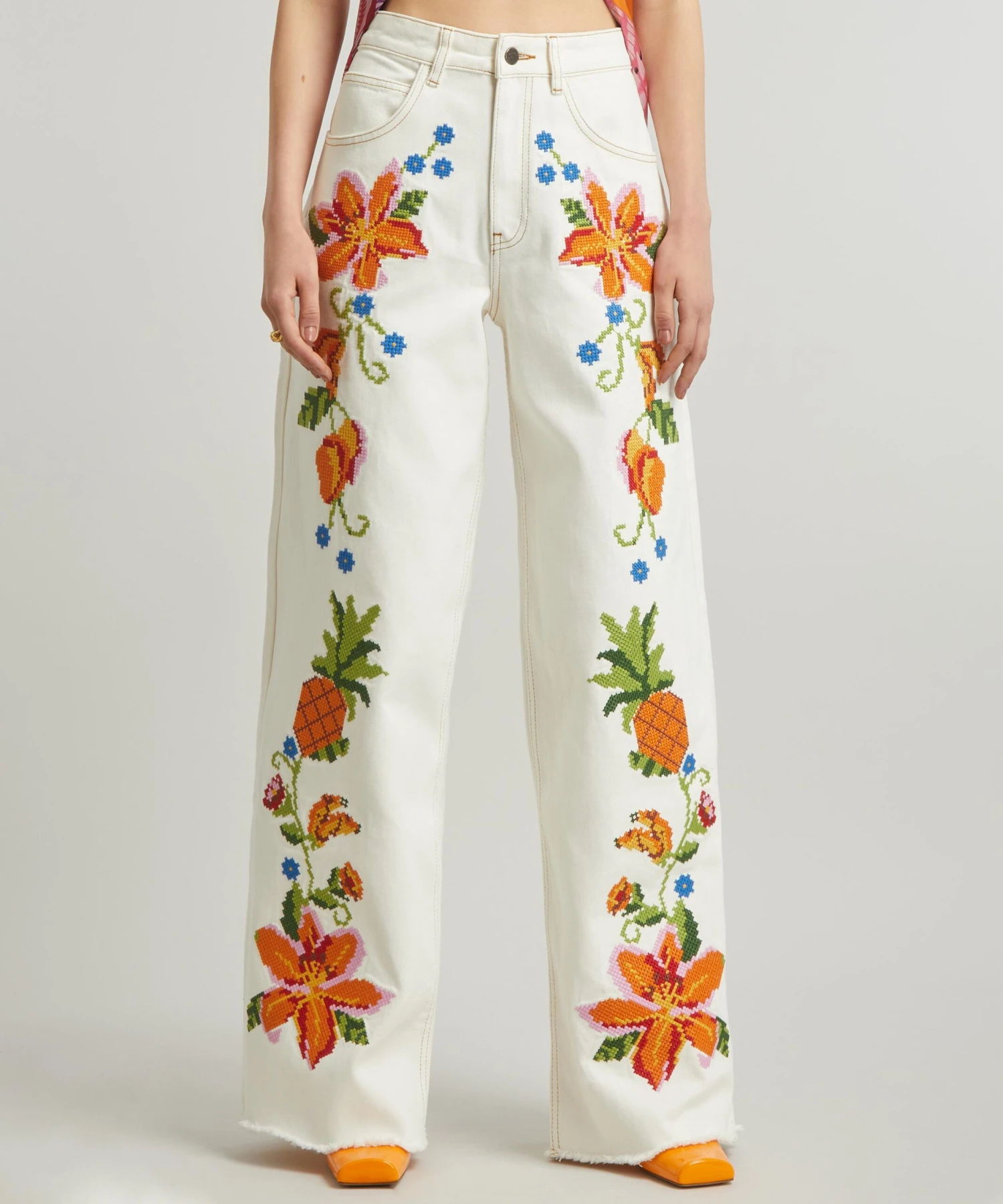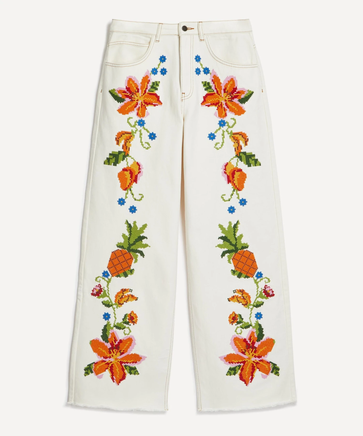 Adorned all-over with intricate cross-stitch embroidery inspired by the flora and fauna of Brazil, this flared pair is crafted from cotton twill for an easy-fitting, wide-leg silhouette, complete with lightly frayed hems.