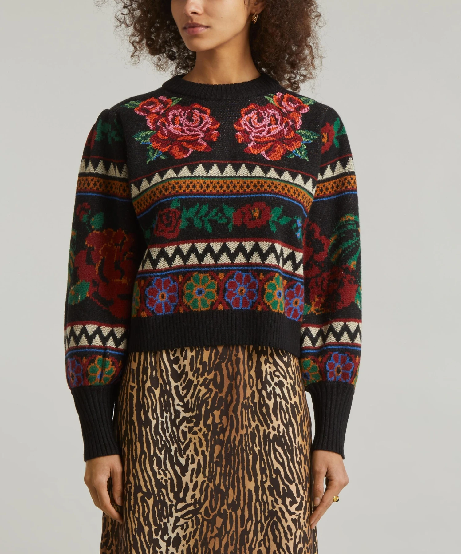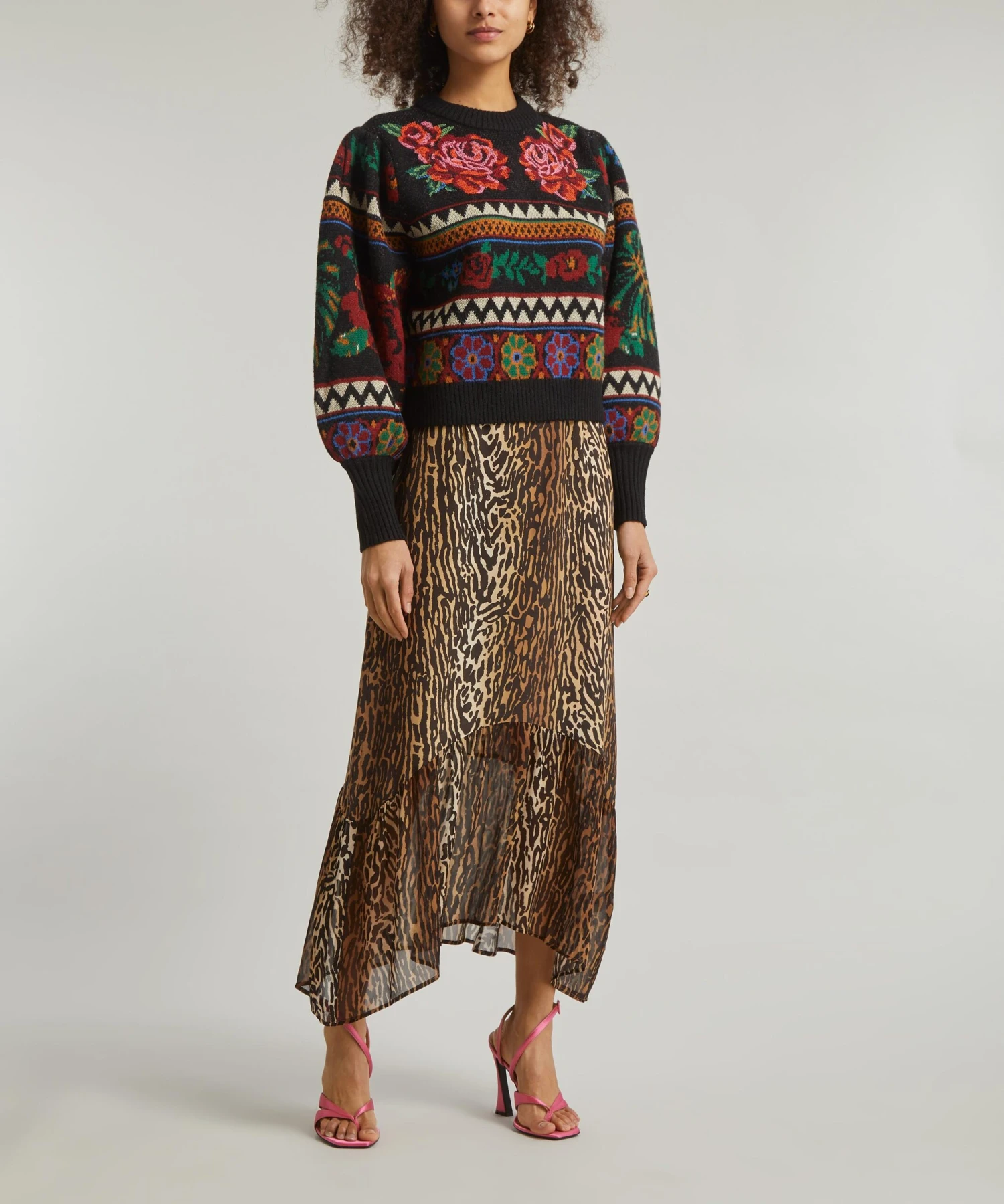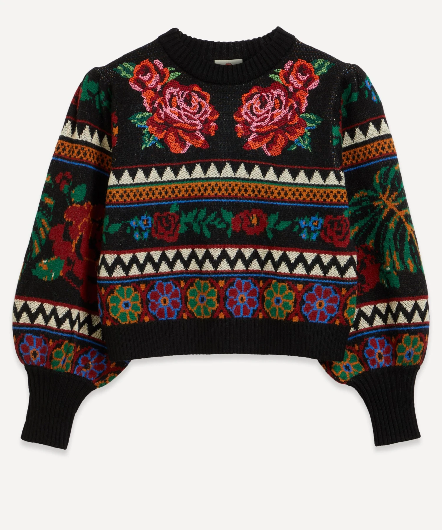 Bursting with colour, the Flower Tapestry jumper from Rio de Janeiro-based label FARM Rio brings some Brazilian vivacity to your new-season edit. Snug and stylish this knitted crew-neck jumper is adorned all-over in an eclectic floral pattern, complete with bouffant sleeves and cosy ribbed trims.
