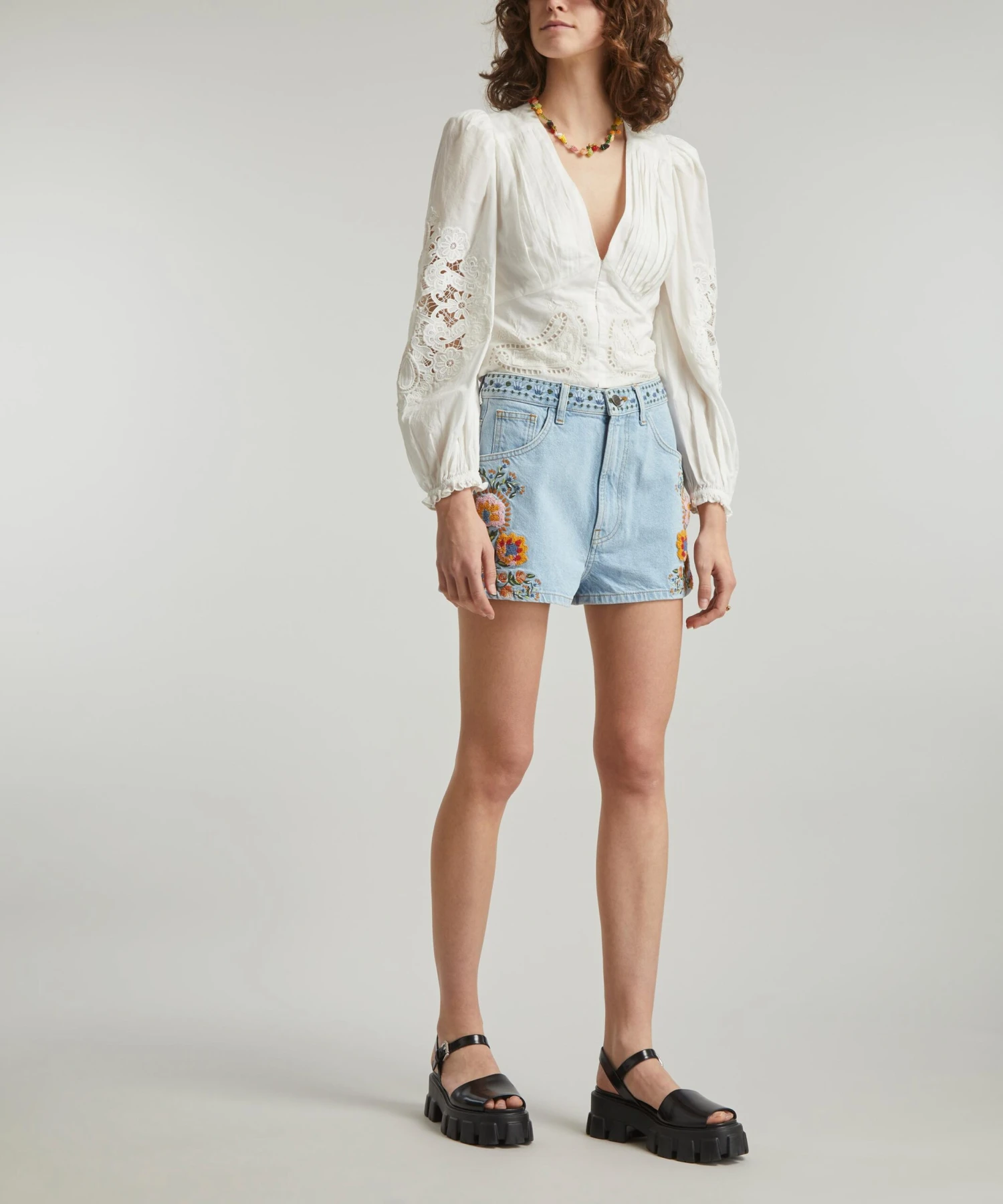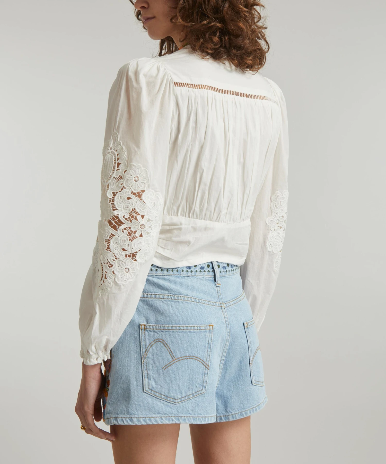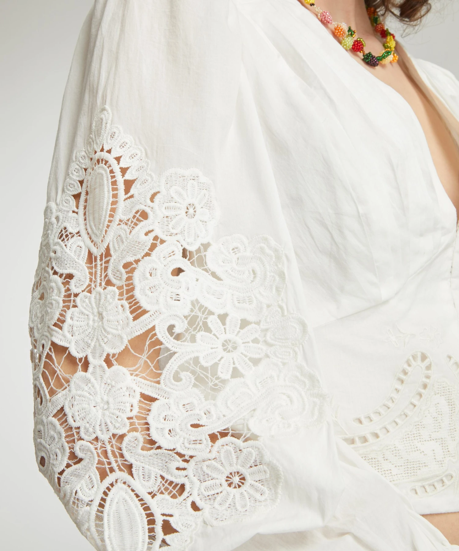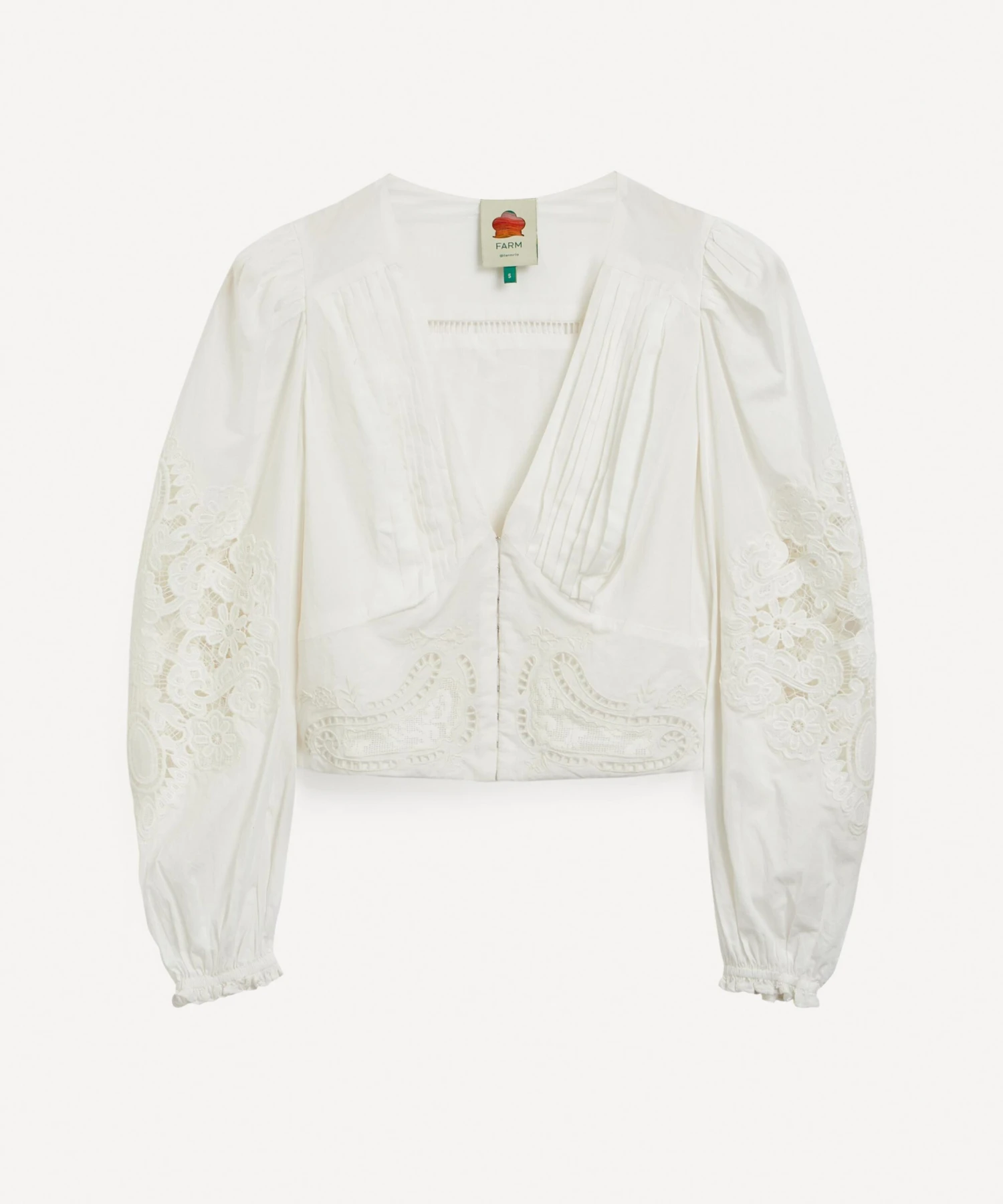 The Off-White Lace blouse from Rio de Janeiro-based label FARM Rio brings some Brazilian vivacity to your new-season edit. Effortlessly romantic, this cotton blouse is elevated by its elegant V-neckline and delicate, lace-cut detailing that adorns its blouson sleeves and waist.