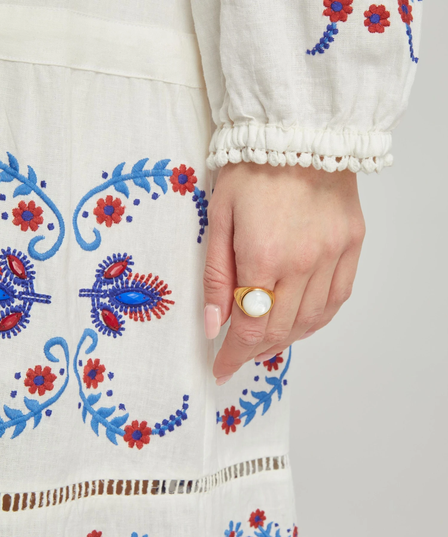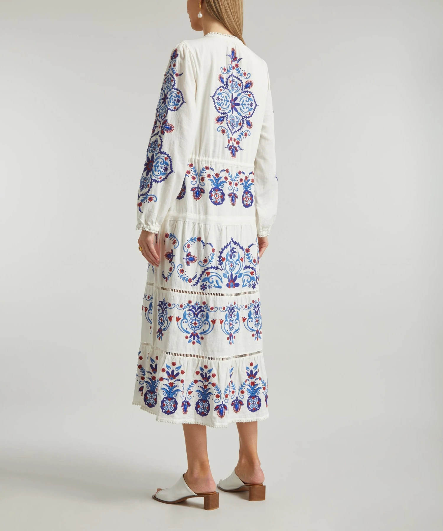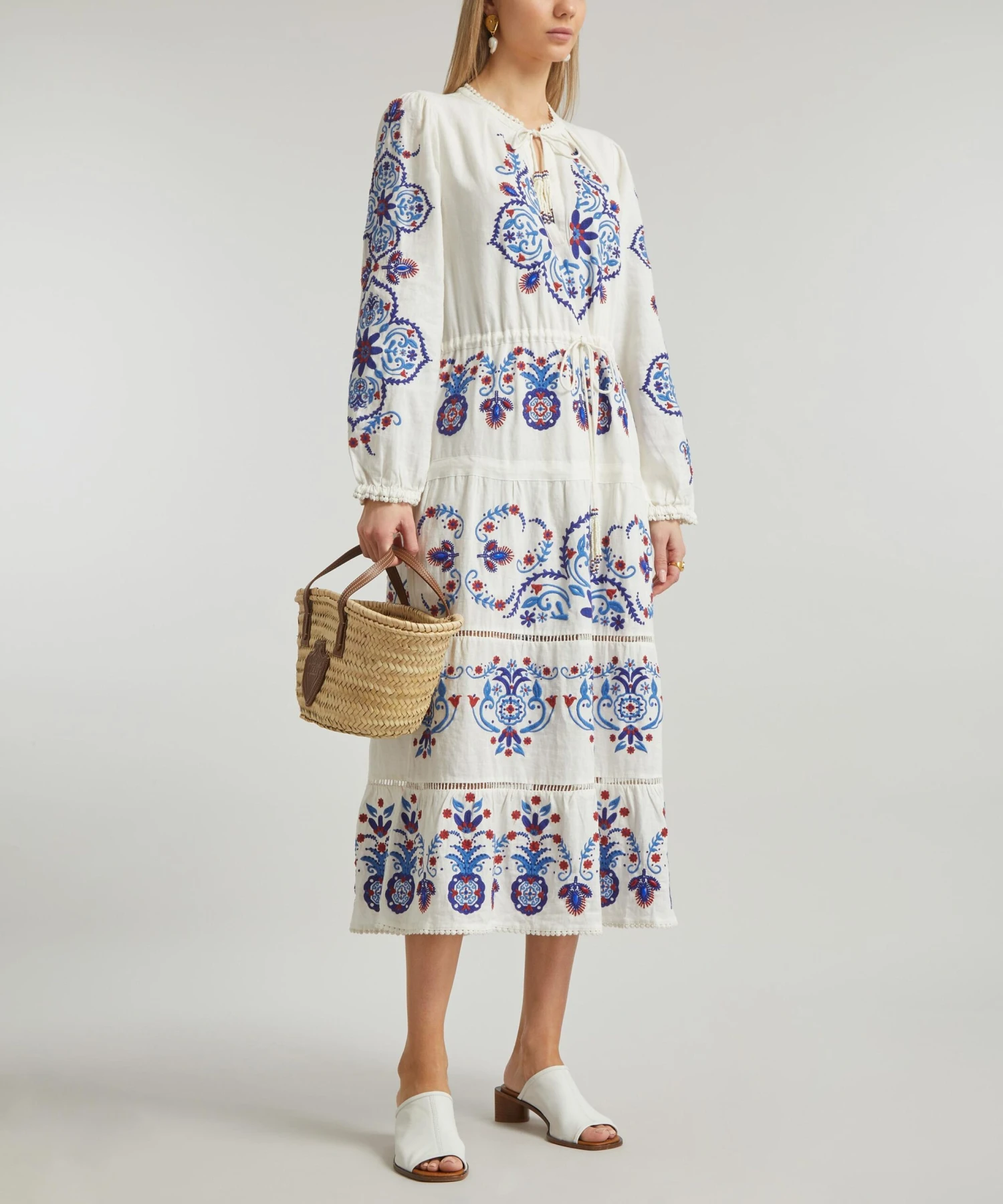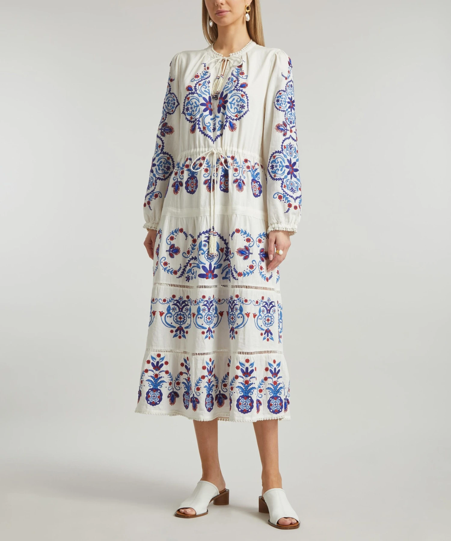 The Off-White Navy Embroidered midi-dress from Rio de Janeiro-based label FARM Rio brings some Brazilian vivacity to your new-season edit. Bold and breezy, this bohemian-inspired tunic has a relaxed blouson top featuring beaded tassels at the neck and waist, and a floaty, tiered silhouette with intricate blue and red floral embroidery throughout.