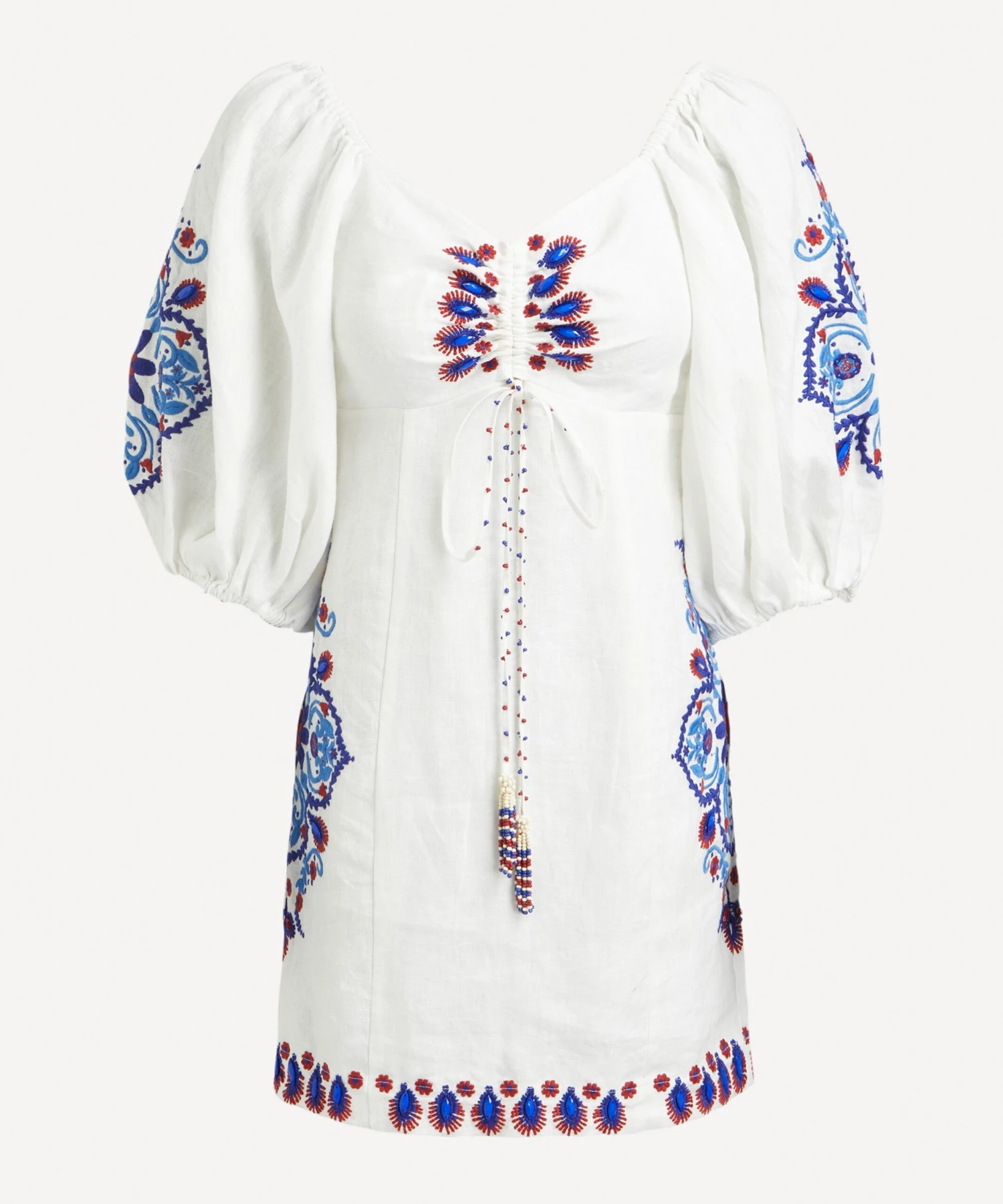 The Off-White Navy Embroidered mini-dress from Rio de Janeiro-based label FARM Rio brings some Brazilian vivacity to your new-season edit. Bold and breezy with its intricate botanical embroidery, this short tunic-style dress features an elegant V-neckline and a gathered bust, complete with beaded tassel-ties.