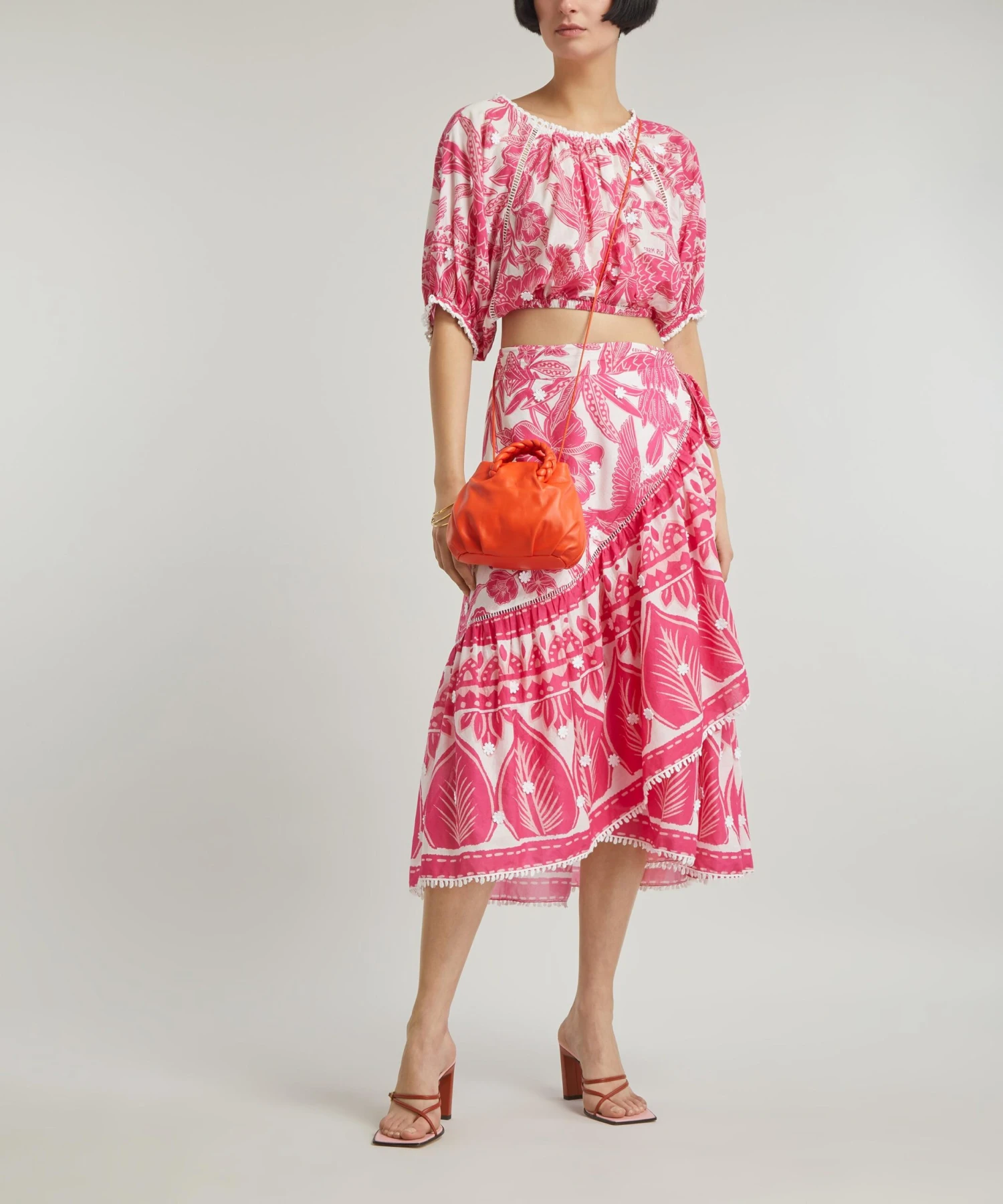 The Tropical Woodcut crop-top from Rio de Janeiro-based label FARM Rio brings some Brazilian vivacity to your new-season edit. Bold and breezy with its tropical pink parrot print, its loose-fitting, cropped design features an elegant round neckline, puffed sleeves and elasticated lace trims for a gathered finish throughout.