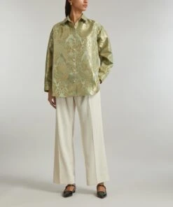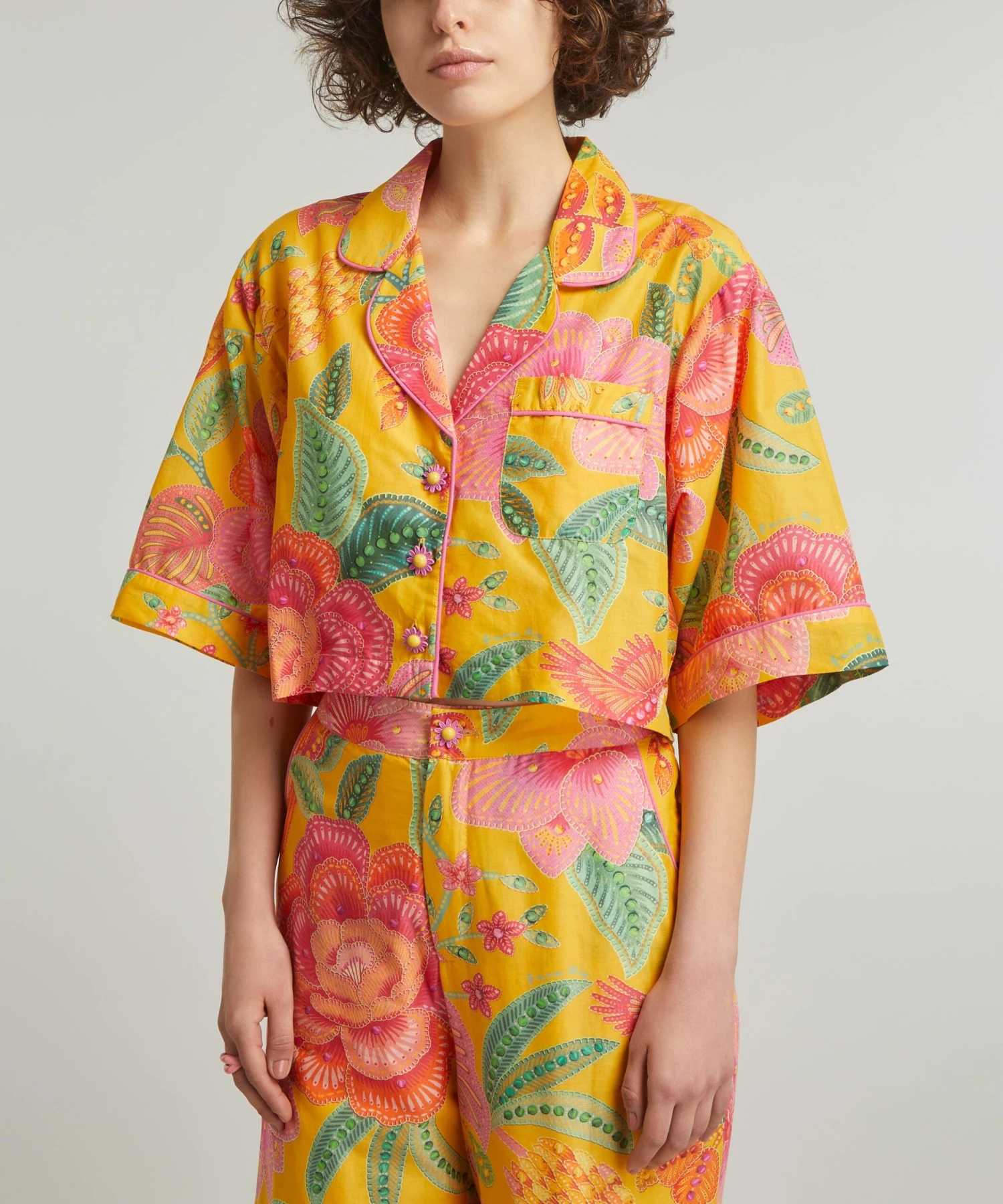 Bold and brimming with a vivid yellow print inspired by the flora and fauna of Brazil, it’s crafted from lightweight cotton for an easy, relaxed fit with wide-cut, three-quarter-length sleeves. Featuring an open V-neckline with a notched lapel, its buttoned closure is embellished with daisy-shaped buttons