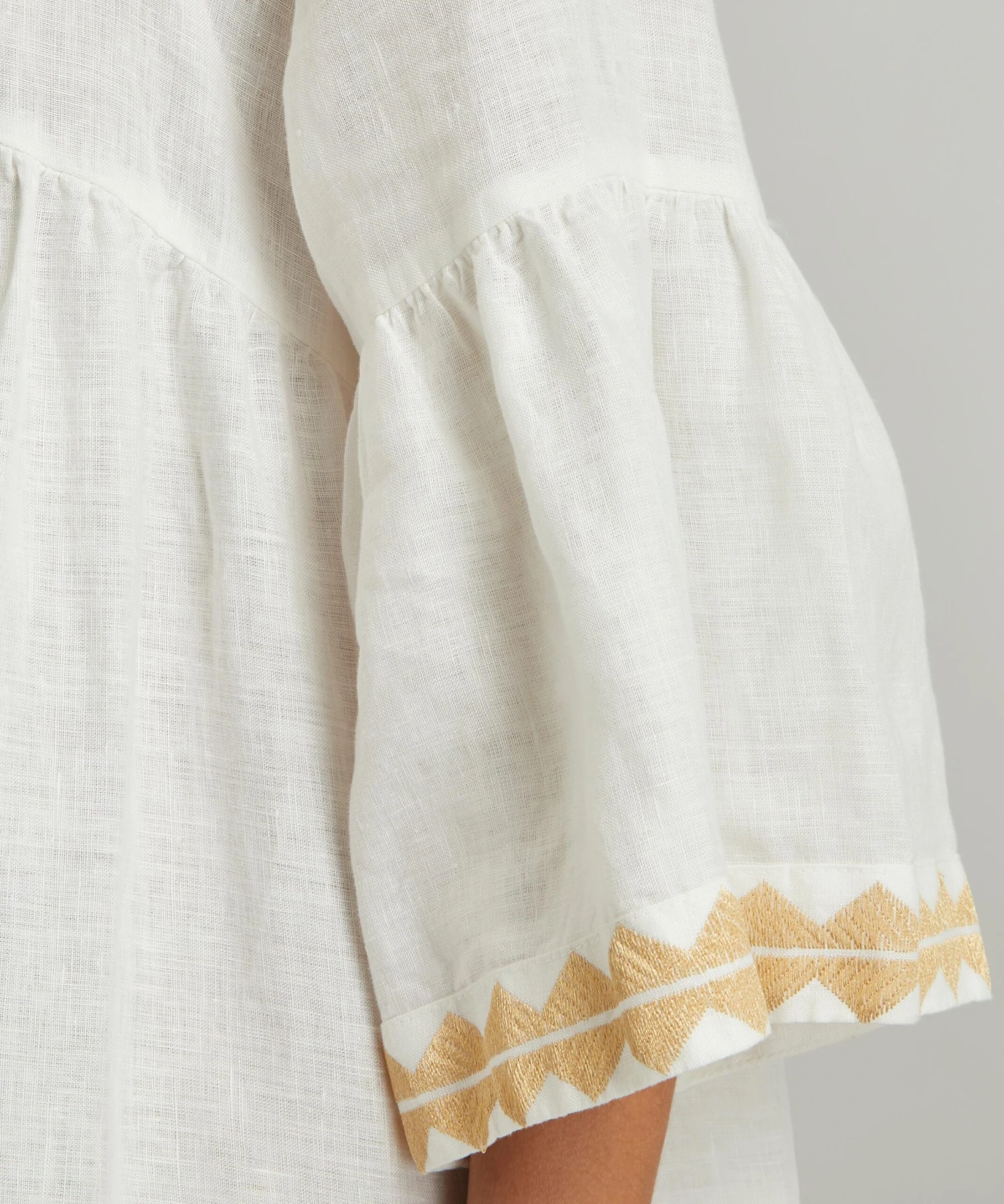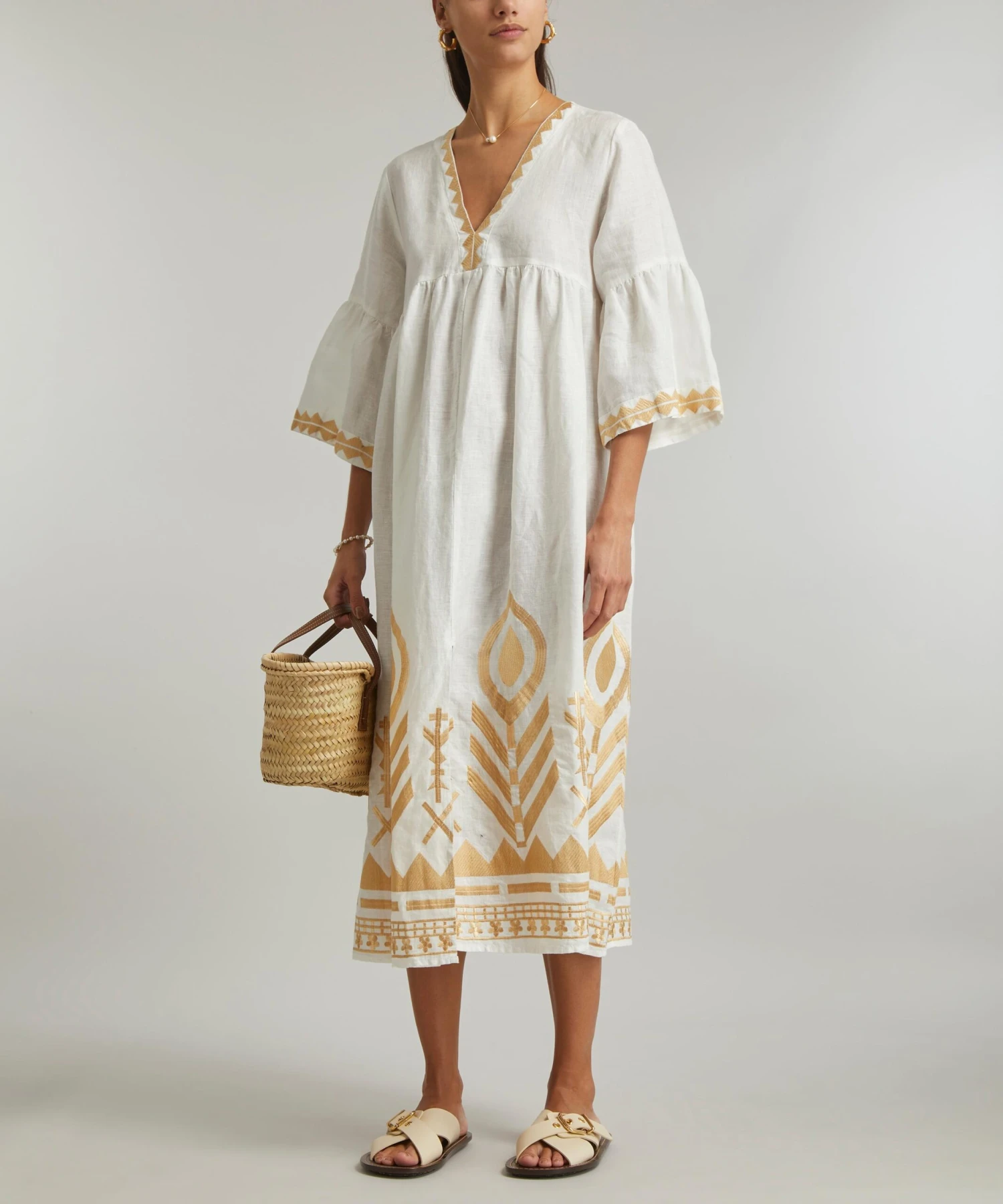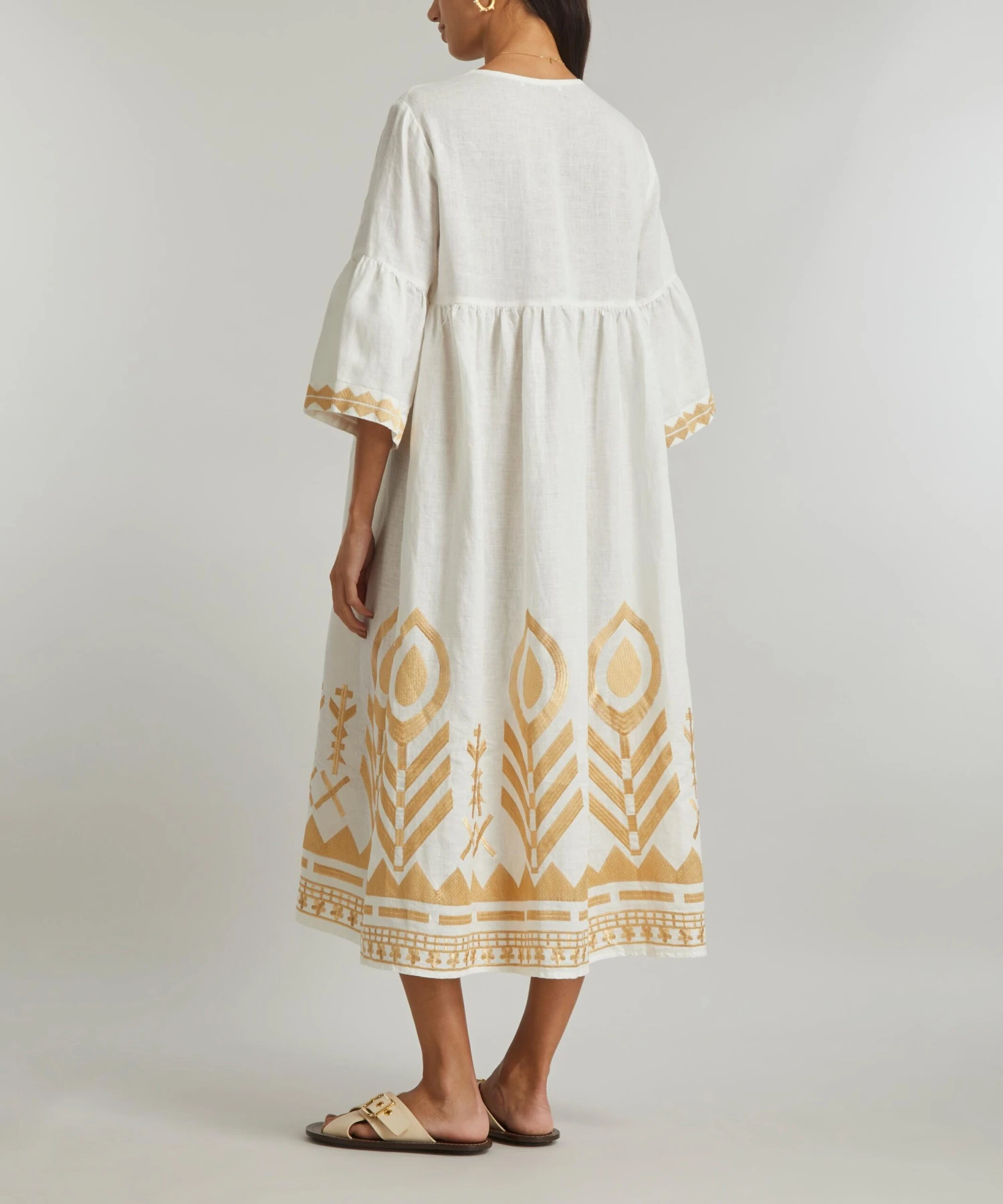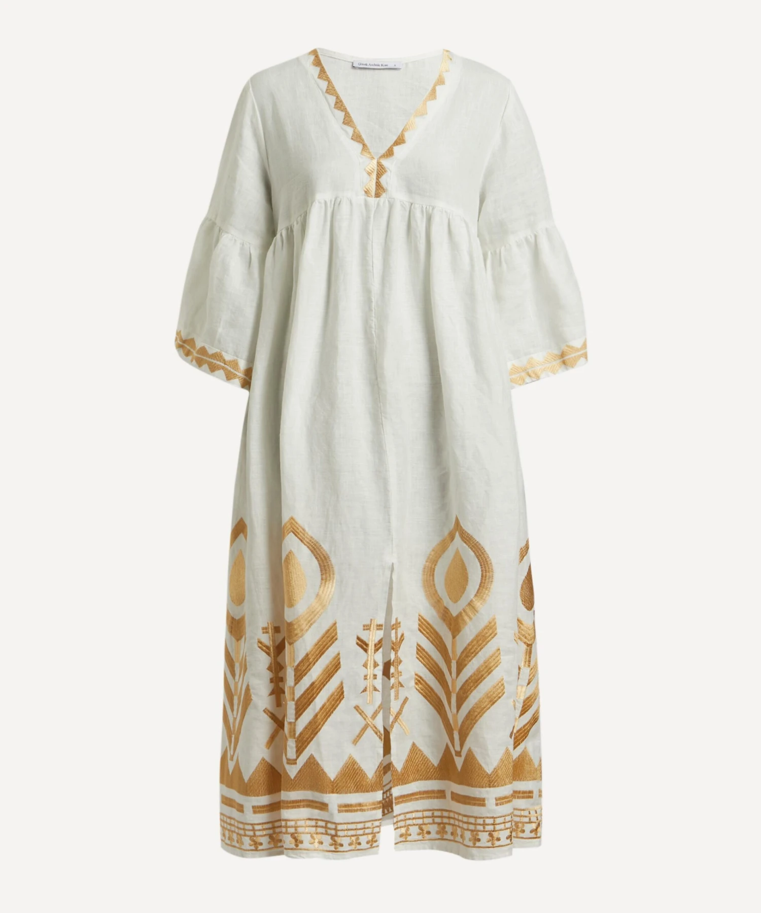 The Feathers Embroidered Tunic from Athenian label Greek Archaic Kori brings a touch of the Mediterranean sun to your new-season edit. Lightweight and loose, it’s cut from pure linen and features an elegant V-neckline, fluted sleeves and a flattering empire-waist that falls to a relaxed midi-length, complete with intricate gold feathered embroidery throughout.