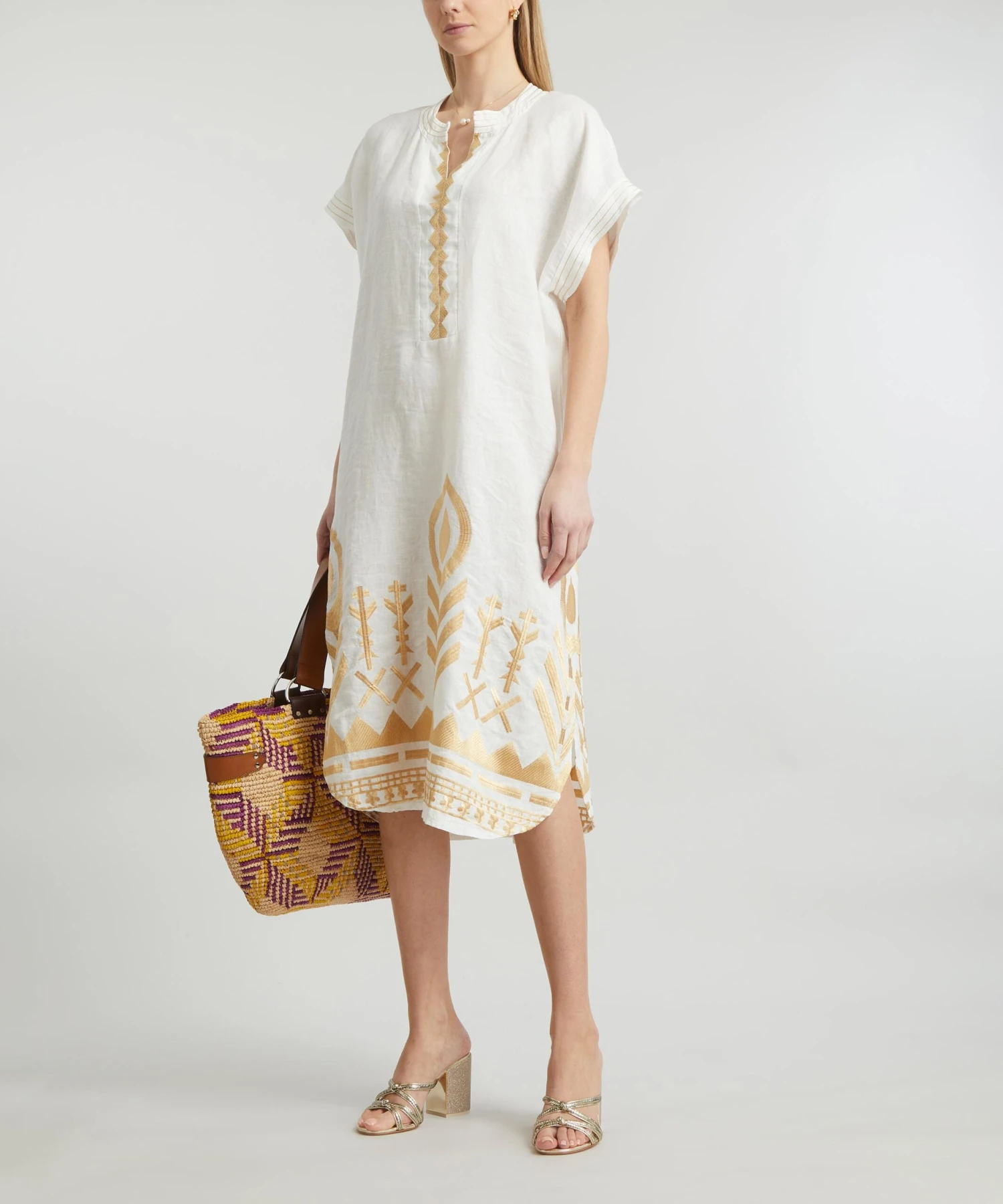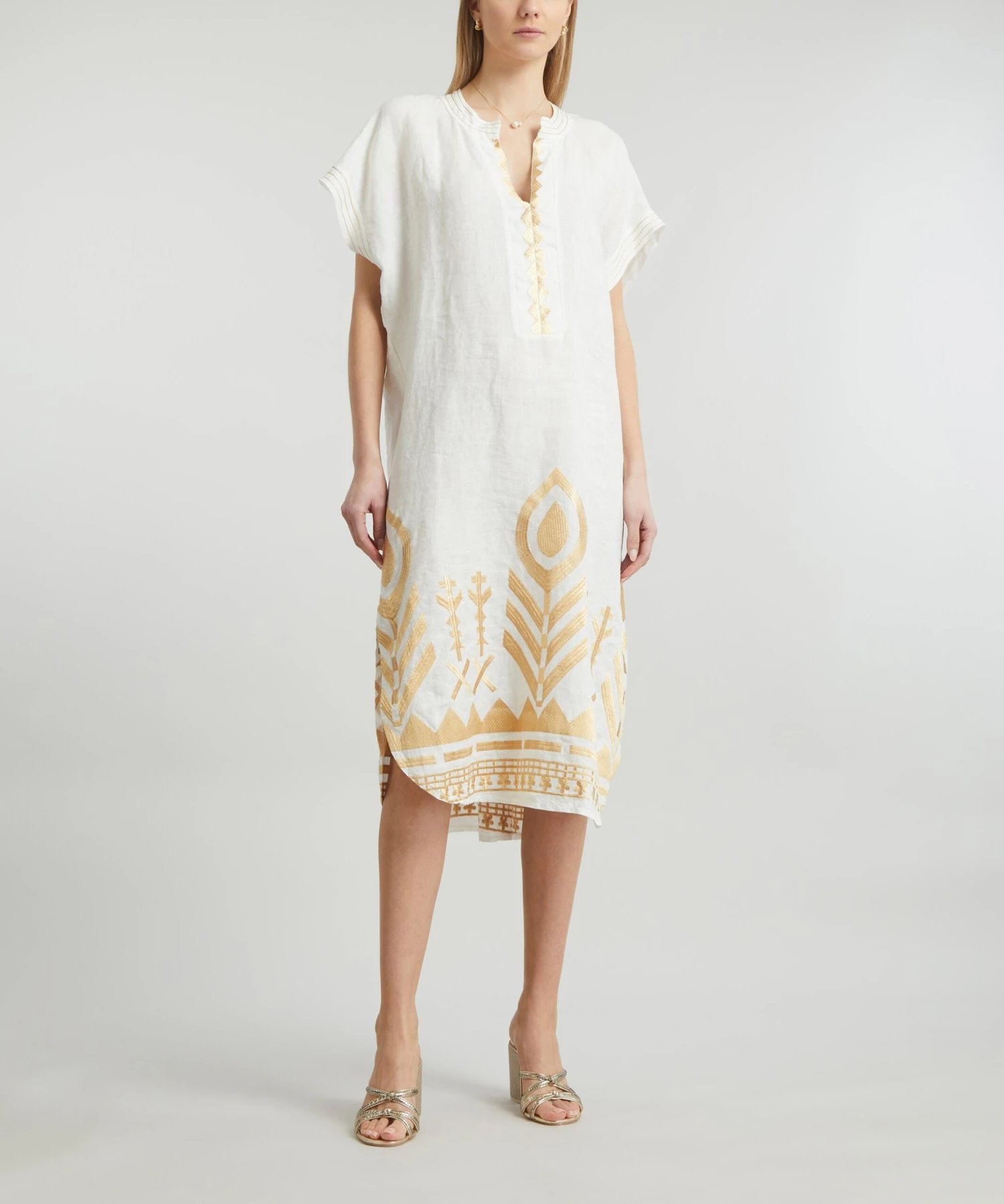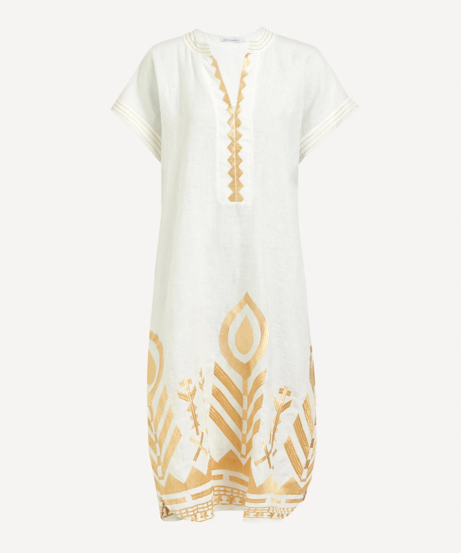The Feathers Embroidered Tunic from Athenian label Greek Archaic Kori brings a touch of the Mediterranean sun to your new-season edit. Lightweight and loose, it’s cut from pure linen for a relaxed fit with an open V-neckline, short cap-sleeves and intricate gold feathered embroidery throughout.