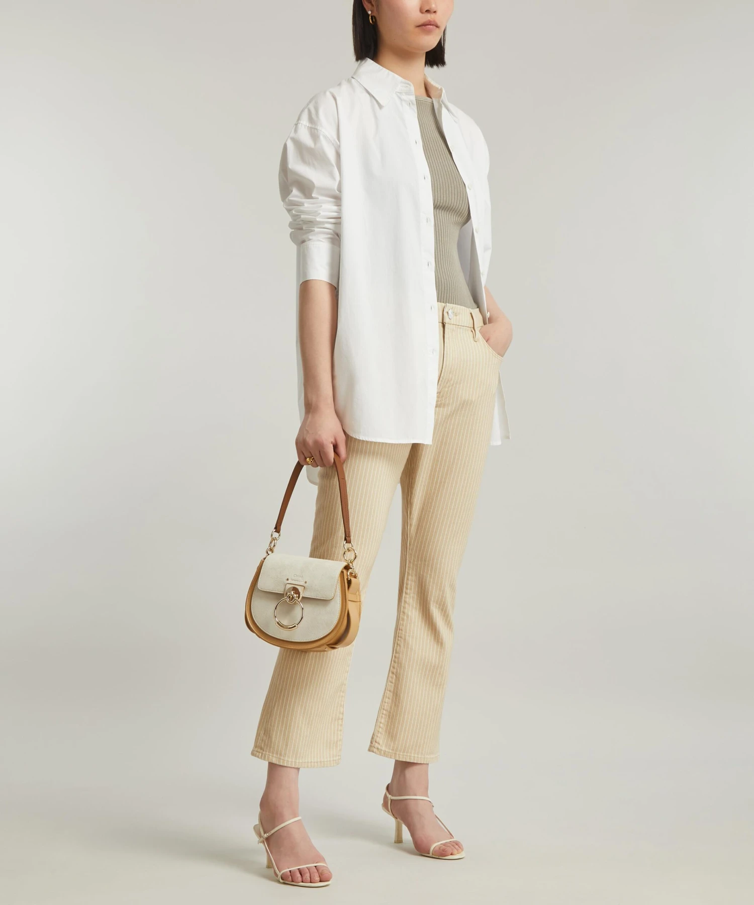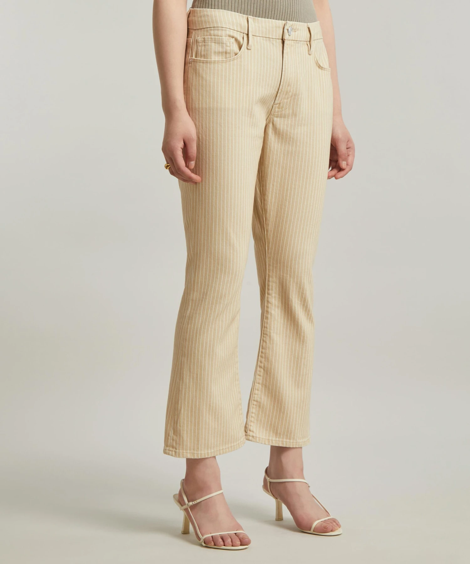 A best-selling style from cult denim Los Angeles denim label FRAME, the Le Crop Mini Boot jeans feature a chic sand-and-white striped design for the new season. Cut from COMFORT STRETCH DENIM for ultimate ease and comfort, its cropped boot-cut silhouette features a form-fitting contour waistband – perfect for layering over one of Frame’s cotton t-shirts for inimitable downtown-LA style.