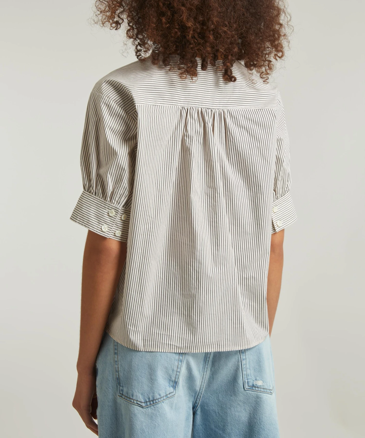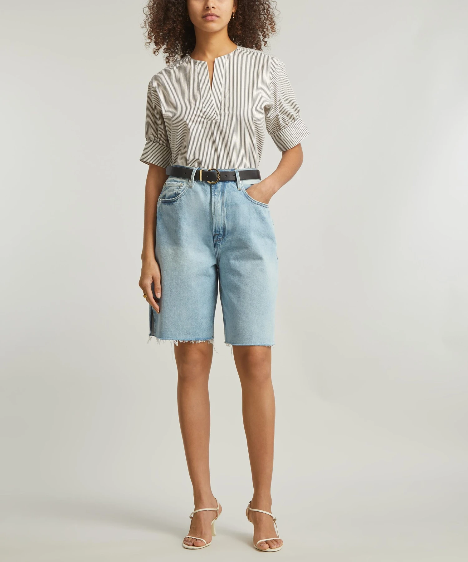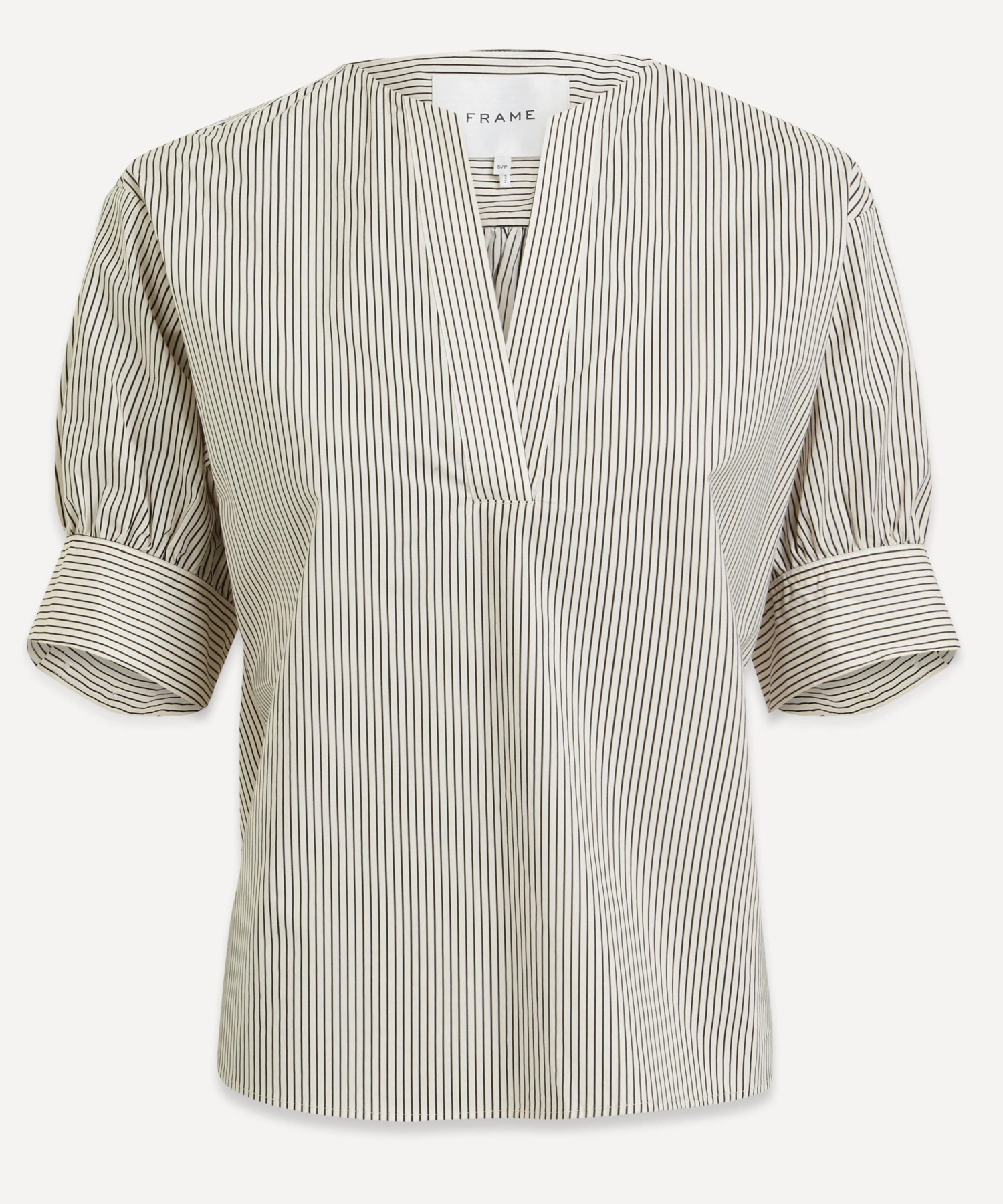 Known for its expertly crafted jeans, LA-based brand FRAME presents the V-Neck Popover top – perfect for pairing with jeans for an easy weekend look. Lightweight and loose in striped cotton, its super-feminine silhouette features an elegant V-neckline and lightly puffed short-sleeves.