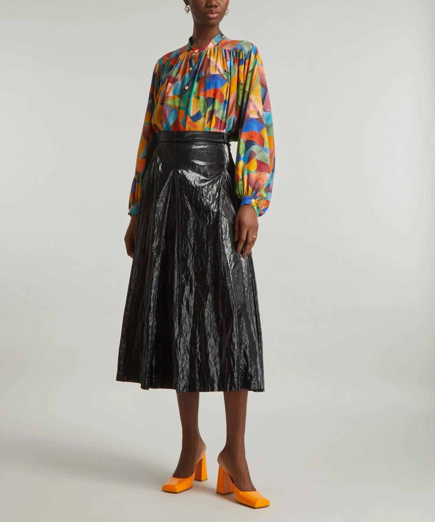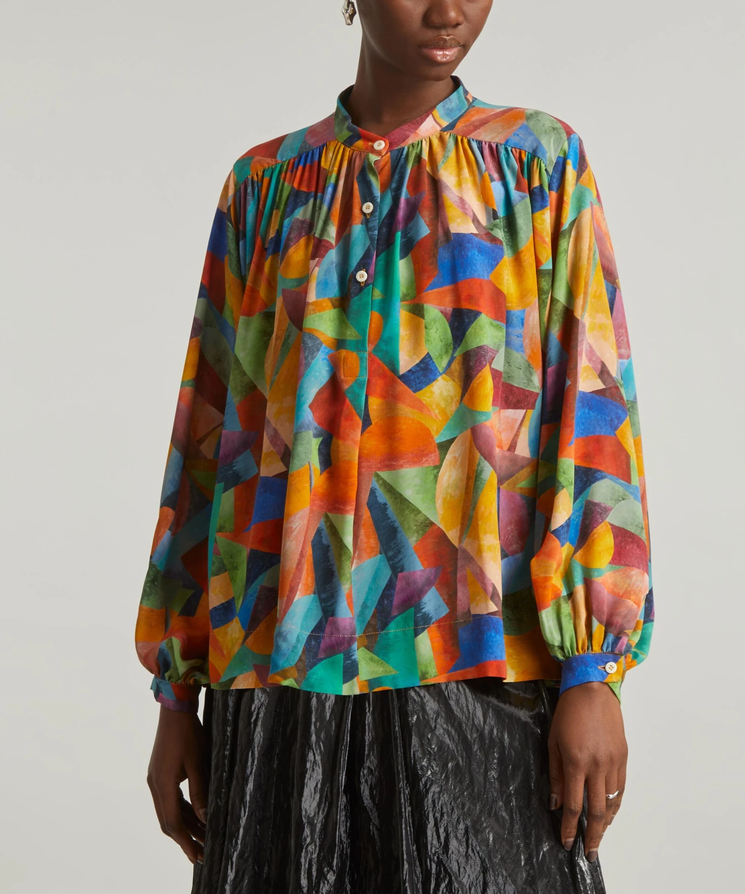 Our Boho women’s shirt style is crafted from luxurious silk crepe de chine and features a Grandad style stand collar, half placket and delicate gathering at the shoulders and the cuffs for an elegant, voluminous A-line finish. The design is from the FuturLiberty collection – an exploration of the unexpected in the Liberty archive, resulting in a reinvention of Liberty Fabrics – inspired by, and celebrating the artistic movements of Futurism, Vorticism, and a century of avant-garde. Future Liberty is inspired by Futurist paintings that depict abstracted visuals of mechanical forms, the Liberty Design Studio layered paint on to paper to create bold shapes that have a three-dimensional quality. The final design has the sense of a freshly painted artist’s canvas just removed from the easel – the paint still slightly wet.