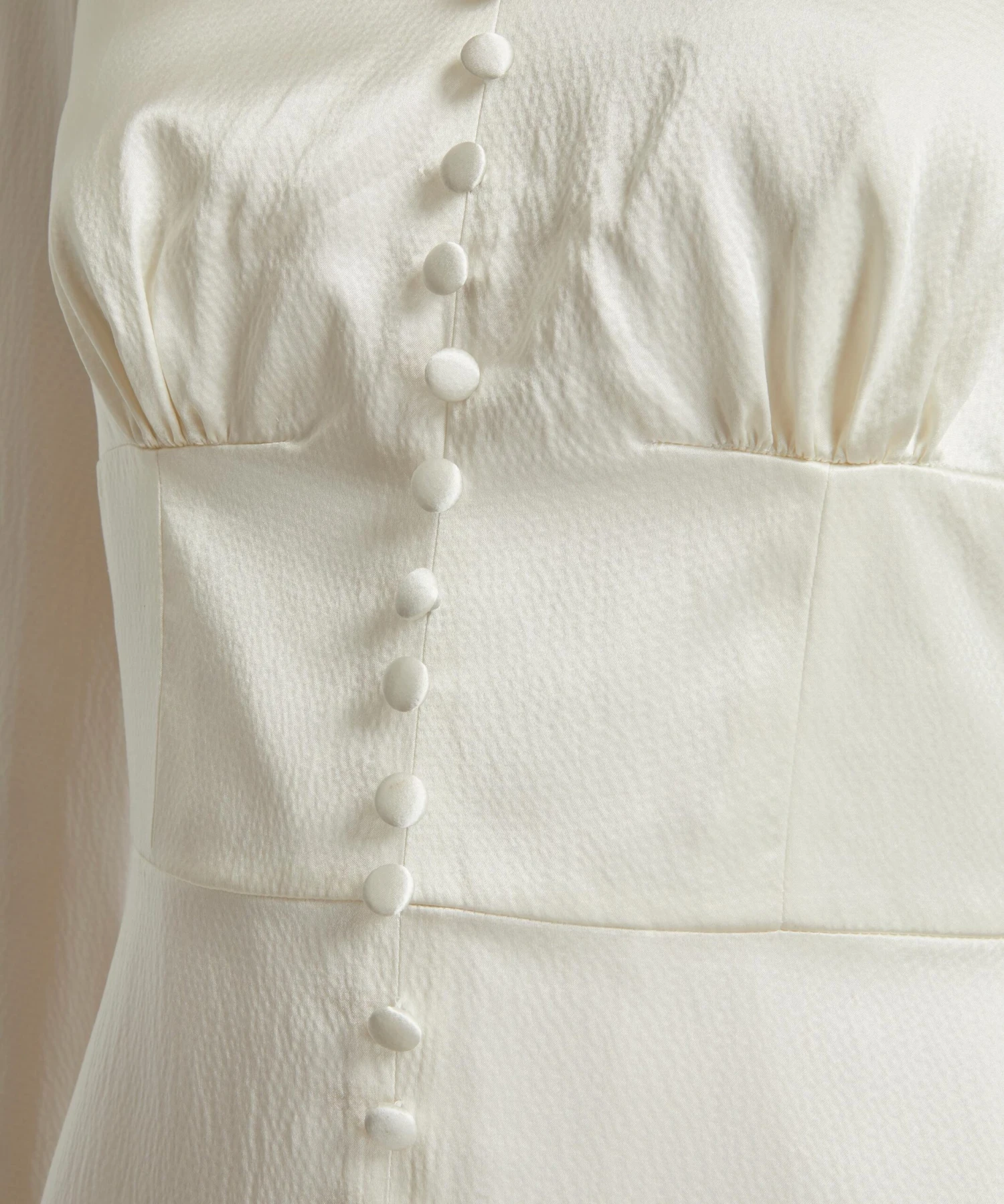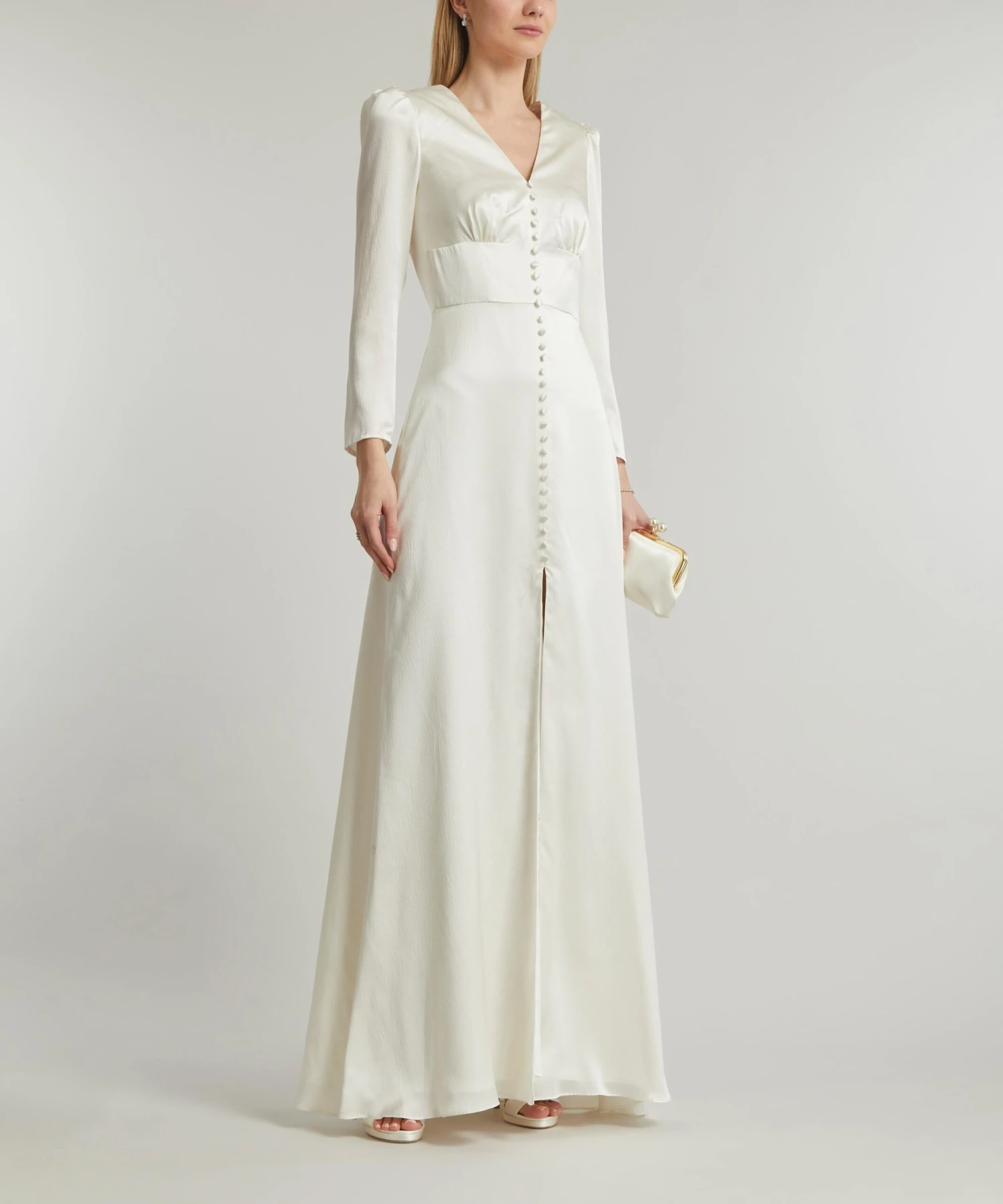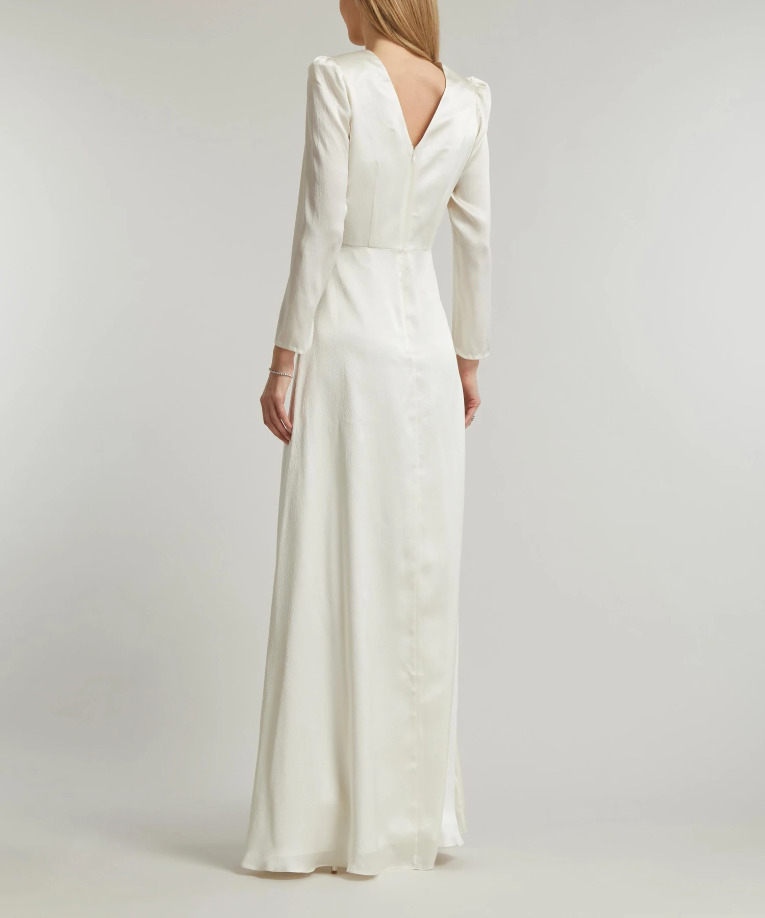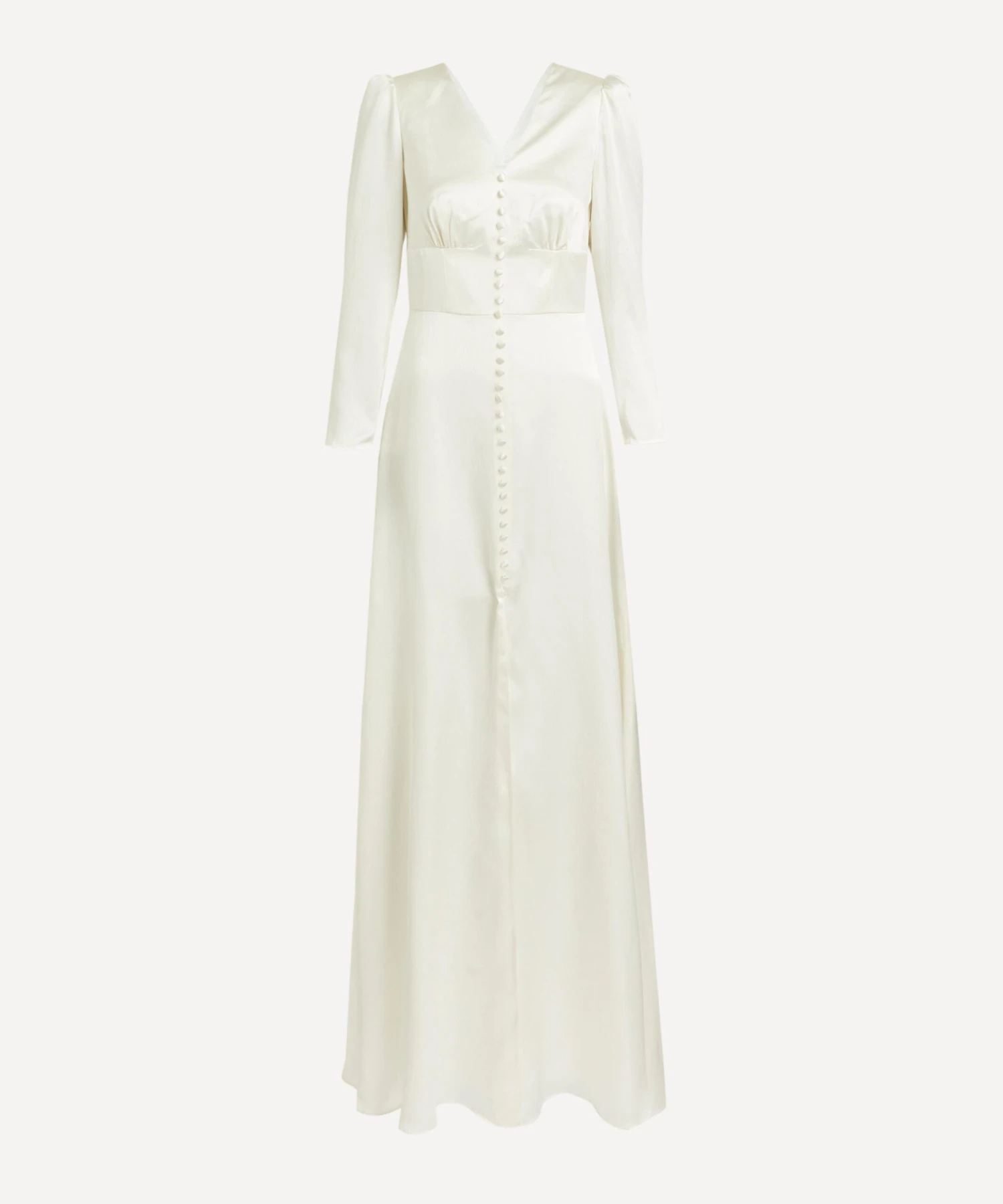 A signature style updated in luxuriously lustrous ivory silk, the Margot B Long dress from Saloni is the ultimate opulent choice for sartorial occasions. Classic in feel with an effortlessly contemporary silhouette, this full-length, fitted style has a half-buttoned placket and features an elegant V-neckline at the front and back, and sculptural long sleeves detailed with lightly puffed detailing at the shoulders for an authentic vintage finish.