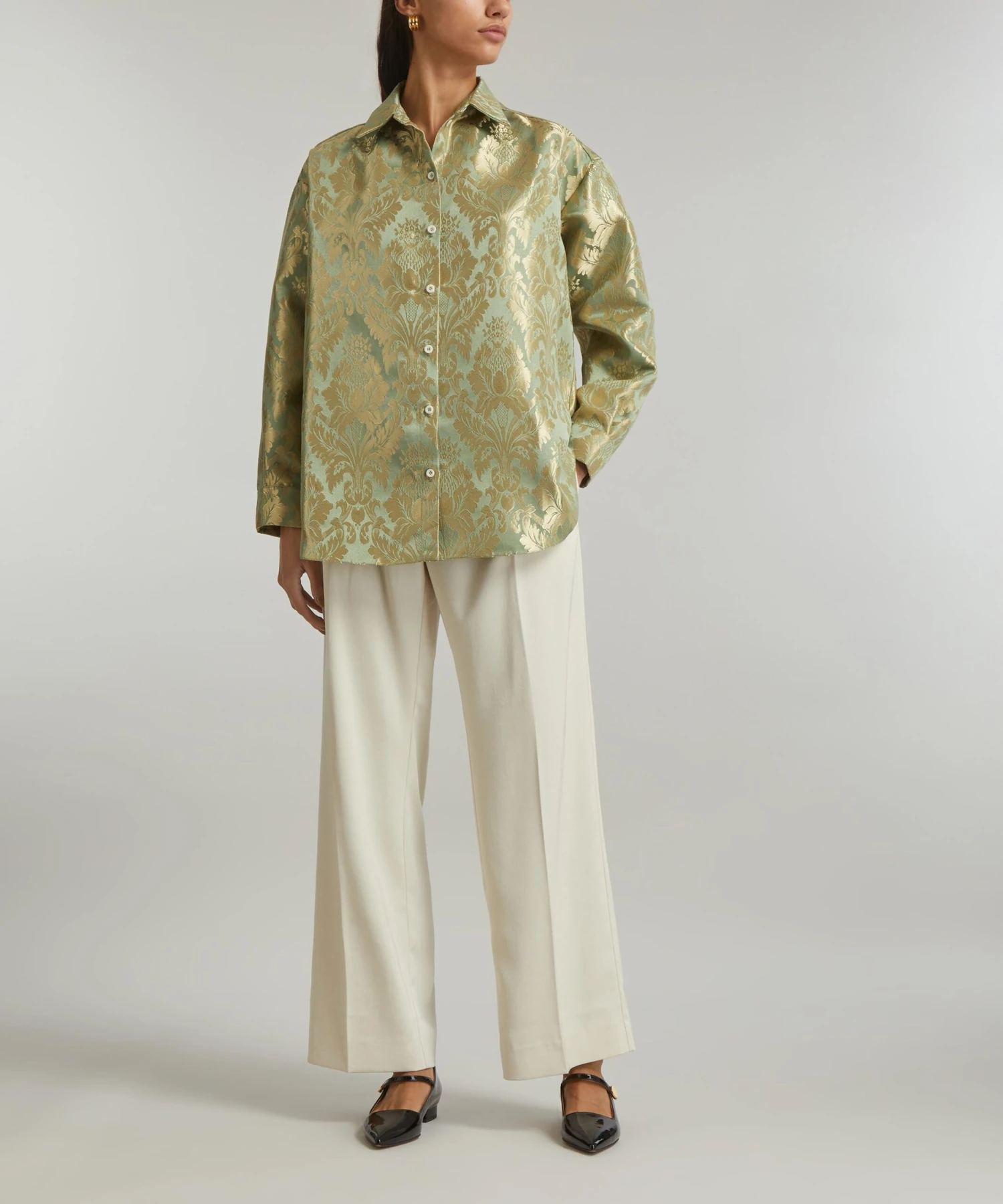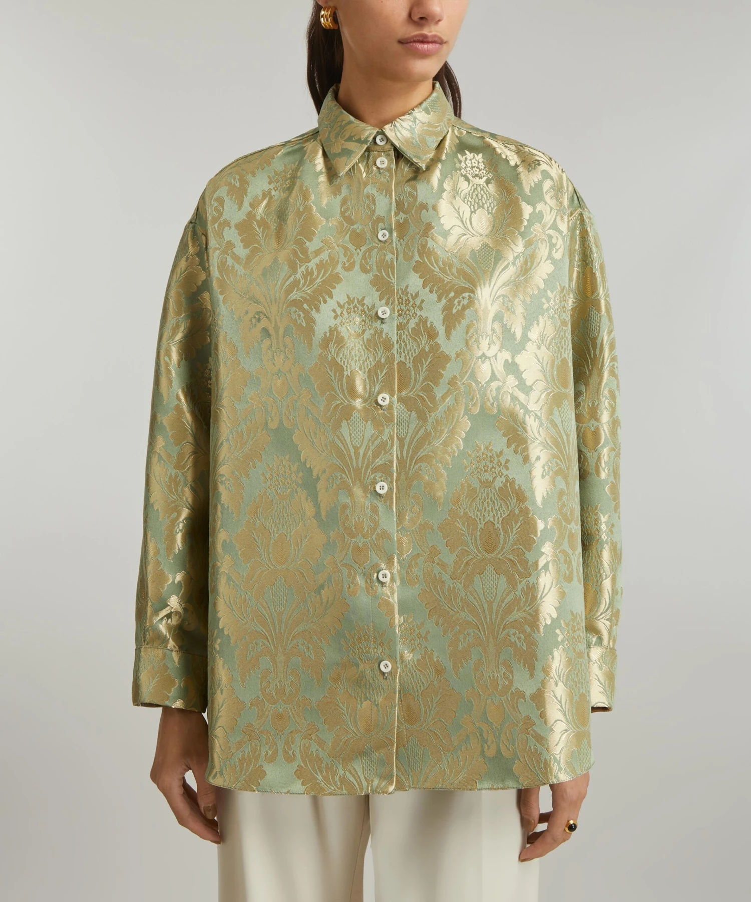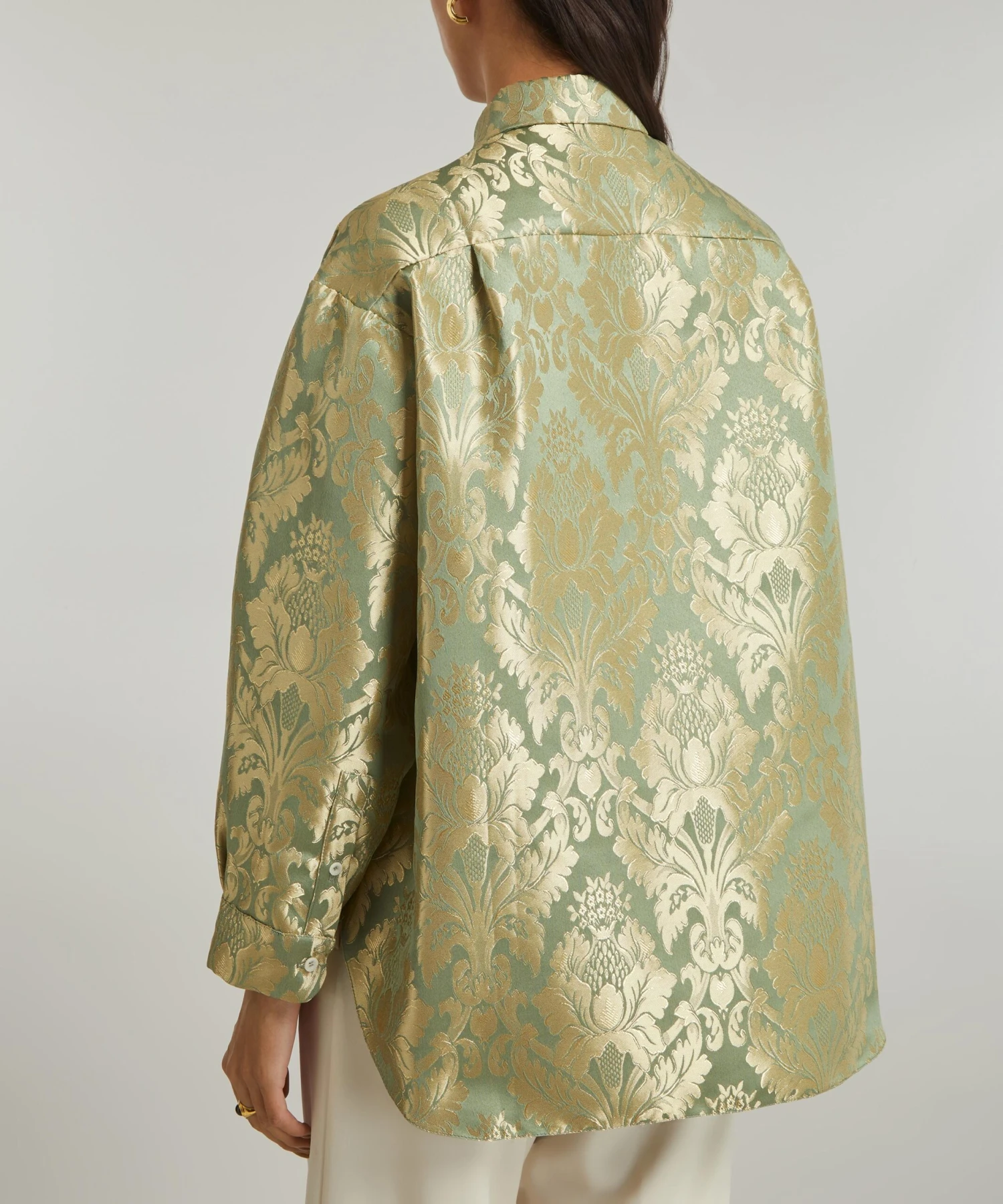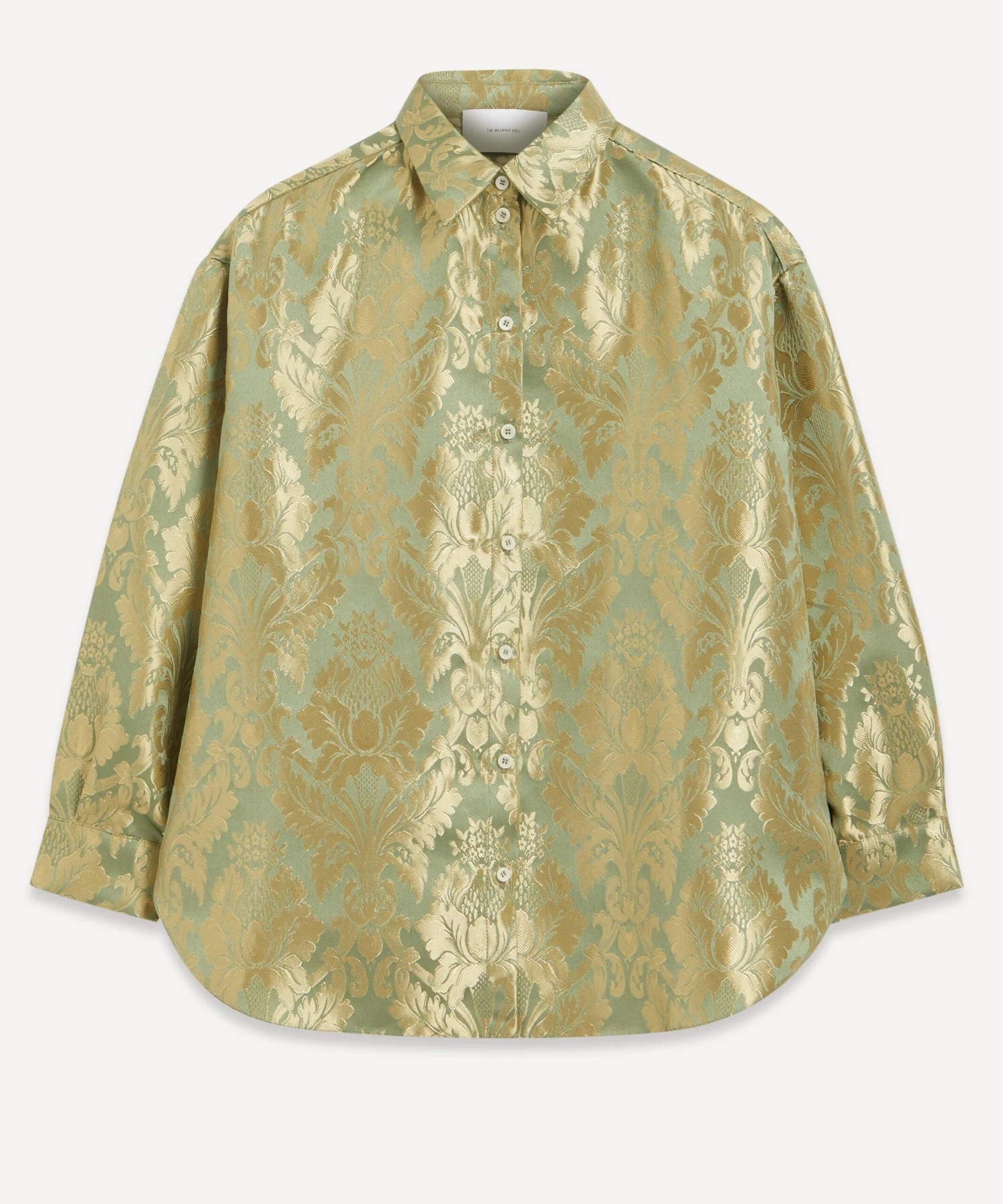 Crafted from deadstock jacquard-green damask, the Kenedy Shirt from THE MEANING WELL epitomises the London label’s commitment to creating luxurious, seasonless-collections sustainably. Boasting a boxy, oversized silhouette with its dropped shoulders and voluminous bouffant-sleeves, it features a point collar and buttoned closure for a tailored finish.