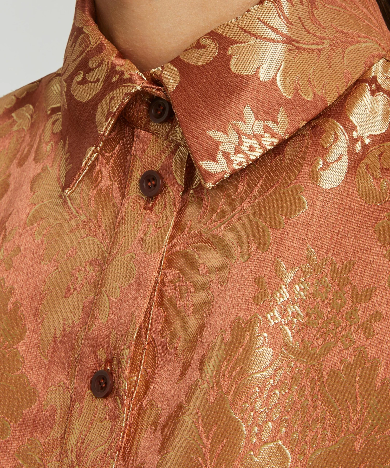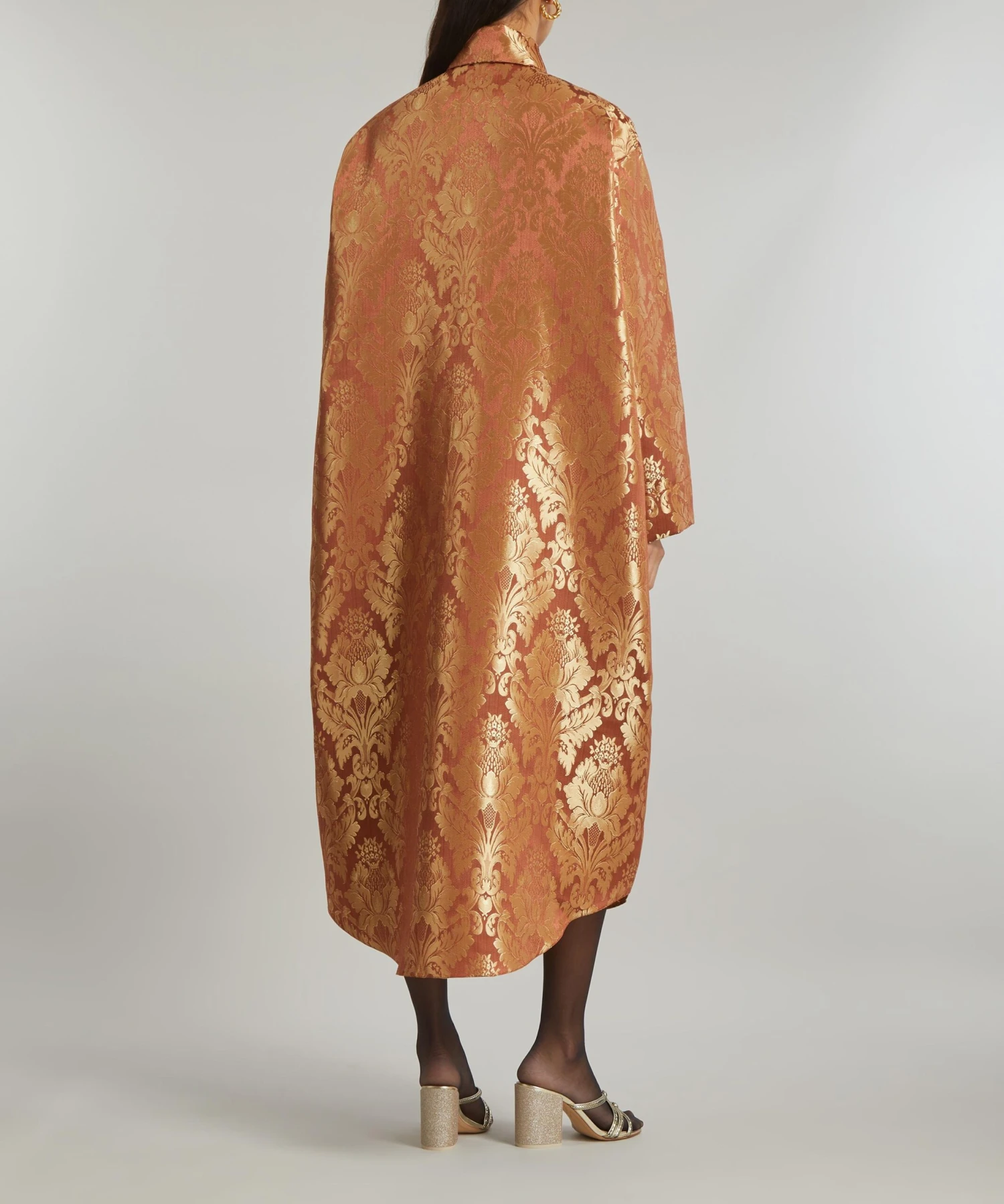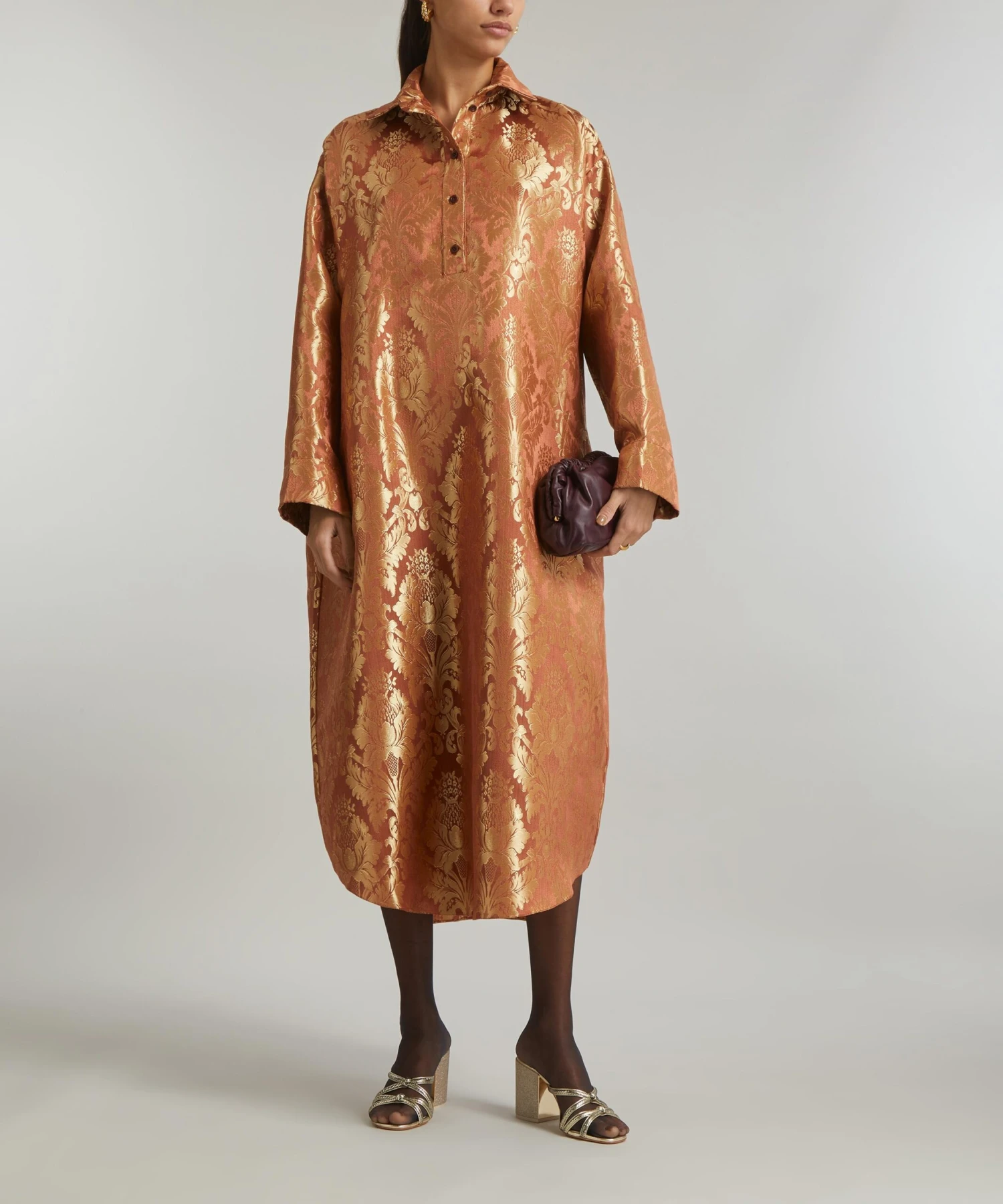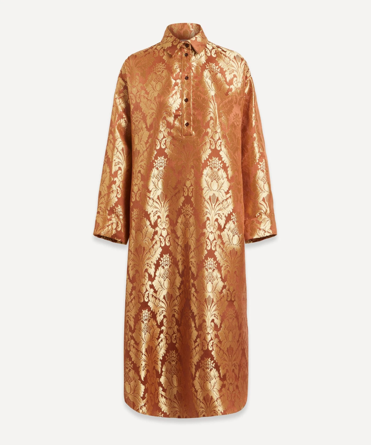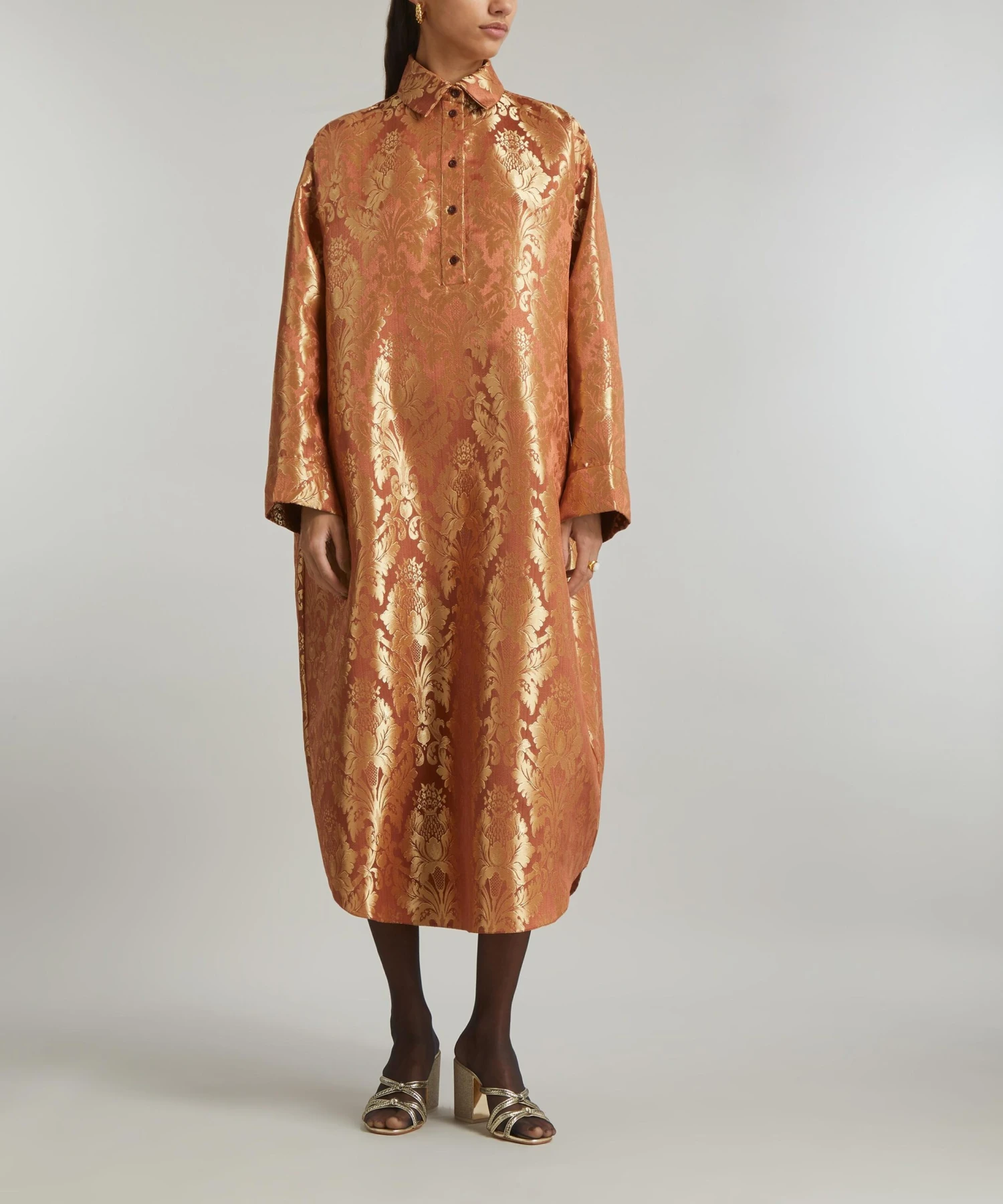 Crafted from deadstock jacquard-orange damask, the Anais Dress from THE MEANING WELL epitomises the London label’s commitment to creating luxurious, seasonless-collections sustainably. Boasting an oversized, tunic-inspired silhouette with its point collar and popover-placket, it has dropped shoulders and a rounded hem.