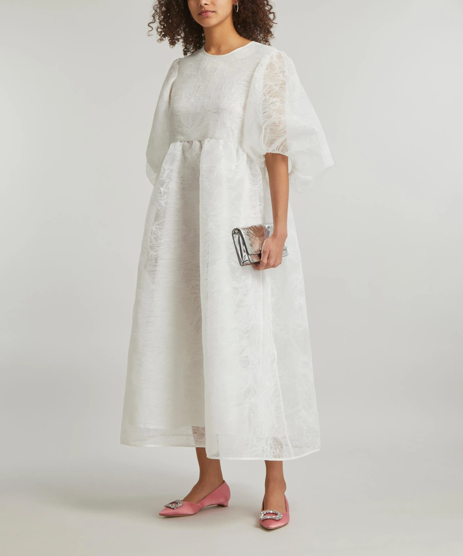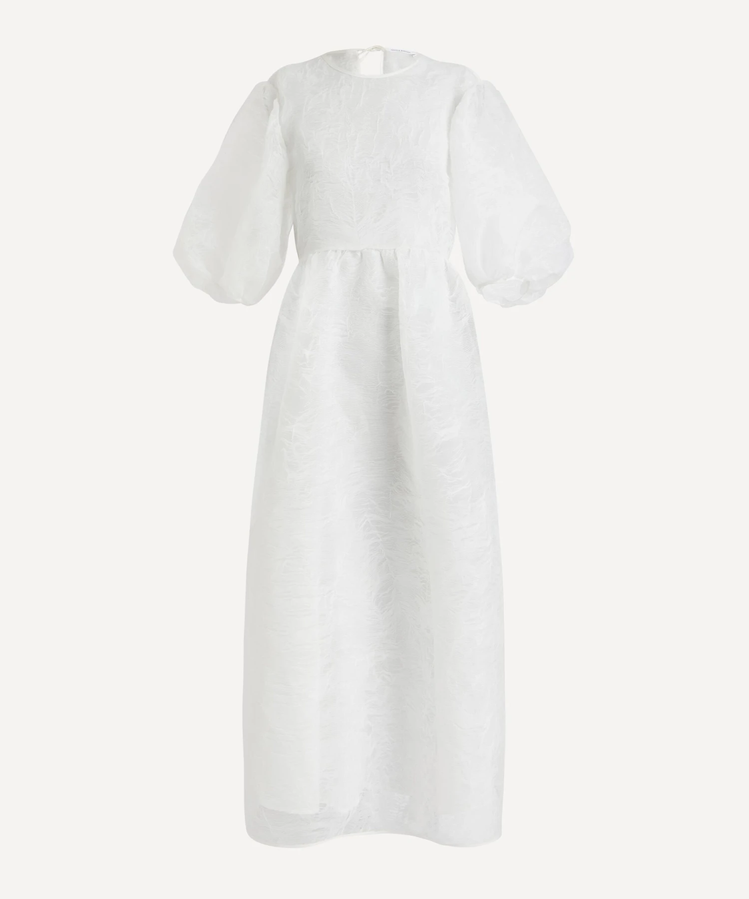 The Karmen dress from Cecilie Bahnsen embodies the designer’s alluring aesthetic for whimsical silhouettes with a sculptural edge. A studied take on feminine volume with its puffed bracelet-sleeves and flared, full-skirt, it’s crafted from sheer sierra matelassé for a delicate finish.