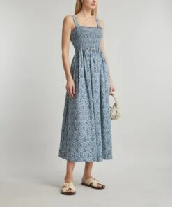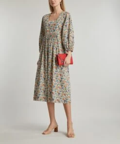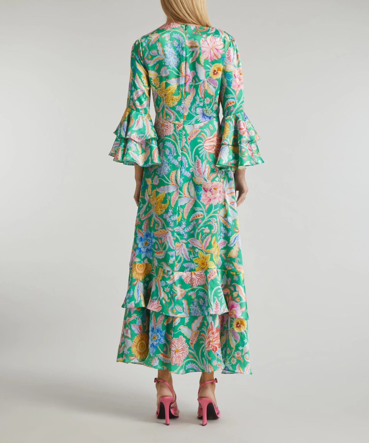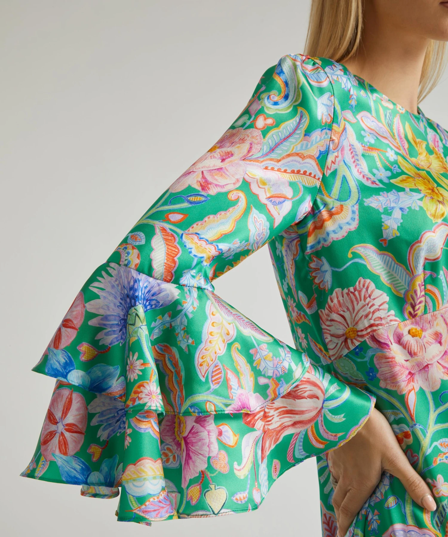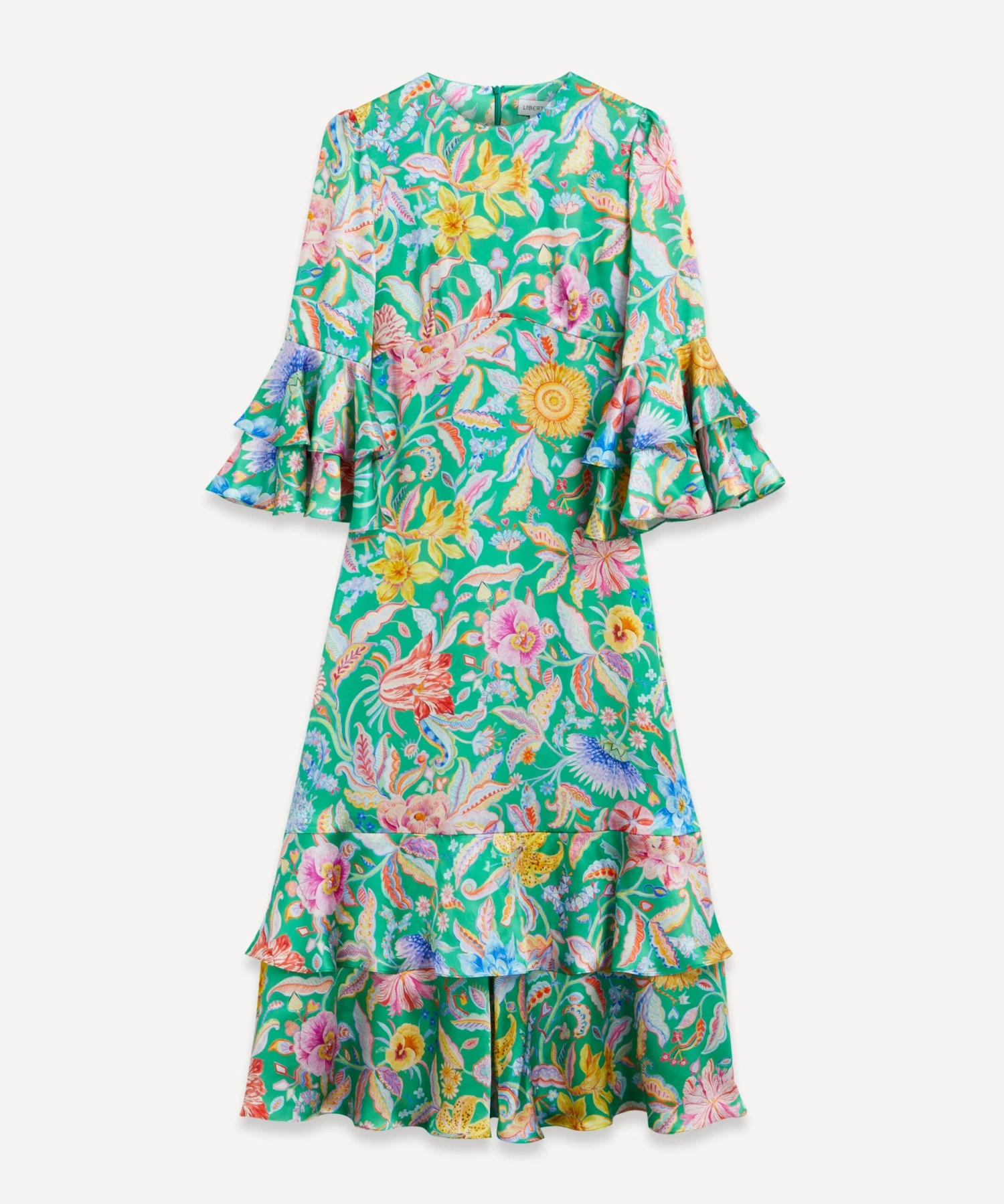 The Gala dress is made using fabric printed in Italy at the Liberty Printing Mill and features an empire waistline, delicate tier detailing and pagoda sleeves for an effortless, longline silhouette. The dress features our Garden of Reverie print – a surreal Tree of Life drawn in soft pencil crayon, inspired by Alice’s Adventures Through the Looking Glass and the garden of talking flowers she encounters there. This print is full of vibrant pattern and charm, including sunflowers, tulips, roses, pansies, lilacs, daffodils and lilies. Amp up the drama of this dress with a statement heel or let the print stand out by pairing with minimal accessories for a sleek event look.