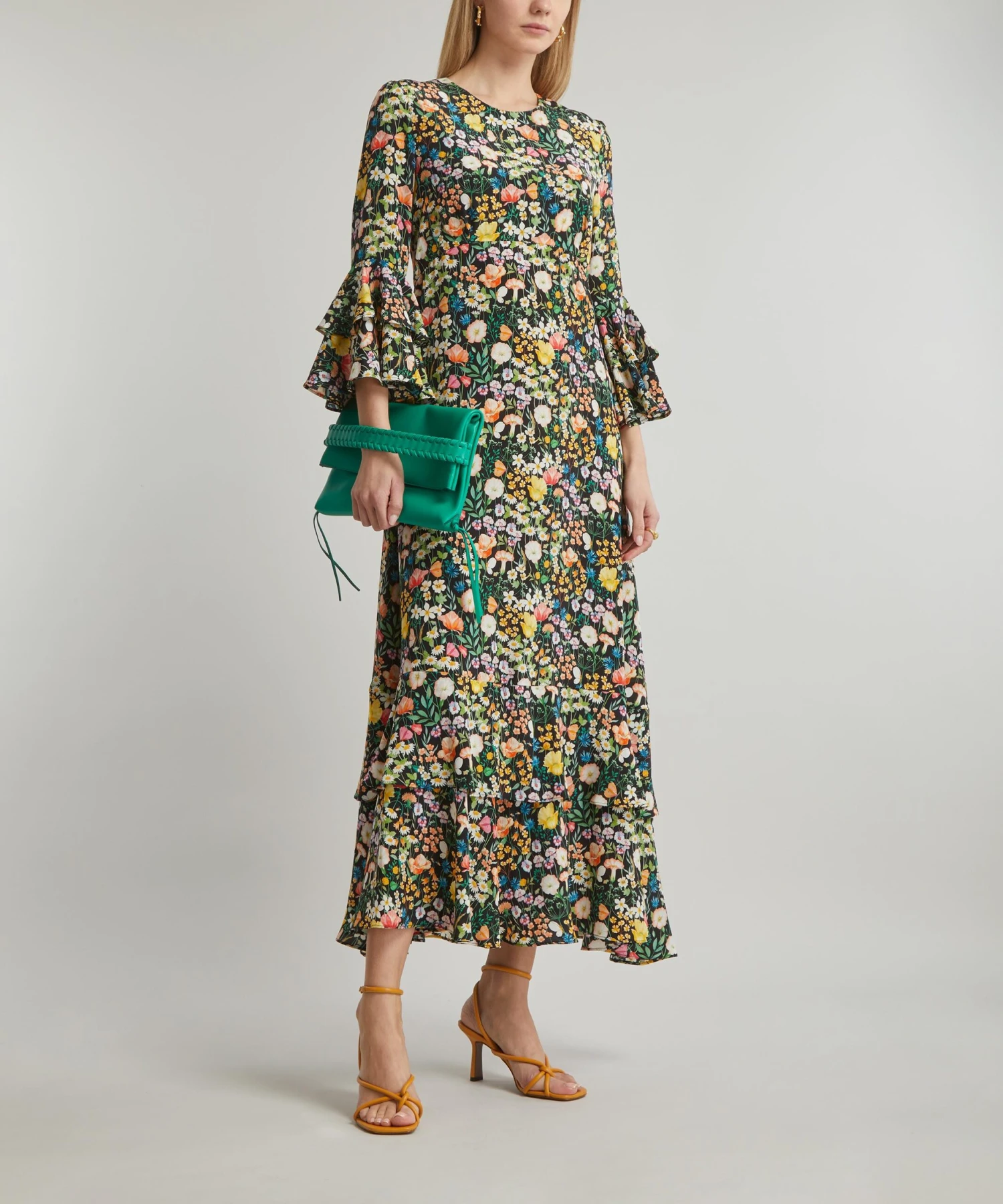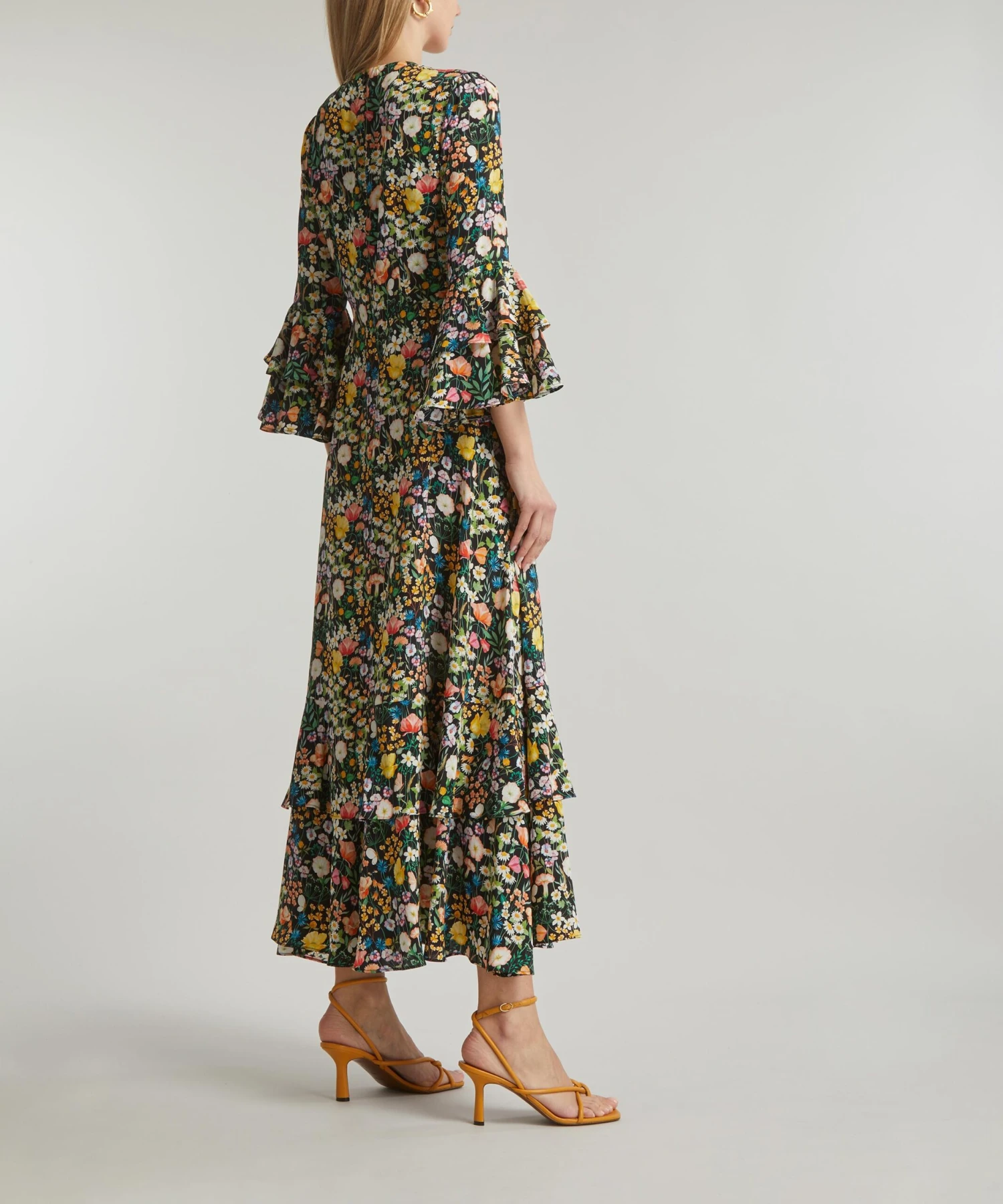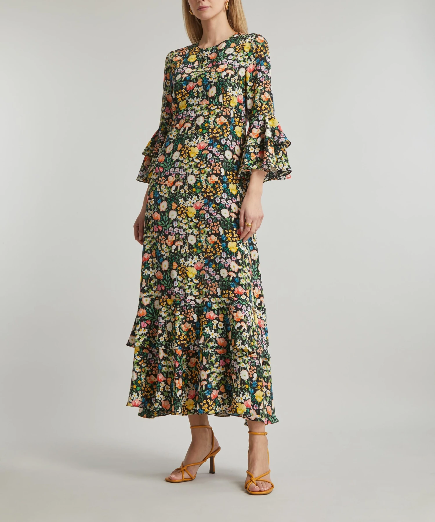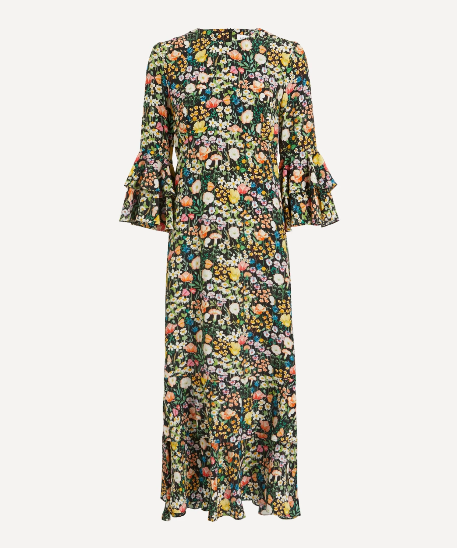 The Gala dress is made using fabric printed in Italy at the Liberty Printing Mill and features an empire waistline, delicate tier detailing and pagoda sleeves for an effortless, longline silhouette. The dress features our Jude’s Floral print – created in watercolour paints, British wildflowers including: daisies, buttercups, poppies, violets, apple blossom, cornflowers, harebells, red campions and geraniums, alongside various grasses, populate this botanical design. Amp up the drama of this dress with a statement heel or let the print stand out by pairing with minimal accessories for a sleek event look.