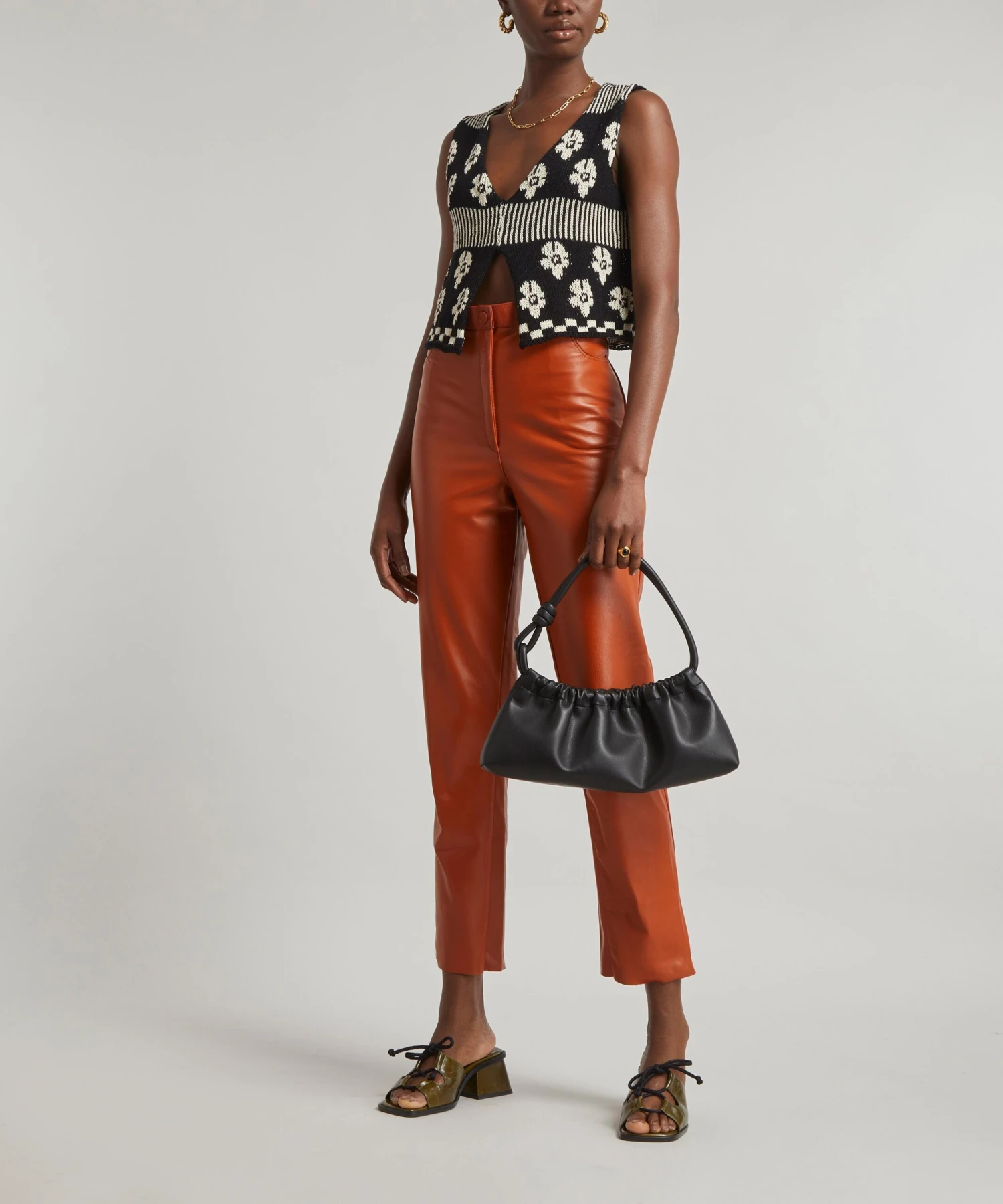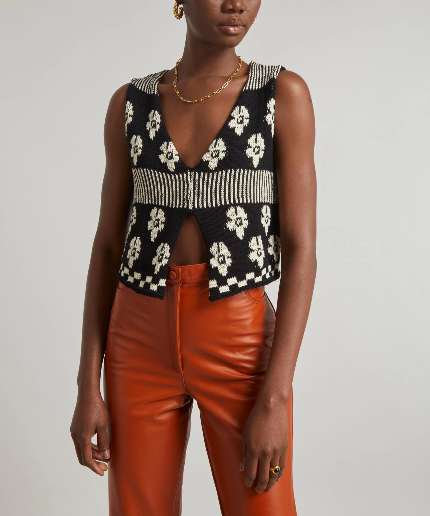Designed and handmade in Uruguay, the Loreza top is crafted from cotton and expertly tailored to a cropped cut with a monochrome, knitted jacquard pattern featuring an eclectic medley of stripes, checks and flowers. A sleeveless style, it has a flattering V-neckline and a V-shaped cut-out across the hem. Brimming with a bohemian edge, team the Loreza with cropped leather trousers and a pair of chunky-mules for a retro-finish.