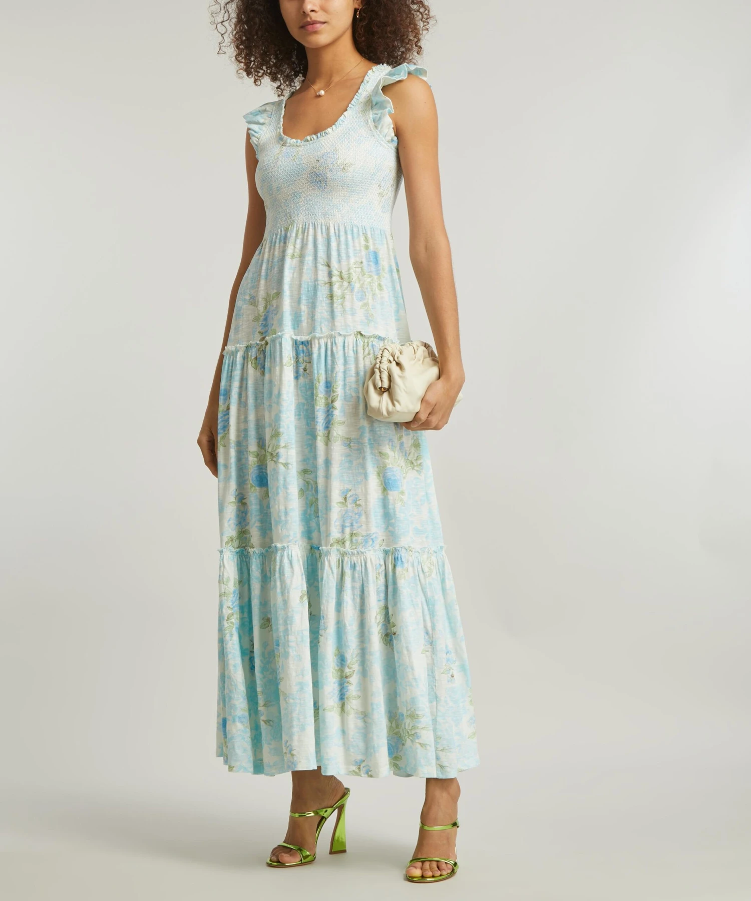 p> Effortlessly romantic with its frills and floral detail, the Chessie maxi-dress from LoveShackFancy showcases the relaxed bohemian spirit of the New York City-based brand. A signature style updated for the new season in the Baby Blue Promise rose print, this airy cotton dress has a fluttery, ruffled short-sleeves and a fitted smocked bodice that flounces into a dreamy, tiered skirt for whimsy finish.