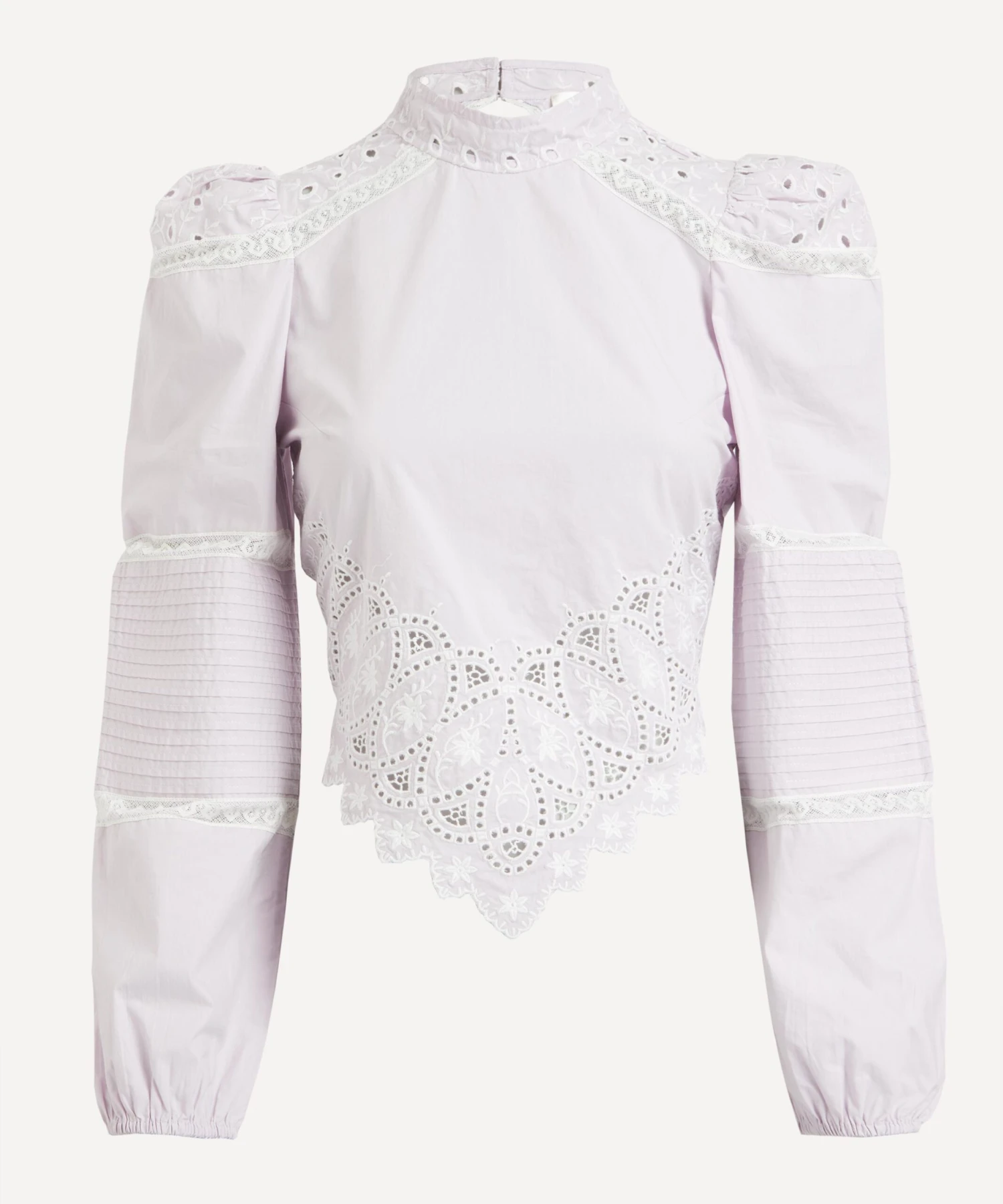 Effortlessly romantic with its dainty lace detail, the Hito Handkerchief top from LoveShackFancy showcases the relaxed bohemian spirit of the New York City-based brand. Crafted from cotton, this Edwardian-inspired blouse has a traditional banded collar, puffed blouson-sleeves and a flirty open-back, complete with an intricate floral eyelet trim across its pointed handkerchief hem for a whimsy finish.