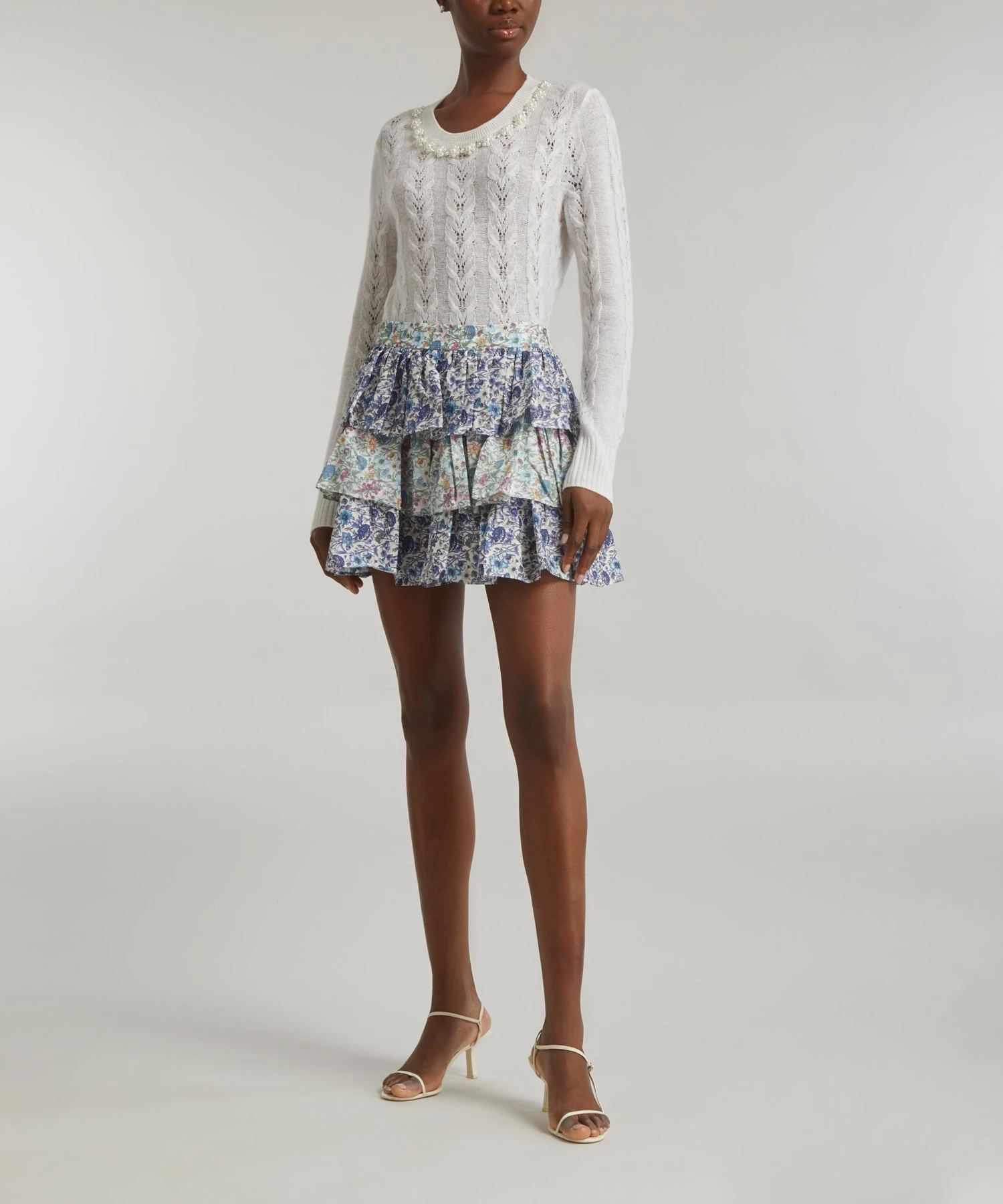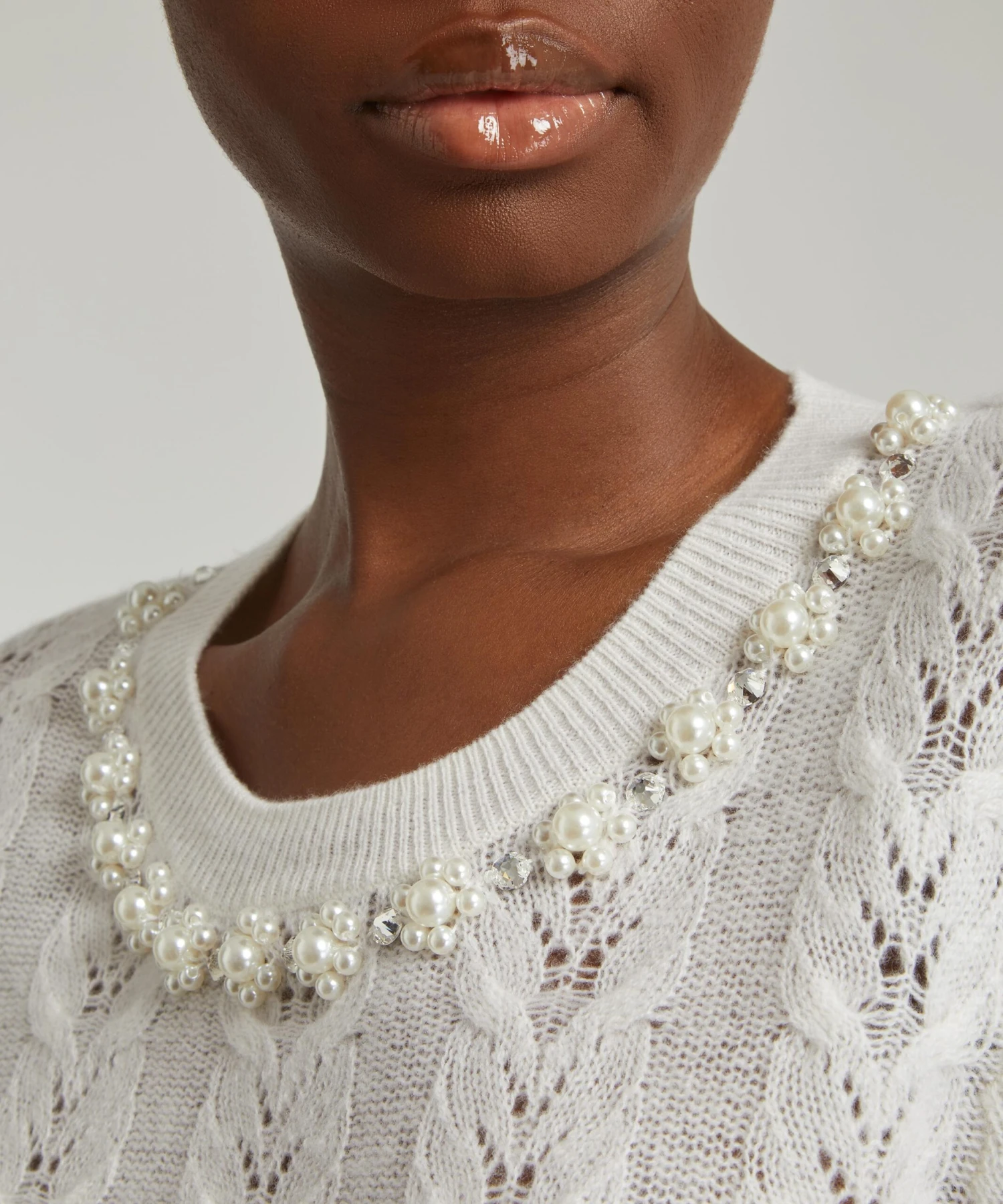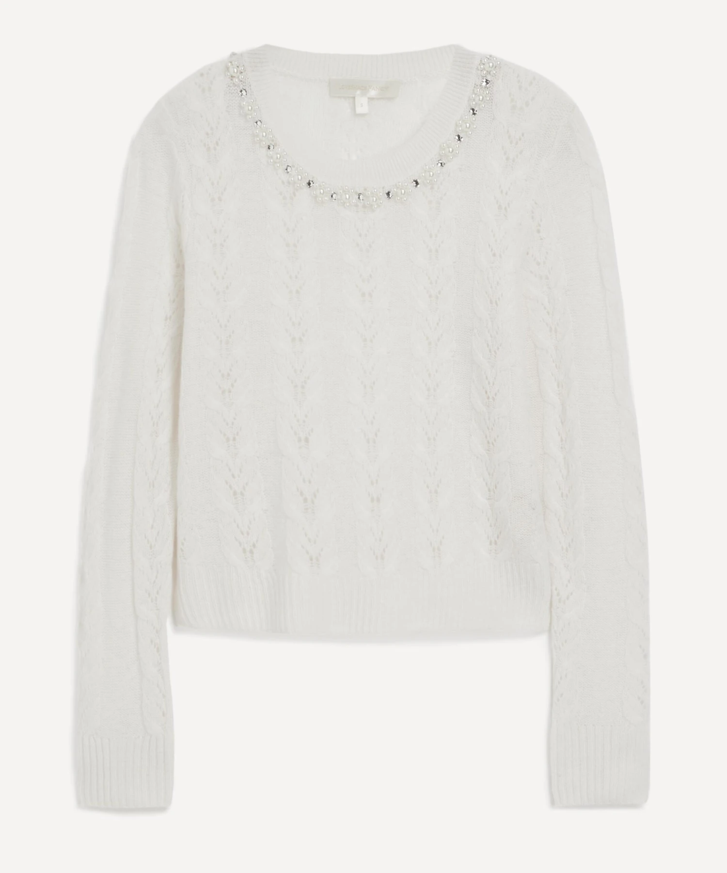 Effortlessly chic with its intricate pearl and diamanté-embellished neckline, the Linus Pullover sweater from LoveShackFancy showcases the relaxed bohemian spirit of the New York City-based bran.