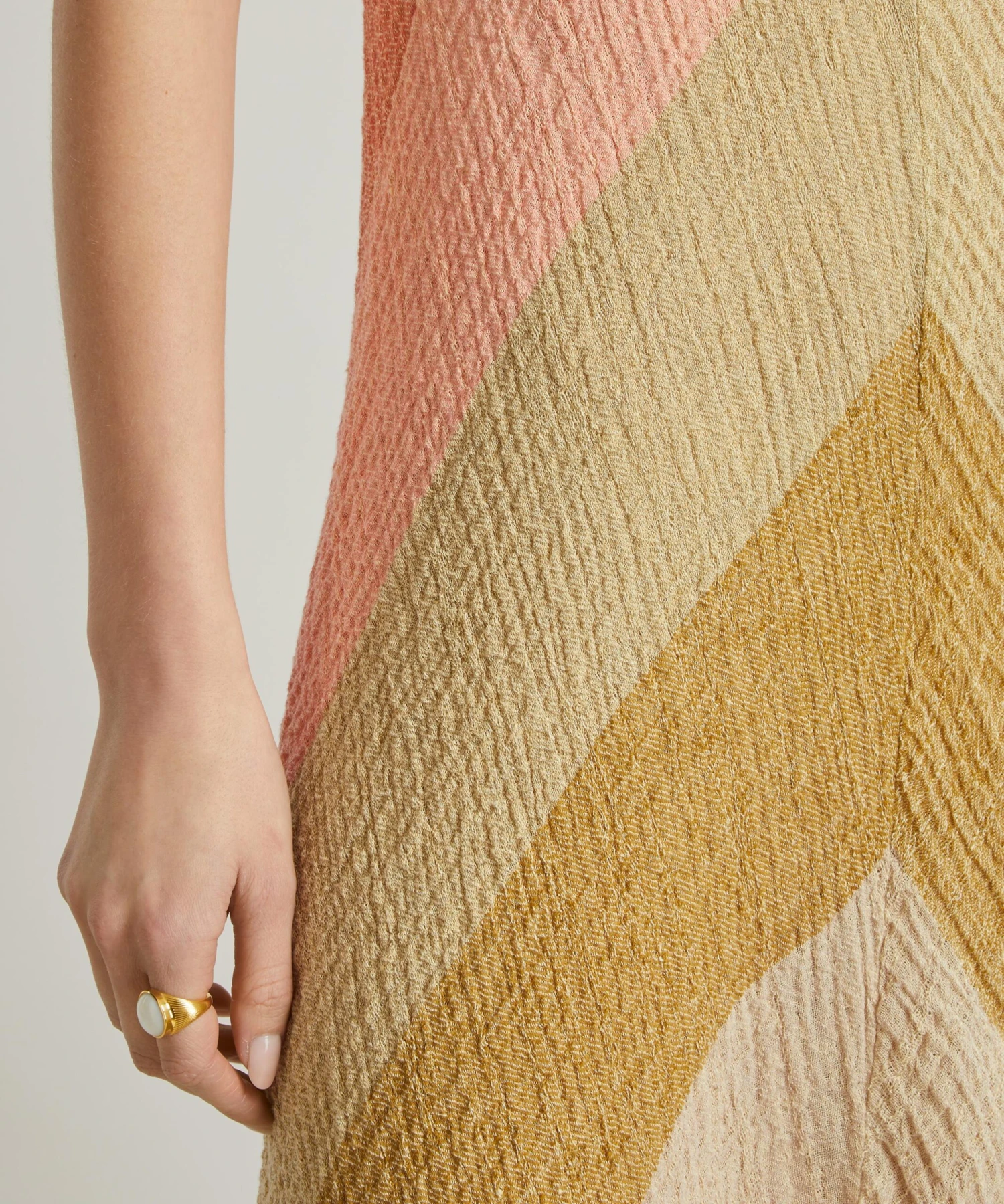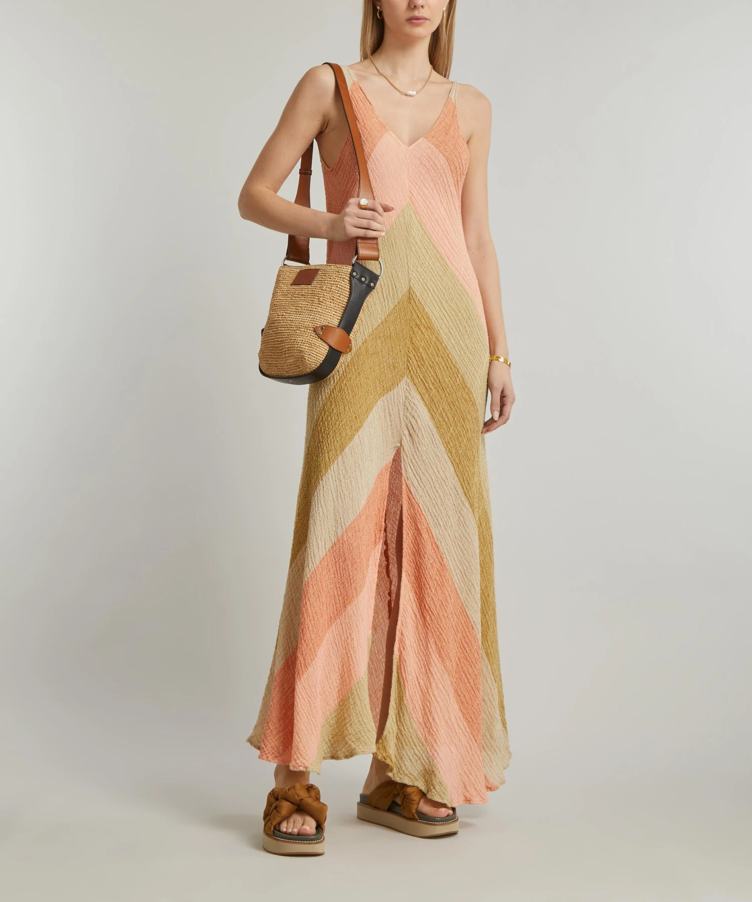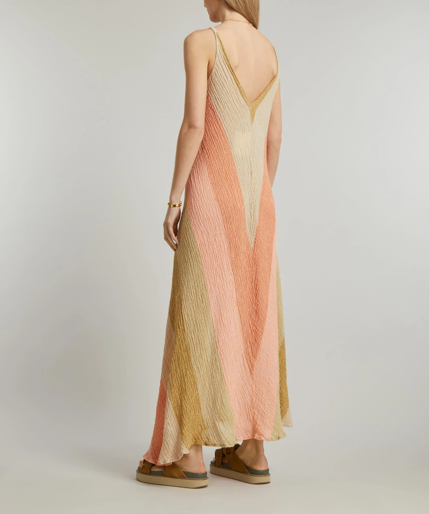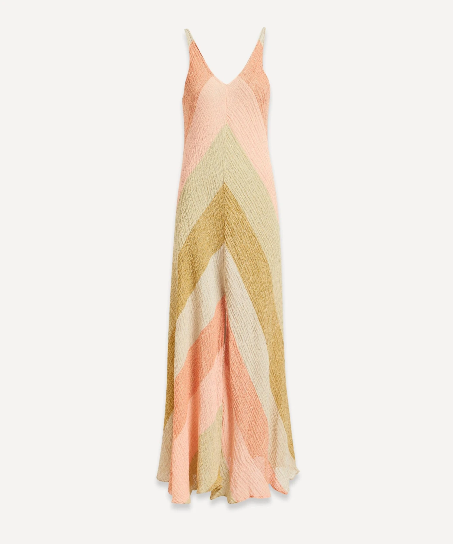 The Salvora maxi-dress demonstrate Spanish label Masscob’s lavish craftmanship and cautious eye-for-detail. In a tonal coral asymmetric striped design, its crafted from a loose and lightweight linen-blend for a flowy, floor-length silhouette featuring a plunging V-neckline and a central slit at the hem.