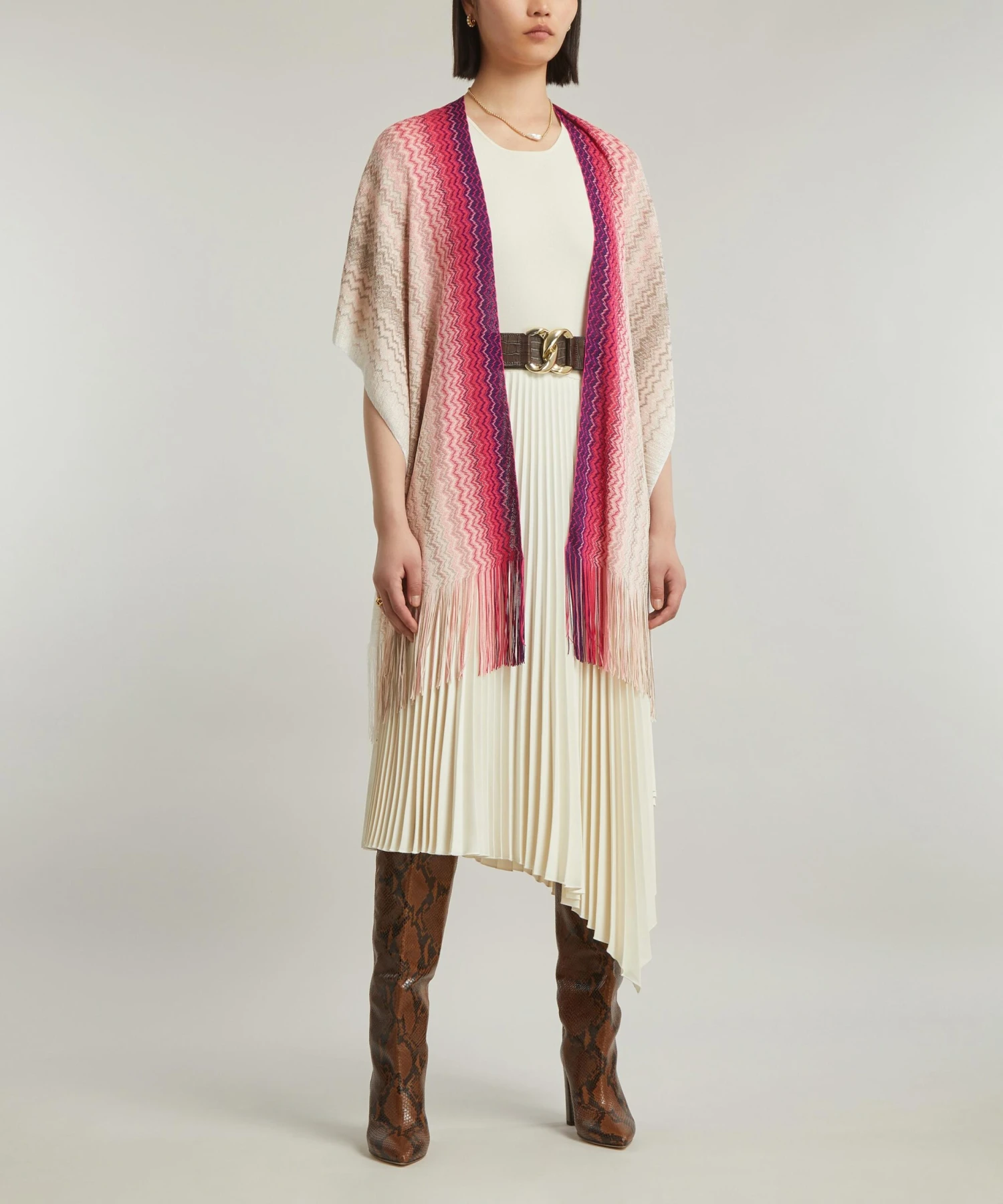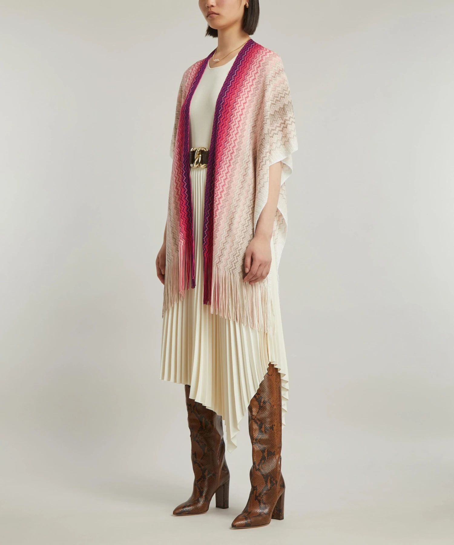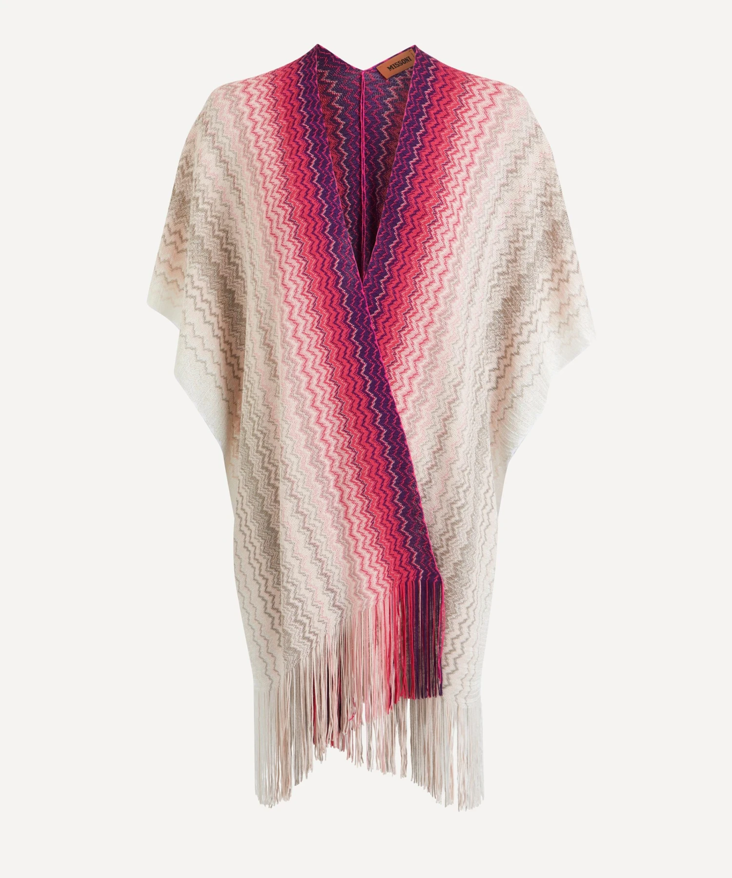 Featuring a striking, all-over zig zag effect, this woven cape from Missoni pays homage to the label’s inimitable vision and artistic flair. Showcasing an intricately knitted, fluid silhouette featuring flowy dolman-sleeves, an open front and an asymmetric fringed hem, its pink ombré pattern brims with vivacity – perfect for adding an effortless pop of colour to your off-duty edit.