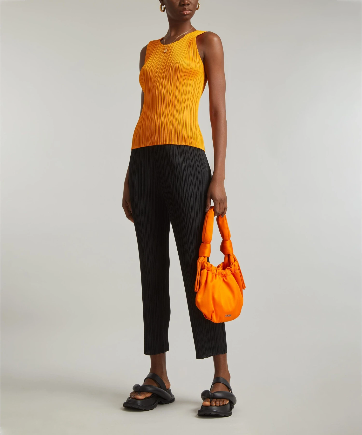 A signature style showcasing Issey Miyake’s innovative pleating technique, the May edition of MONTHLY COLOURS presents simple silhouettes in a variety of soft nuanced colours, with the additions of vivid orange and green.