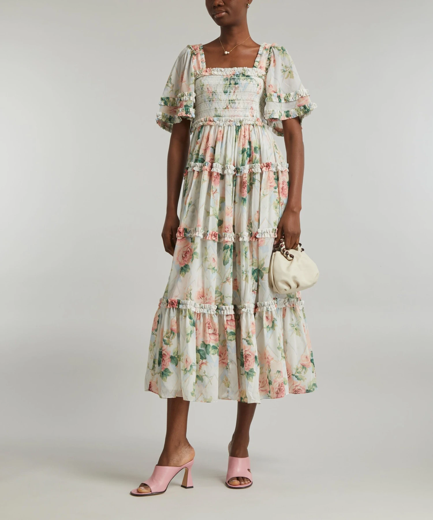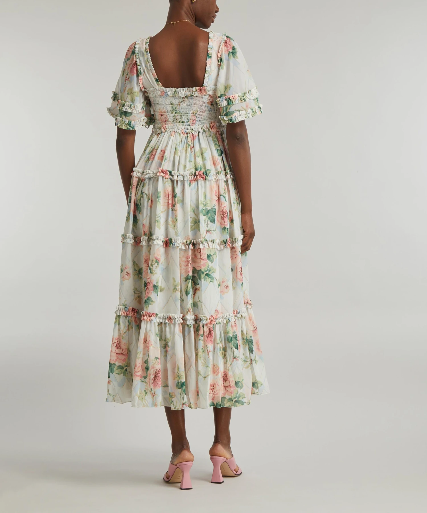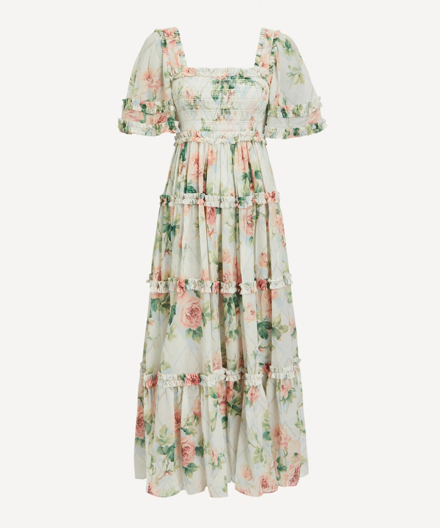 Constructed from soft, chiffon textile decorated with printed ruffles, this breezy midi-dress exudes elegance with its flattering square neckline, embroidered smocked bodice and fluttery short sleeves. Wearable for weddings or weekend soirées, pair it with pearls and pink heels for an effortlessly chic ensemble.