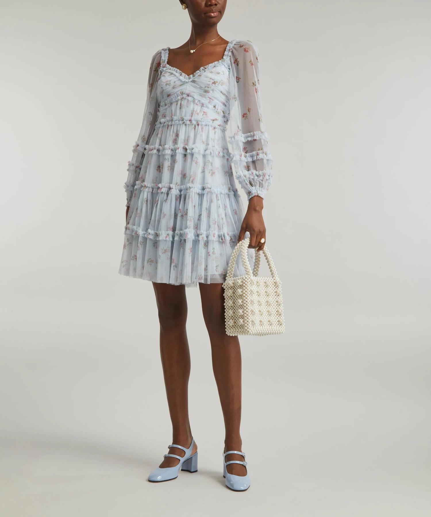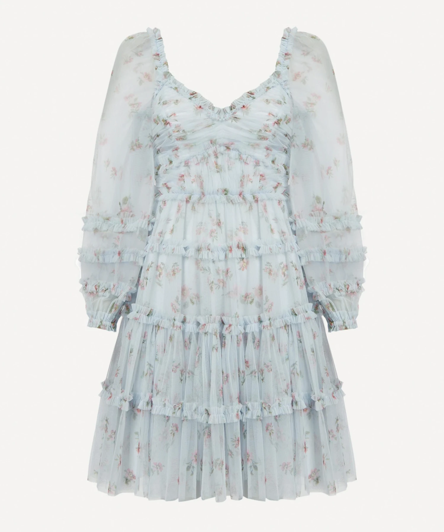Constructed from printed, cornflower-blue tulle featuring intricate ruffles engineered throughout, this flowy mini-dress boasts a flattering A-line silhouette designed with long sheer sleeves, and a lined bodice featuring a sweetheart neckline and gathered panels for a fitted finish. Wearable for weddings or weekend soirées, pair it with patent blue Mary-Jane pumps and a pearl-embellished bag for an effortlessly chic ensemble.