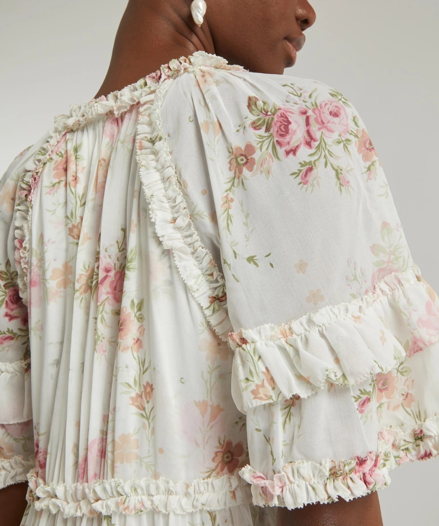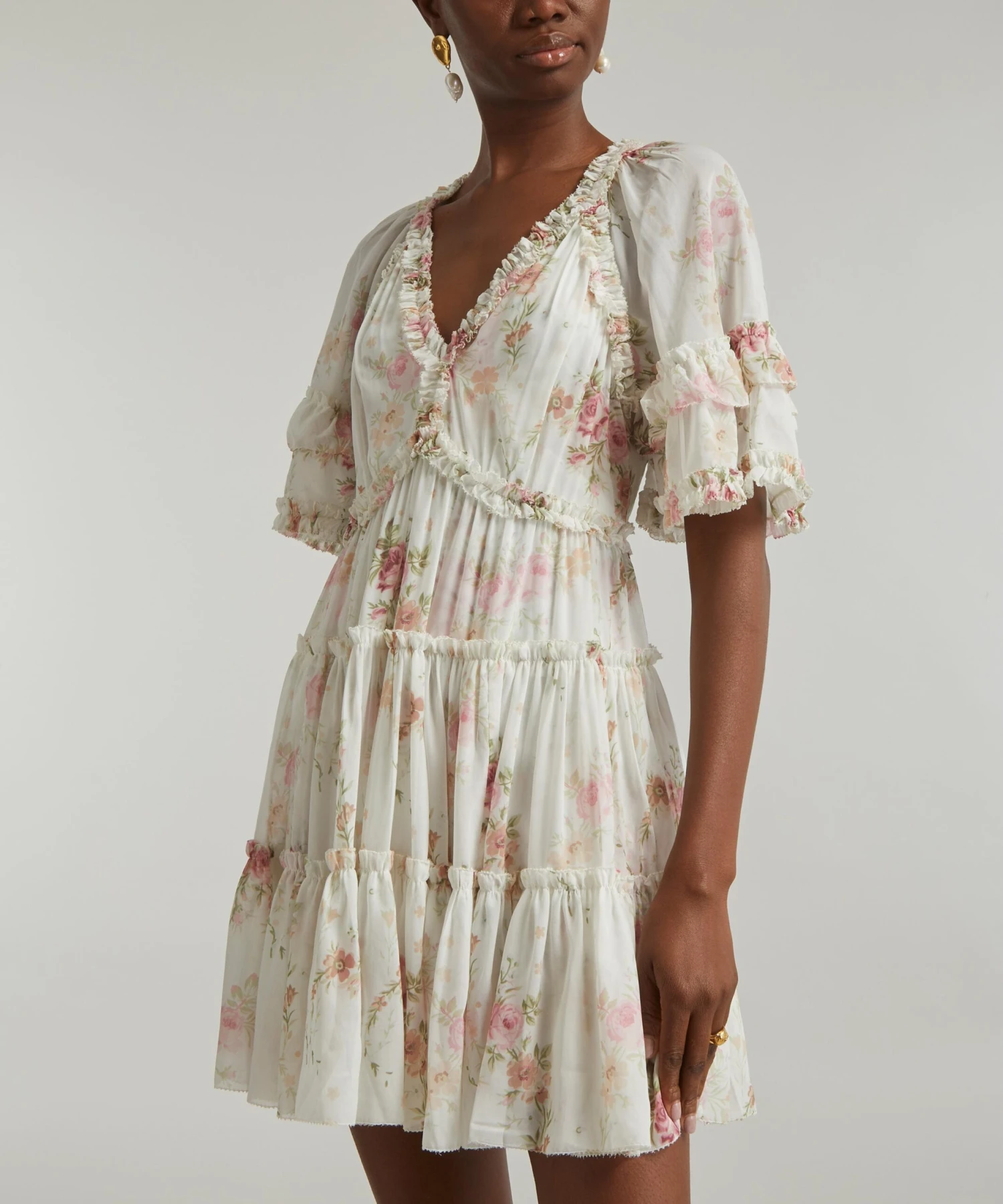Constructed from printed chiffon decorated with layers of ruffles, this flowy mini-dress boasts a voluminous silhouette complete with a flattering V-neckline, and a relaxed empire waist. Wearable for weddings or weekend soirées, pair it with pearl earrings and statement sandals for an effortlessly chic ensemble.
