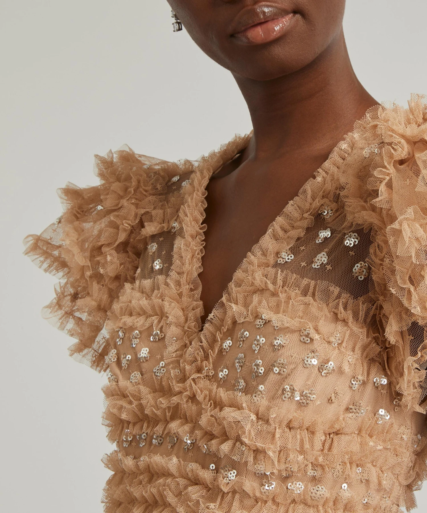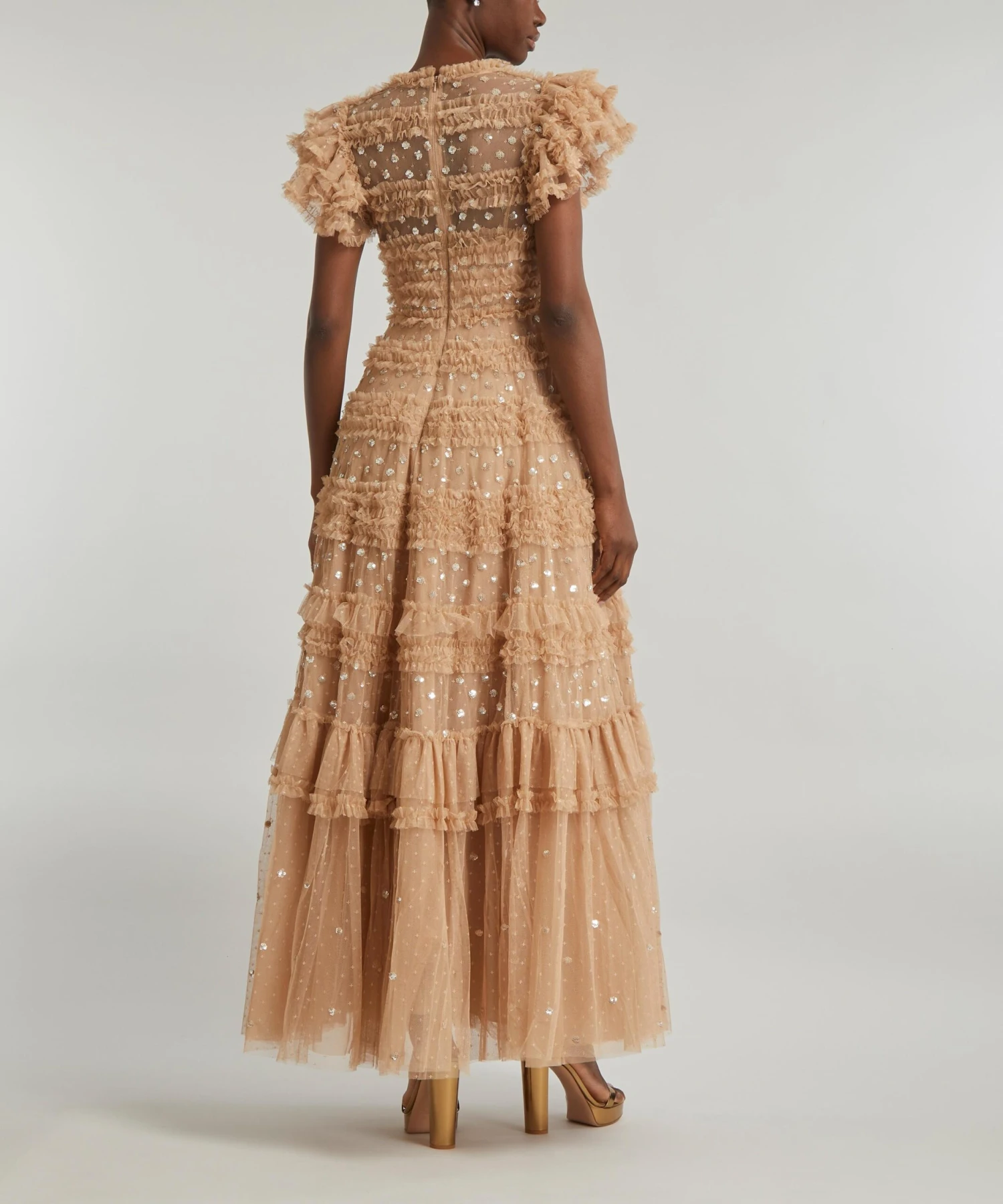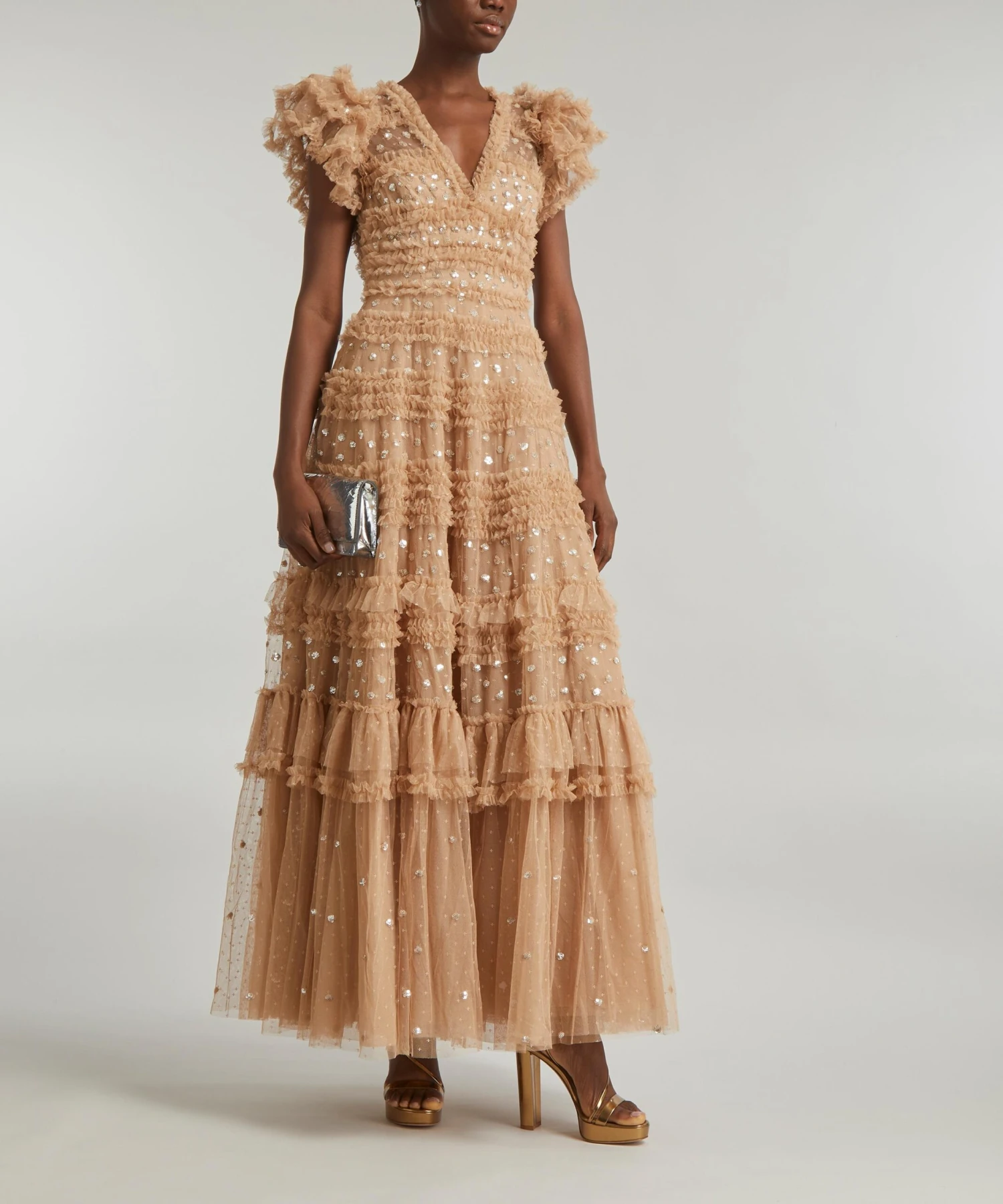 Constructed from signature kisses tulle adorned with ruffles and tonal sequin polka-dot motifs scattered throughout for a sparkling effect, this soft-caramel maxi-dress boasts an A-line silhouette, and a partially lined bodice featuring fluttery cap sleeves, and a flattering V-neckline. Wearable for weddings or weekend soirées, pair it with pearl earrings and gold platform heels for an effortlessly chic ensemble.