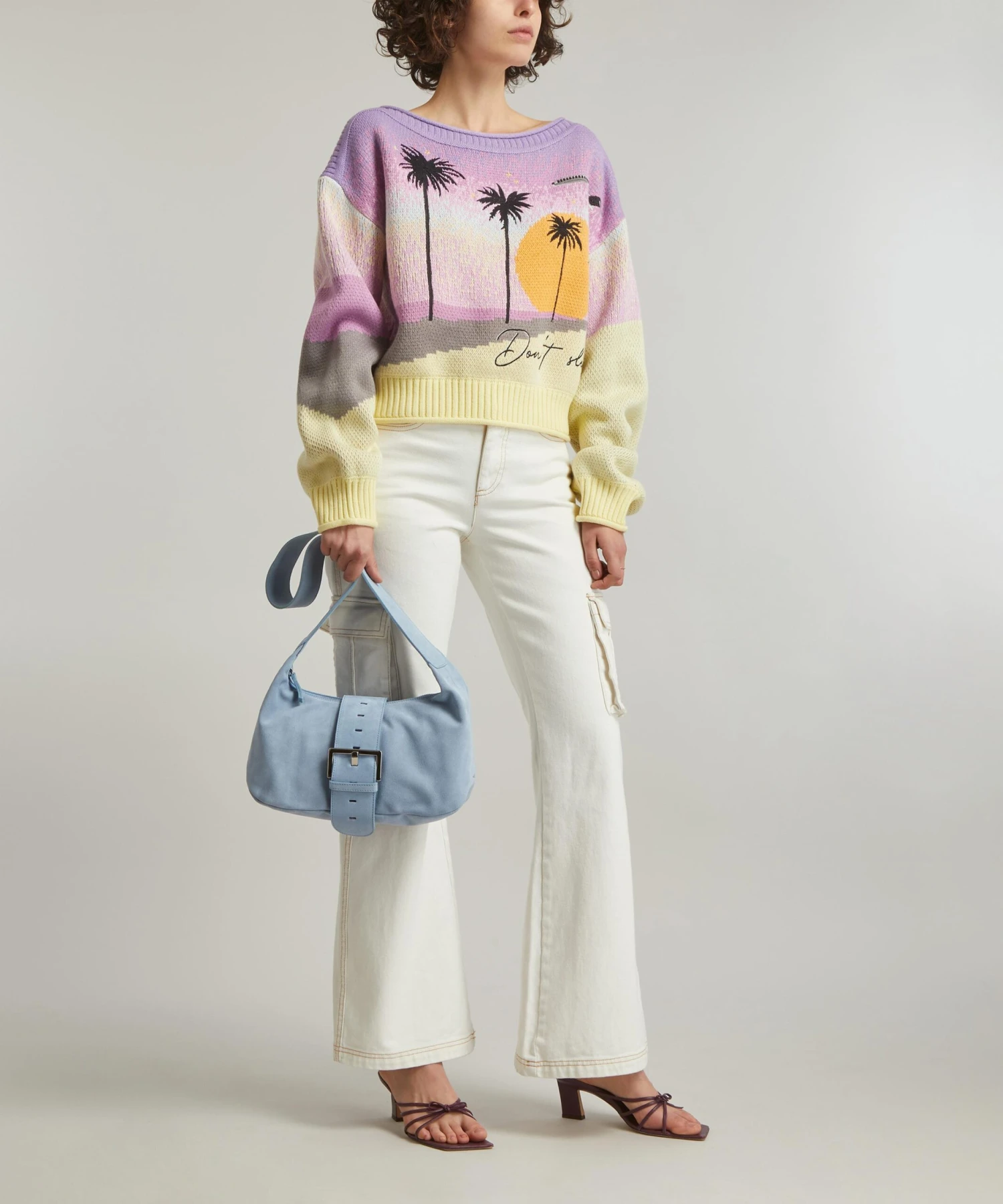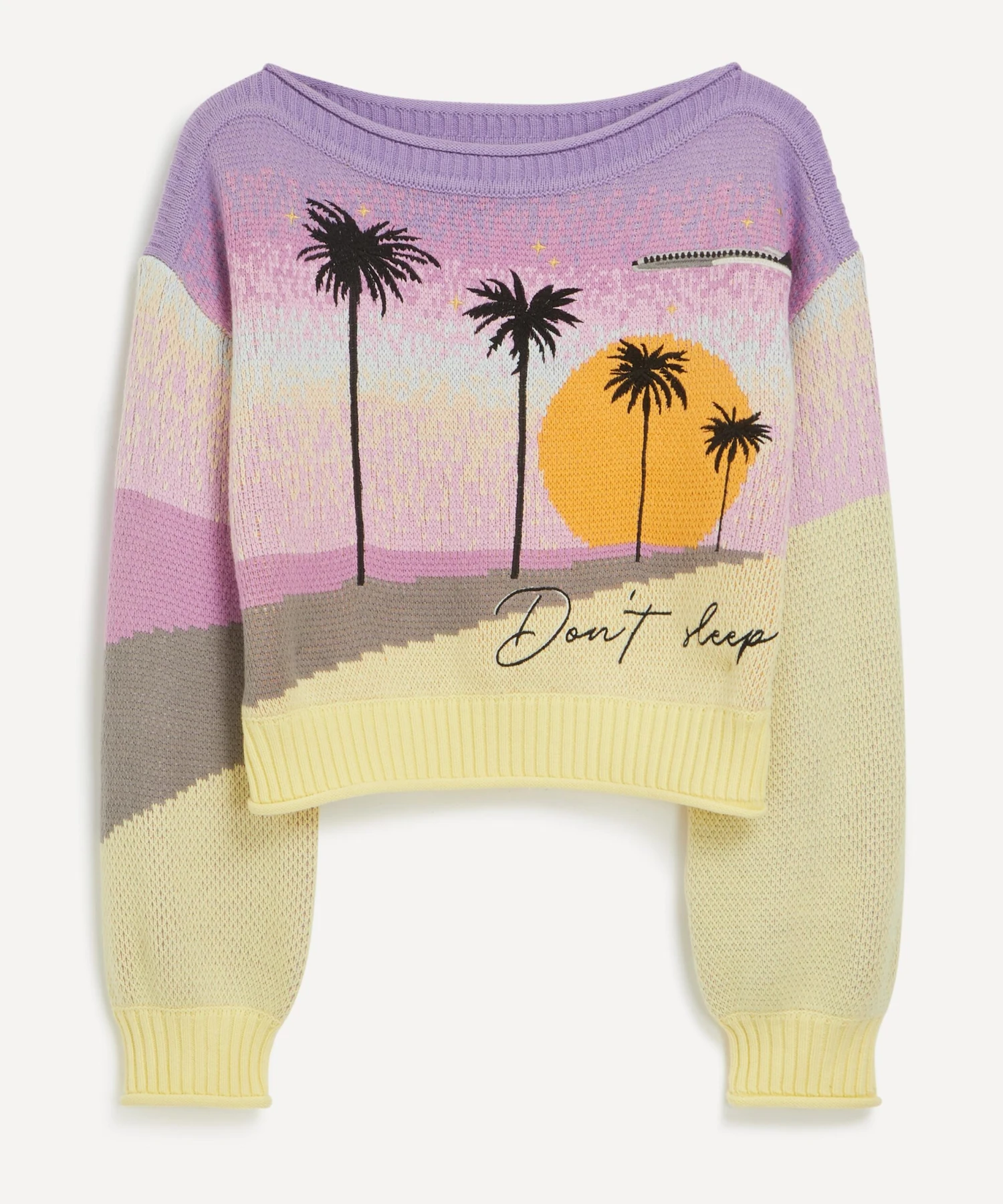 Showcasing a beachy, gradient sunset design with ‘Don’t’ Sleep’ embroidery adorned across its front, this slouchy knit is crafted from the brand’s signature, super-soft vegan yarn for a relaxed fit with dropped shoulders, balloon sleeves and a wide neckline.