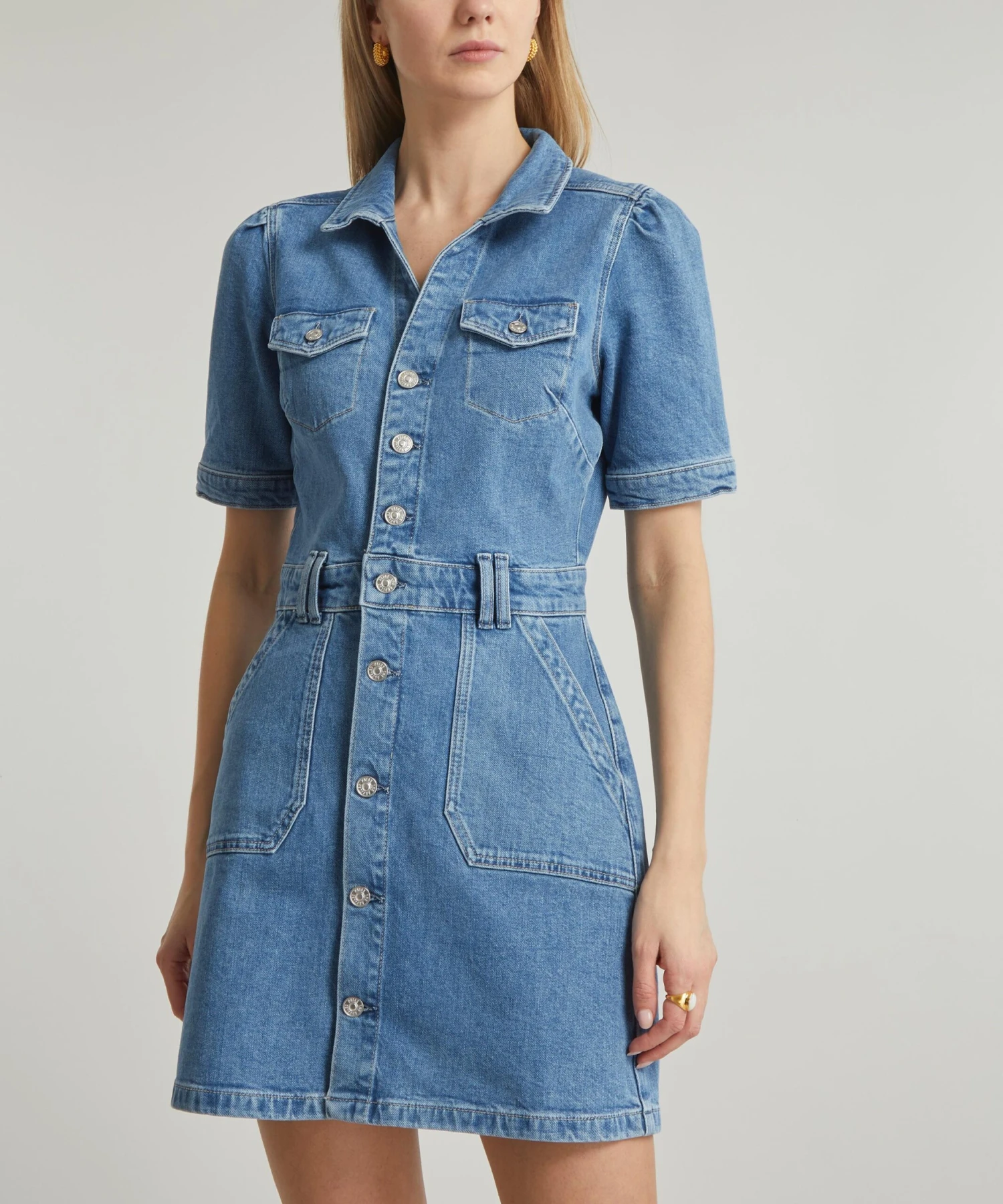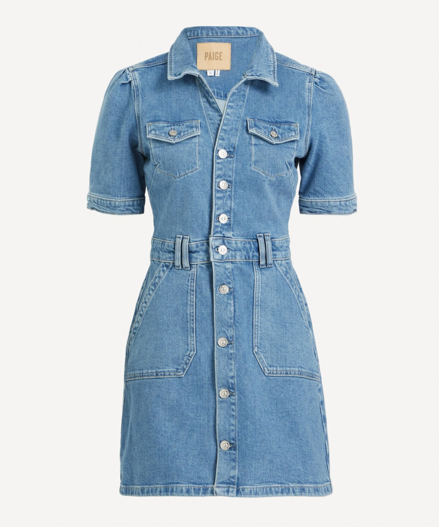 Elevate your denim edit with easy, everyday Mayslie mini-dress from cult denim brand, Paige. Crafted from cotton-stretch denim for ultimate ease and comfort, this playfully short button-down dress features patch-pockets, vintage silver hardware and a double belt-loop at the waistband for an effortlessly cool, utilitarian finish.